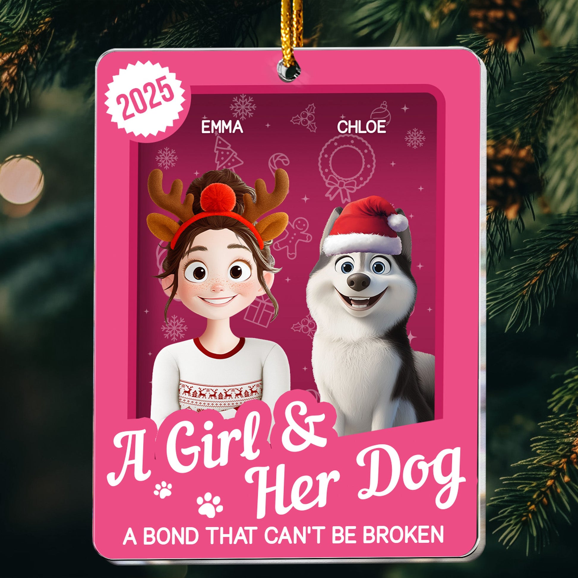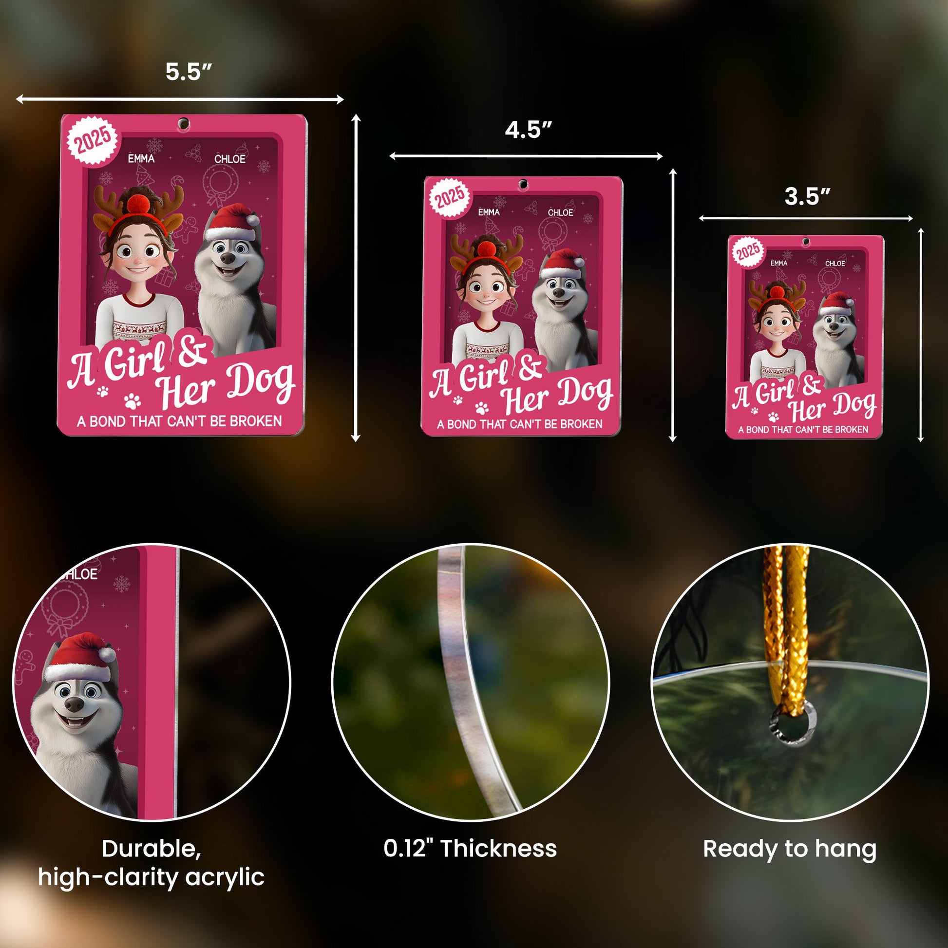 Delight the dog lover in your life with our Custom Shaped Acrylic Ornament. Perfect for pet enthusiasts, this personalized 'Dog Mom Toy Box' captures the special bond between owner and pet. This unique piece is more than a decoration; it's a loving representation of the recipient's love for their furry family members. The thoughtfully designed ornament features special messages like "A Girl & Her Dog - A Bond That Can't Be Broken" or "A Man & His Dog - A Bond That Can't Be Broken " subtly etched, making it the perfect keepsake. Ideal for Christmas, anniversaries, birthdays, or just because it’s Tuesday - this ornament is sure to bring a smile to any dog lover's face.