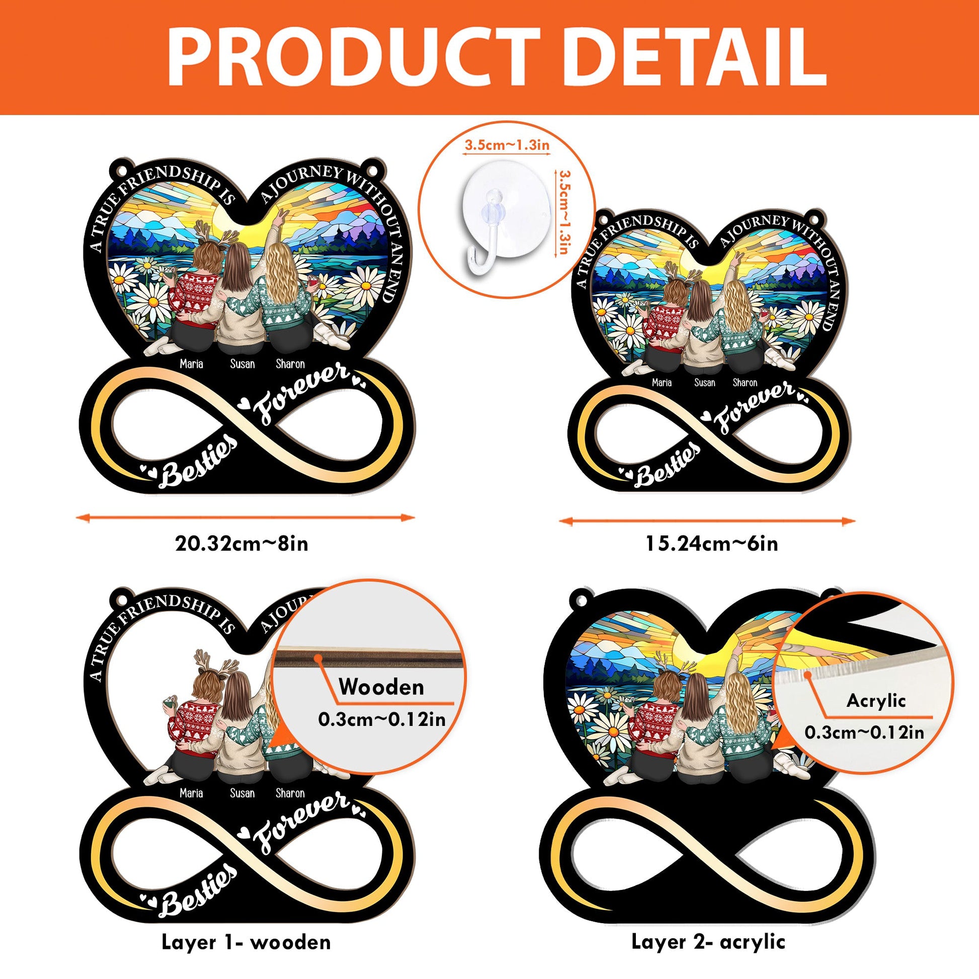The "A True Friendship Is A Journey Without An End" Personalized Window Hanging Suncatcher Ornament is a beautiful way to celebrate the special bond between best friends. This custom suncatcher can be personalized with a unique appearance, making it a heartfelt and meaningful friendship gift. As sunlight pours through the vibrant ornament, it creates a dazzling display, symbolizing the bright and enduring nature of your friendship.