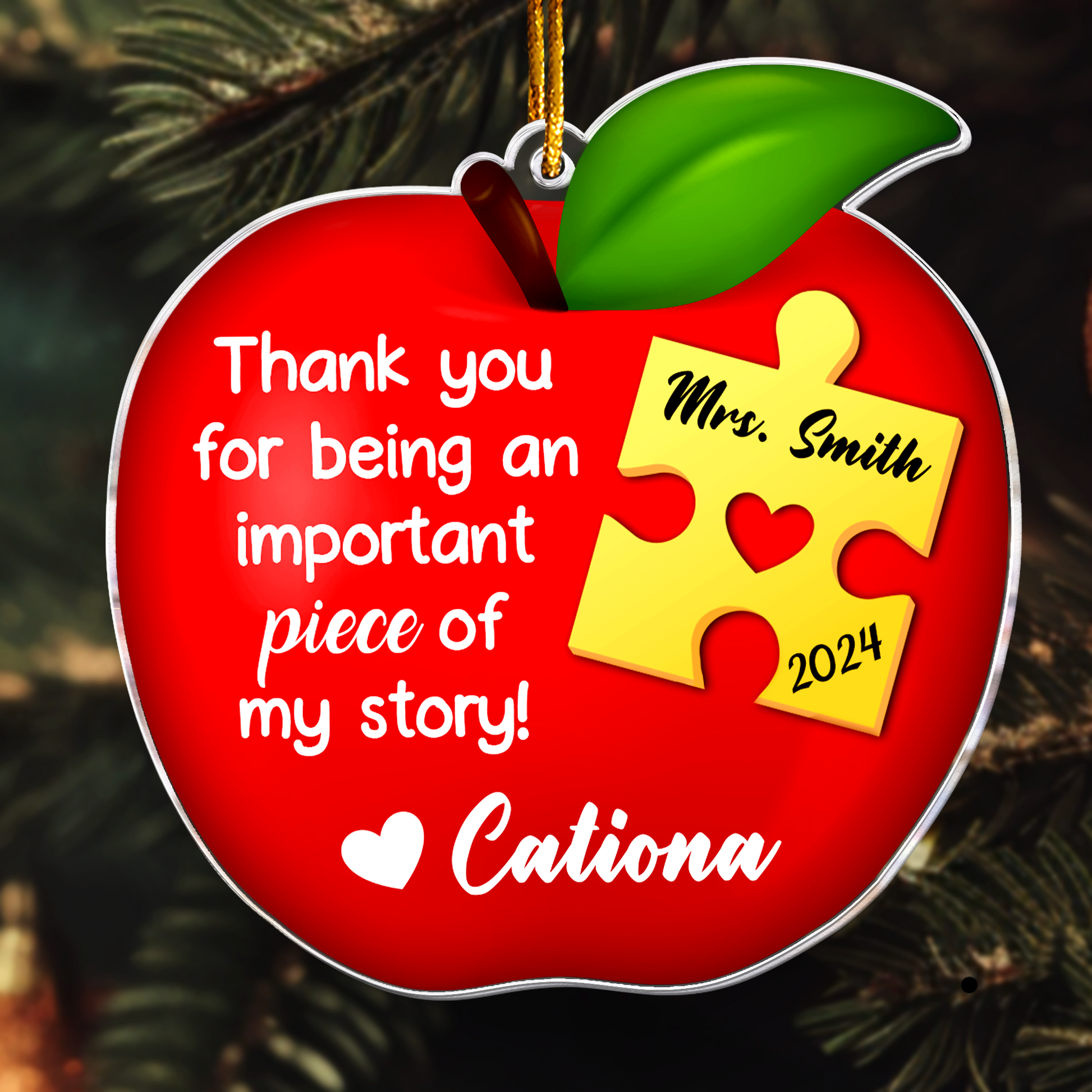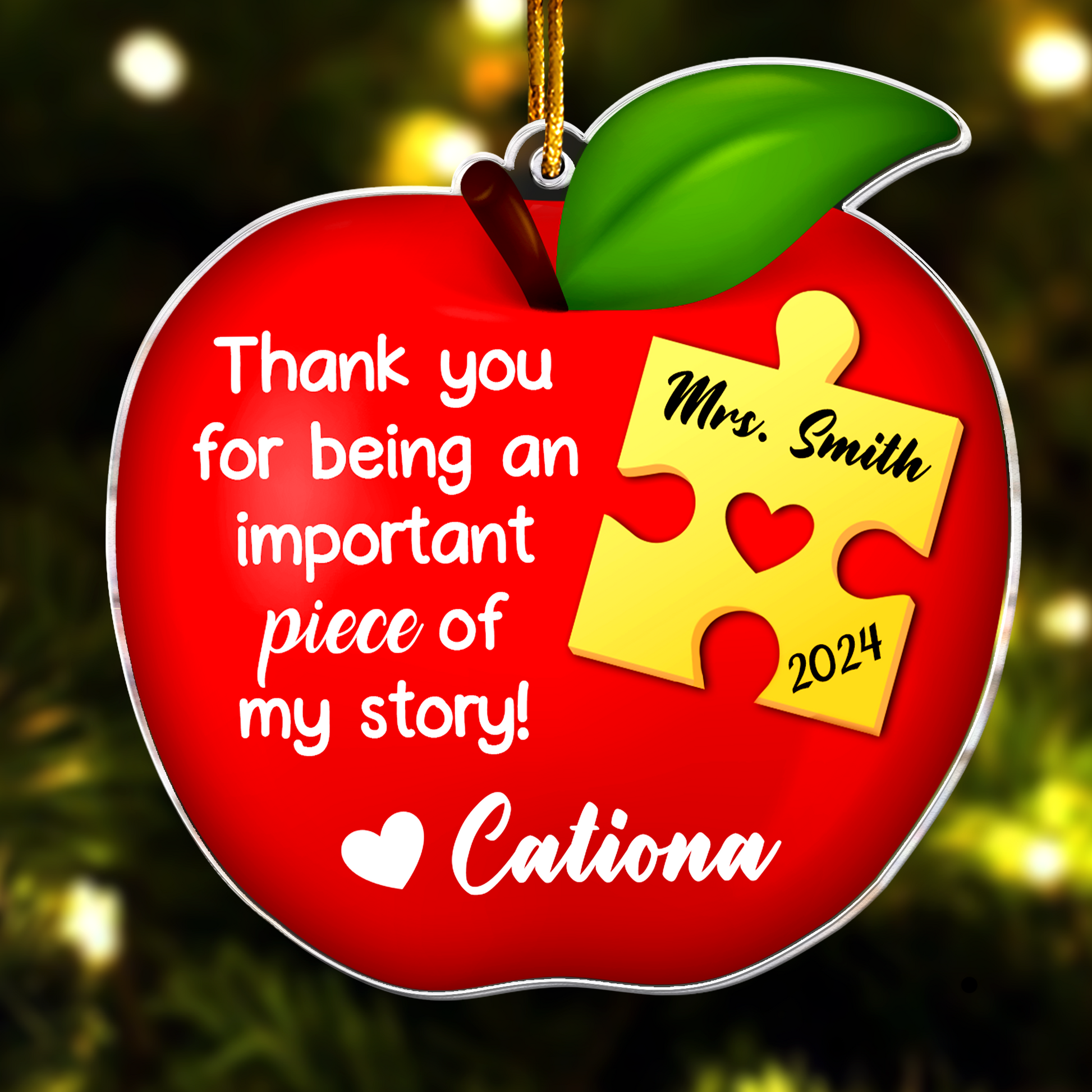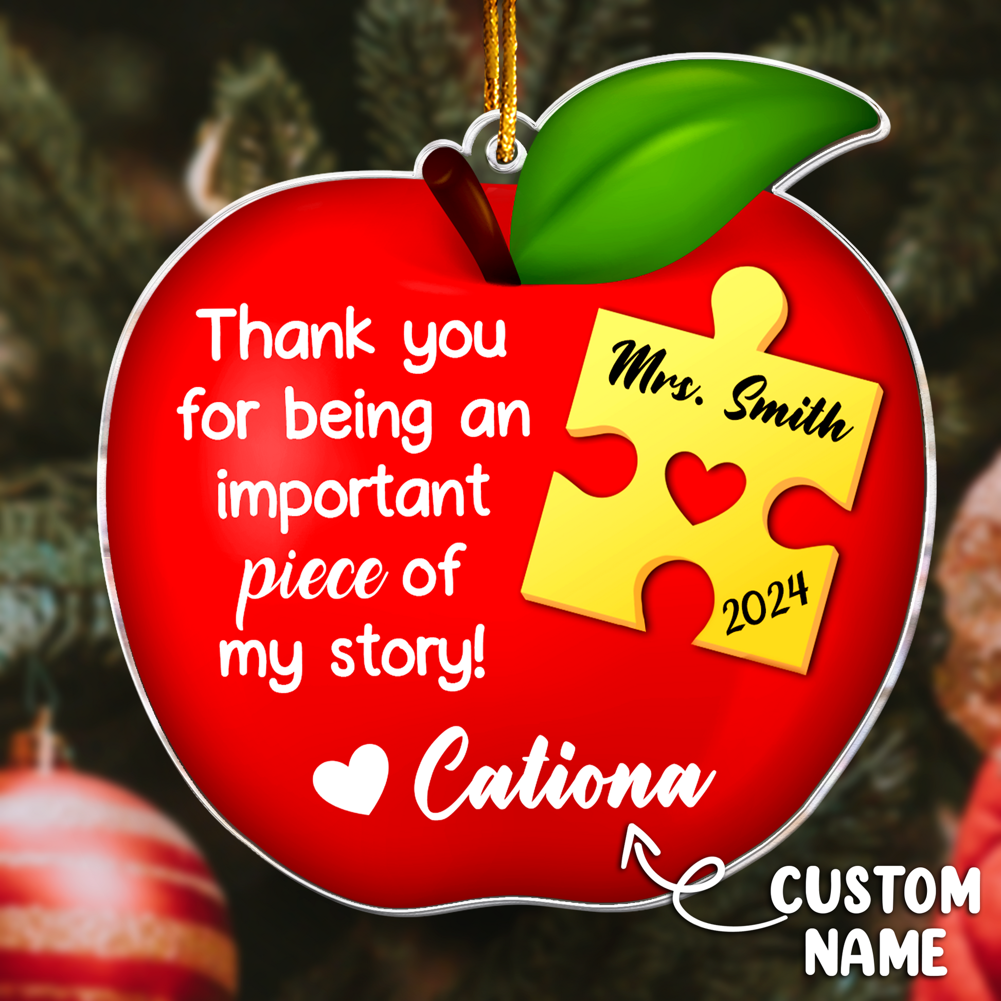 The Apple Teacher Christmas Ornament - Thank You Gift - Personalized Acrylic Ornament is a personalized acrylic ornament with a distinctive 3D-style design, combining an apple shape and puzzle piece pattern to honor the impact teachers make every day. Ideal as a thank-you gift, this ornament adds a warm, meaningful touch to any Christmas décor. Customized with the teacher's name or a special message, it celebrates their dedication and influence. Perfect for expressing gratitude during the holiday season, this ornament is a thoughtful keepsake that teachers will treasure for years to come.