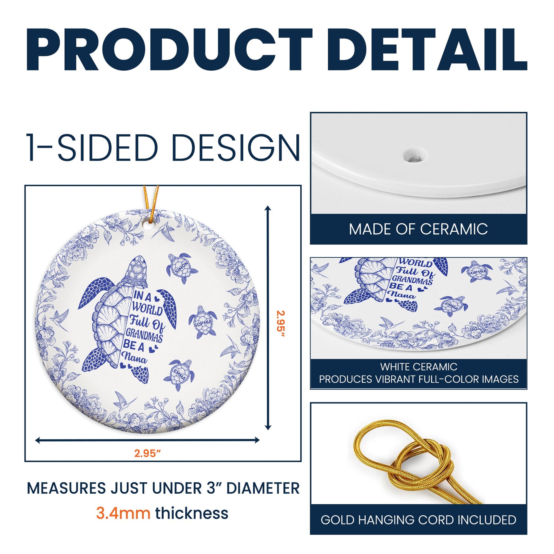 Our Be A Nana Turtle Version Toile De Jouy is a delightful Ceramic Ornament specially designed for every unique and special nana. In a world full of grandmas, this ornament serves as a loving reminder of the bond and connection that your nana shares with her family. Perfect as a Christmas ornament, it will add a touch of love and sentiment each holiday season and can also serve as a remarkable keepsake for years to come.