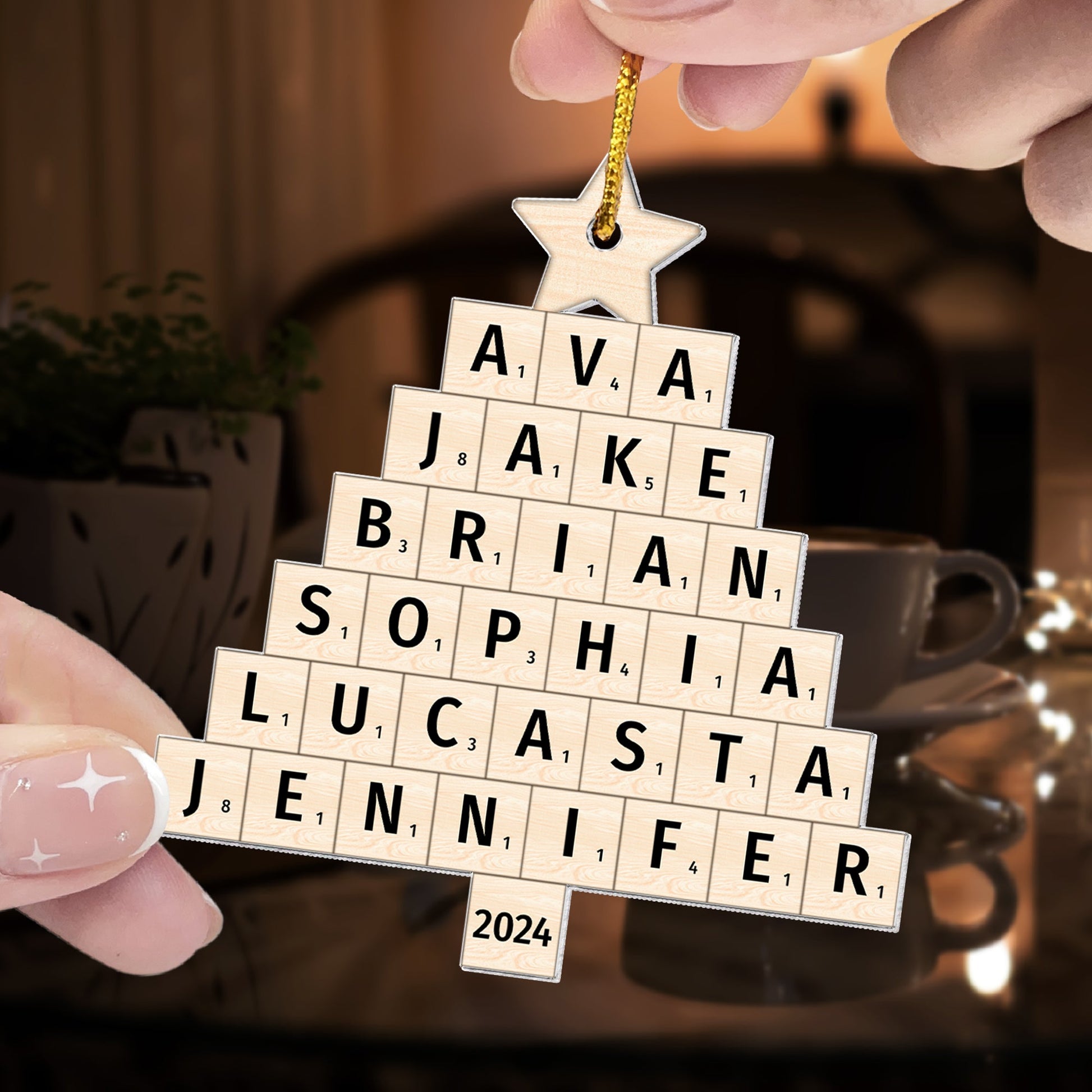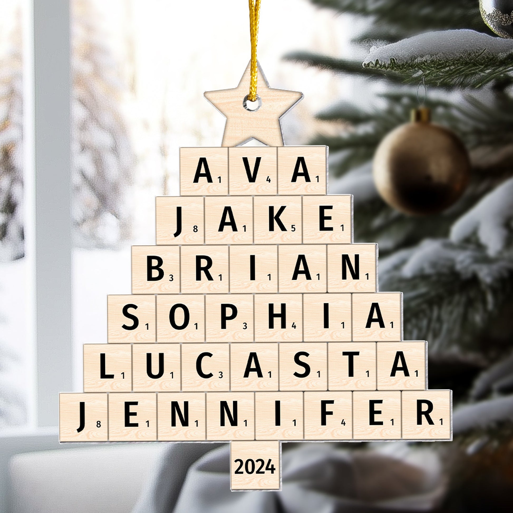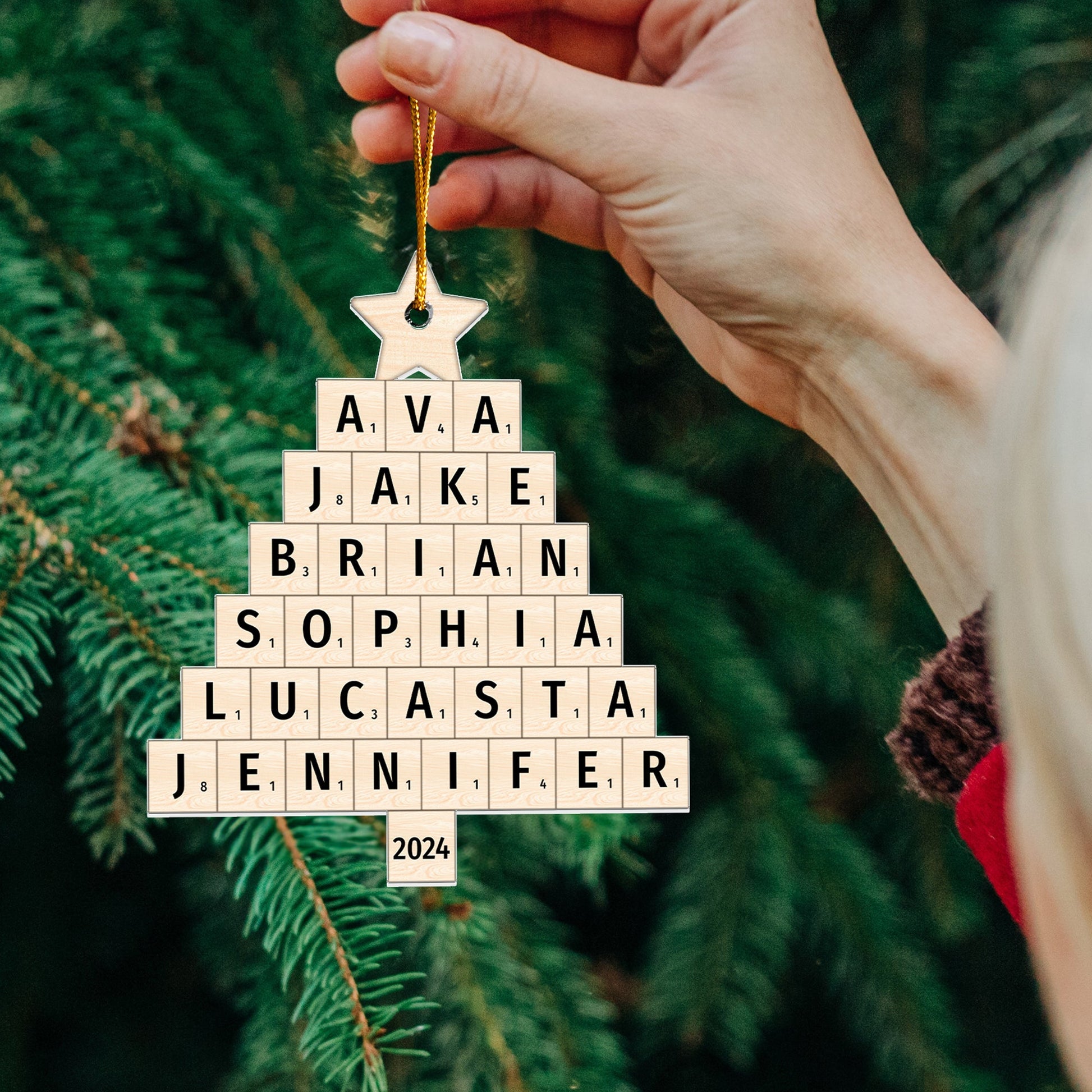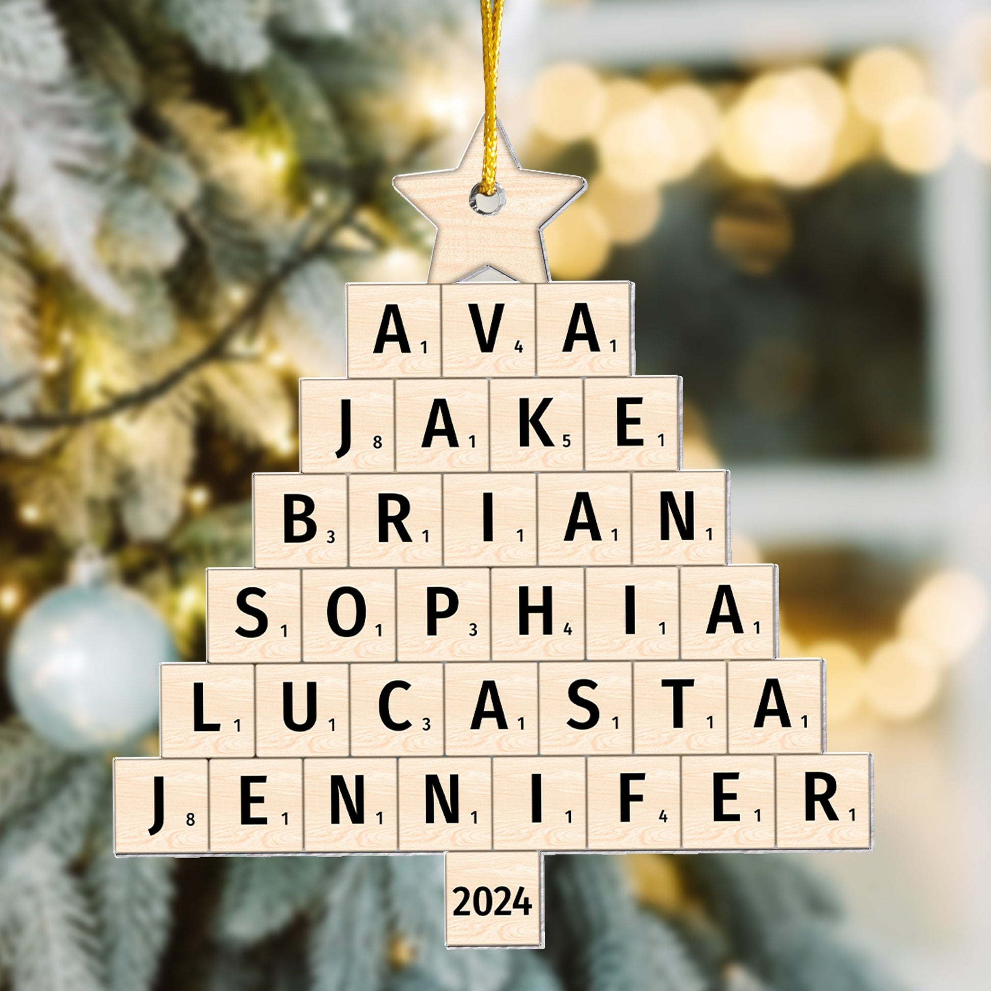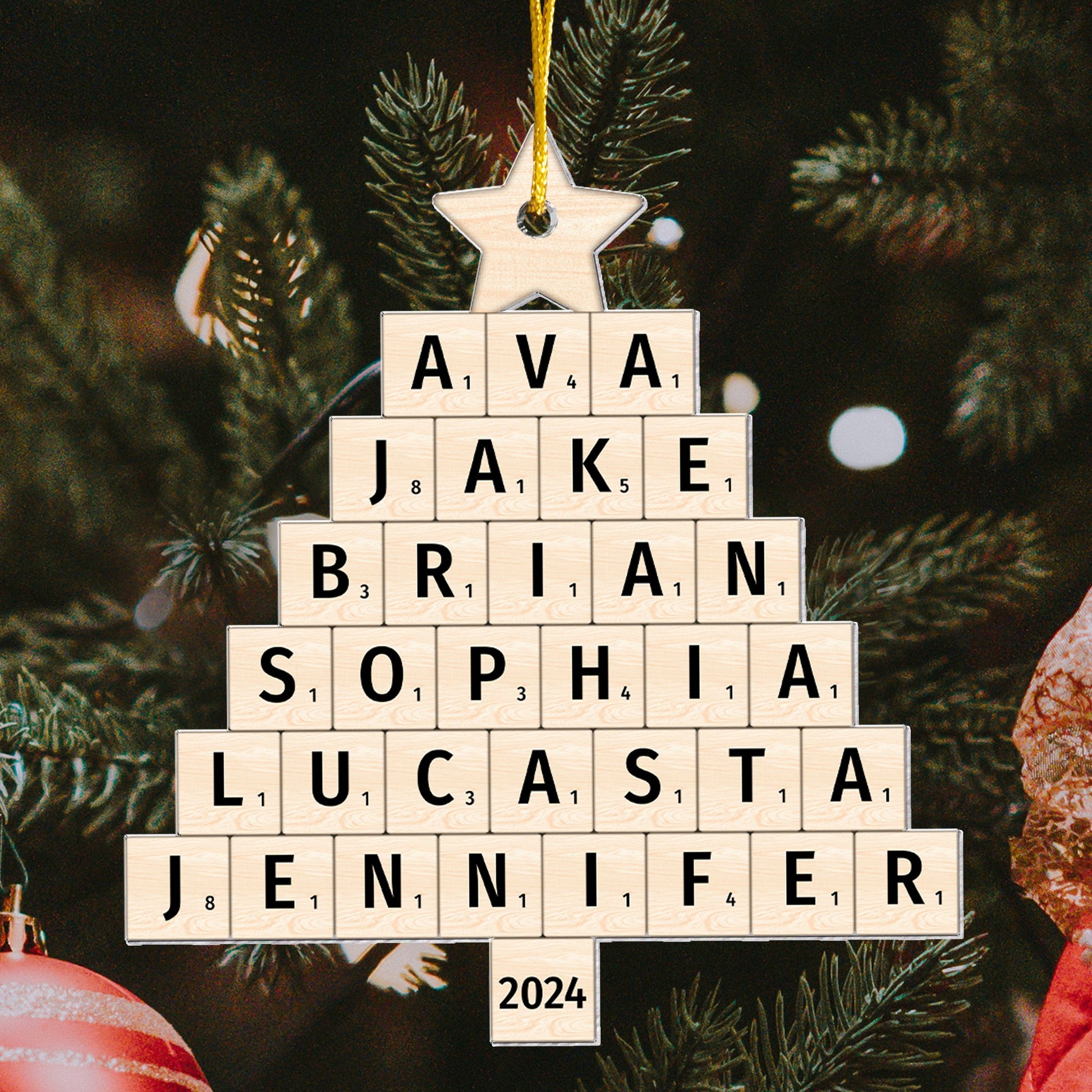 Celebrate the magic of family with our Personalized Custom Shaped Acrylic Ornament, designed in a unique Scrabble-style Christmas tree shape! Customize this ornament with your family members' names, creating a heartfelt and personalized decoration that adds warmth and love to your home. Whether it's for dad, mom, grandparents, siblings, or sisters, this ornament is the perfect way to showcase your family’s bond during the holiday season.