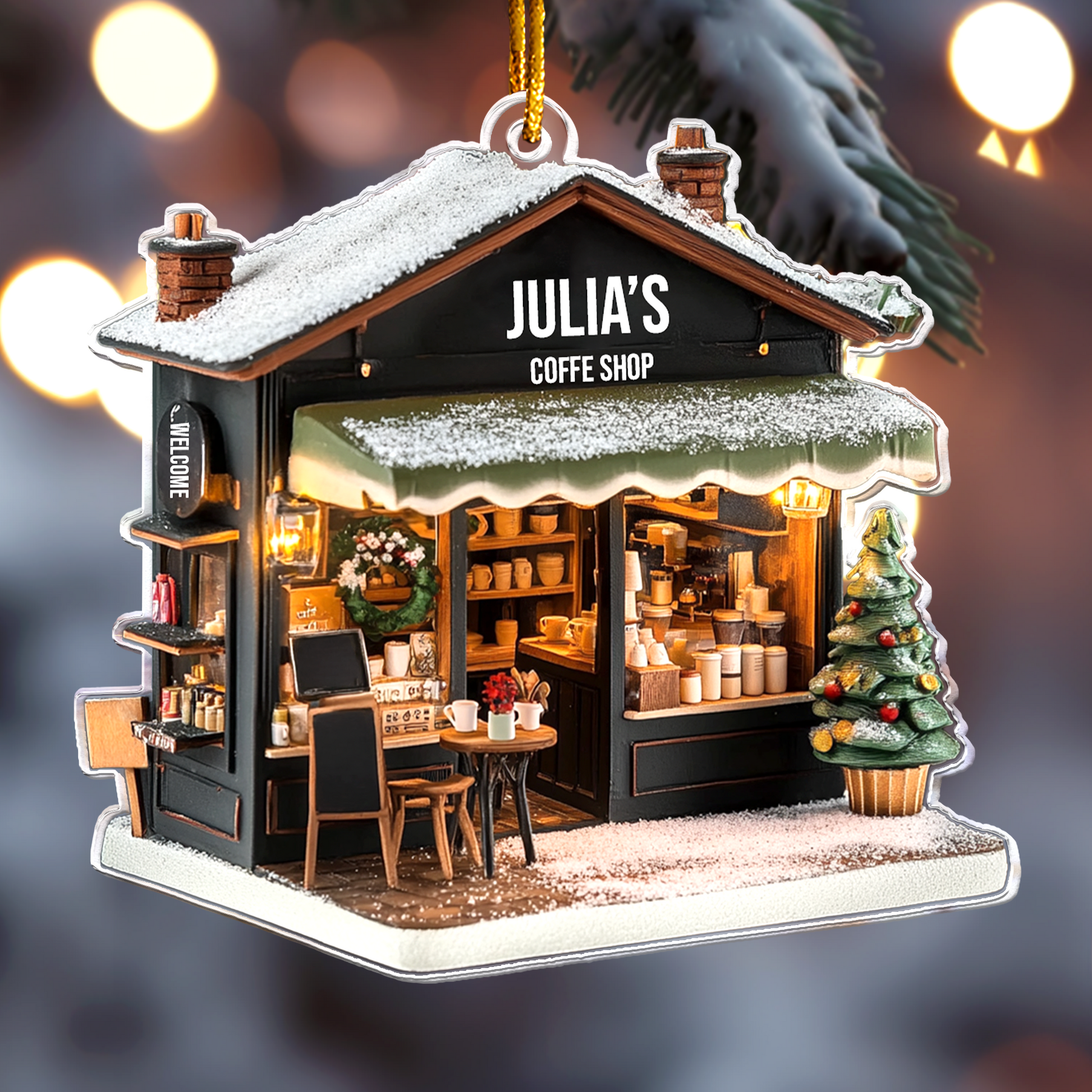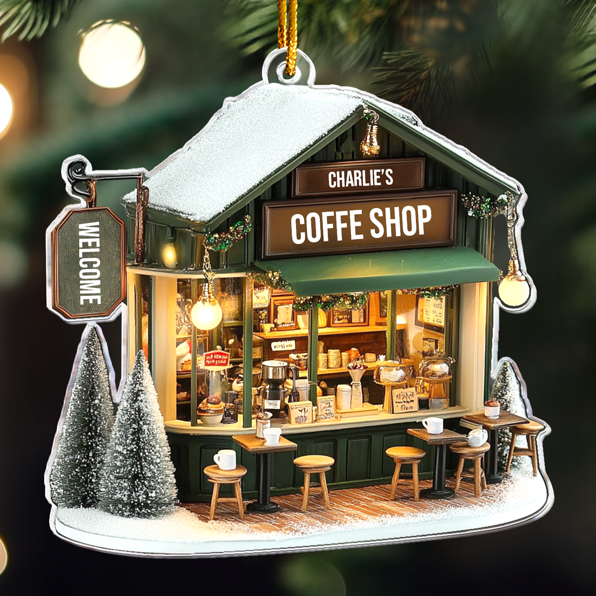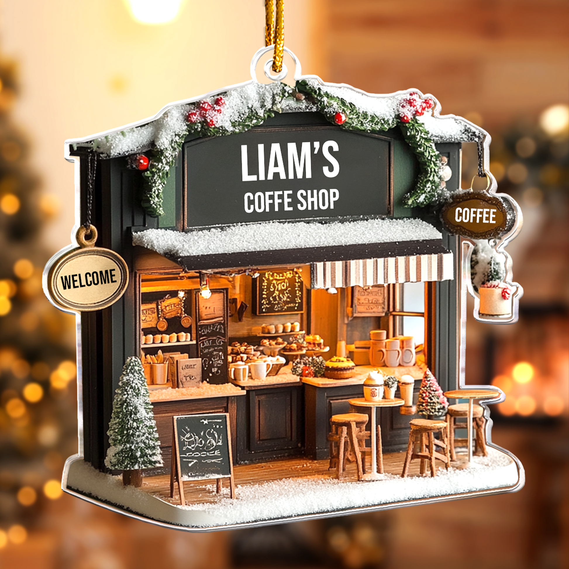 The Coffee Shop Ornament, Coffee Bar, Coffee Store Christmas Ornament - Personalized Acrylic Ornament is a perfect 2D flat decoration for coffee enthusiasts and shop owners alike! Designed as a delightful Christmas keepsake, this ornament celebrates the warmth and charm of coffee culture. Its flat (not 3D) design makes it lightweight and easy to hang, whether it's for a coffee bar at home or a bustling coffee store.