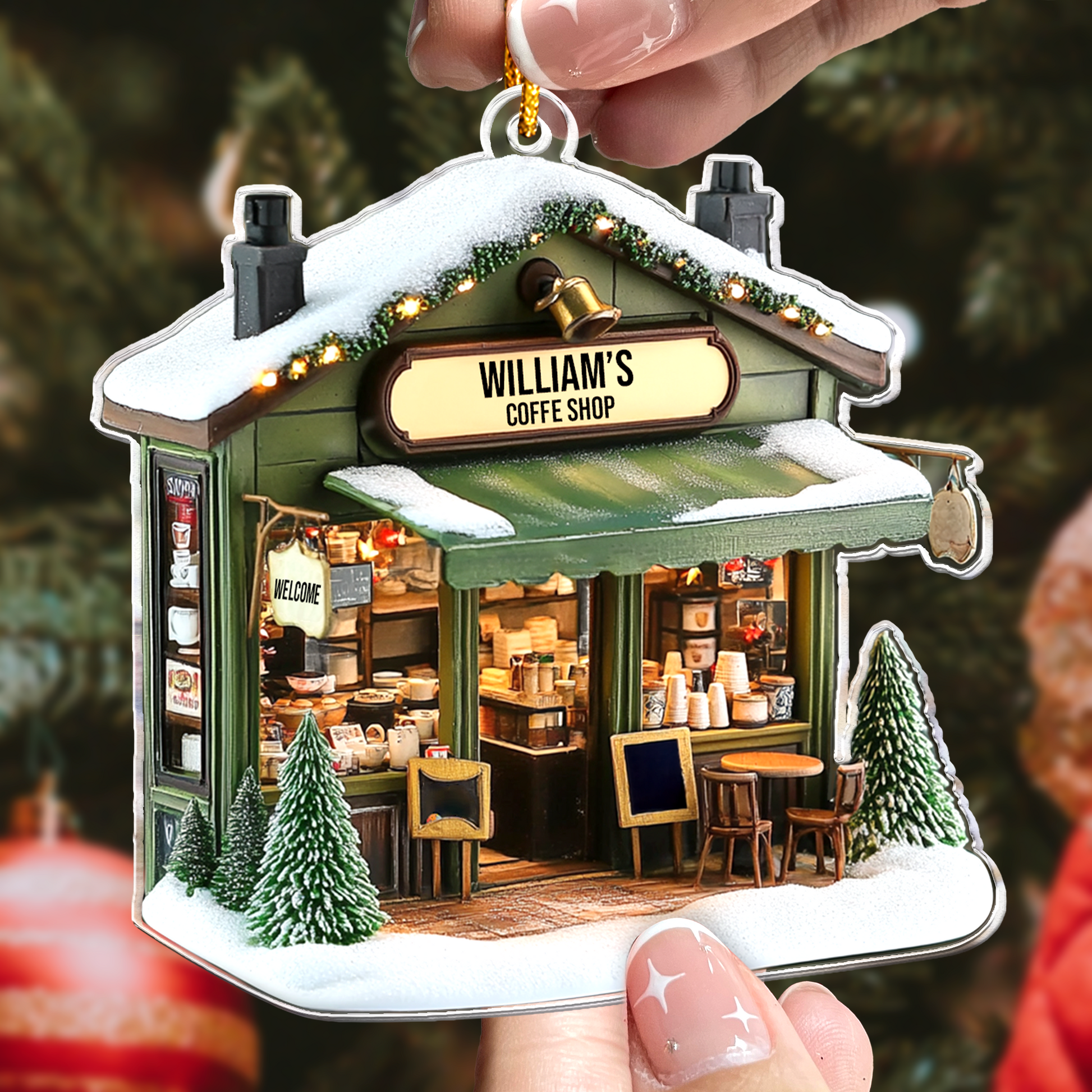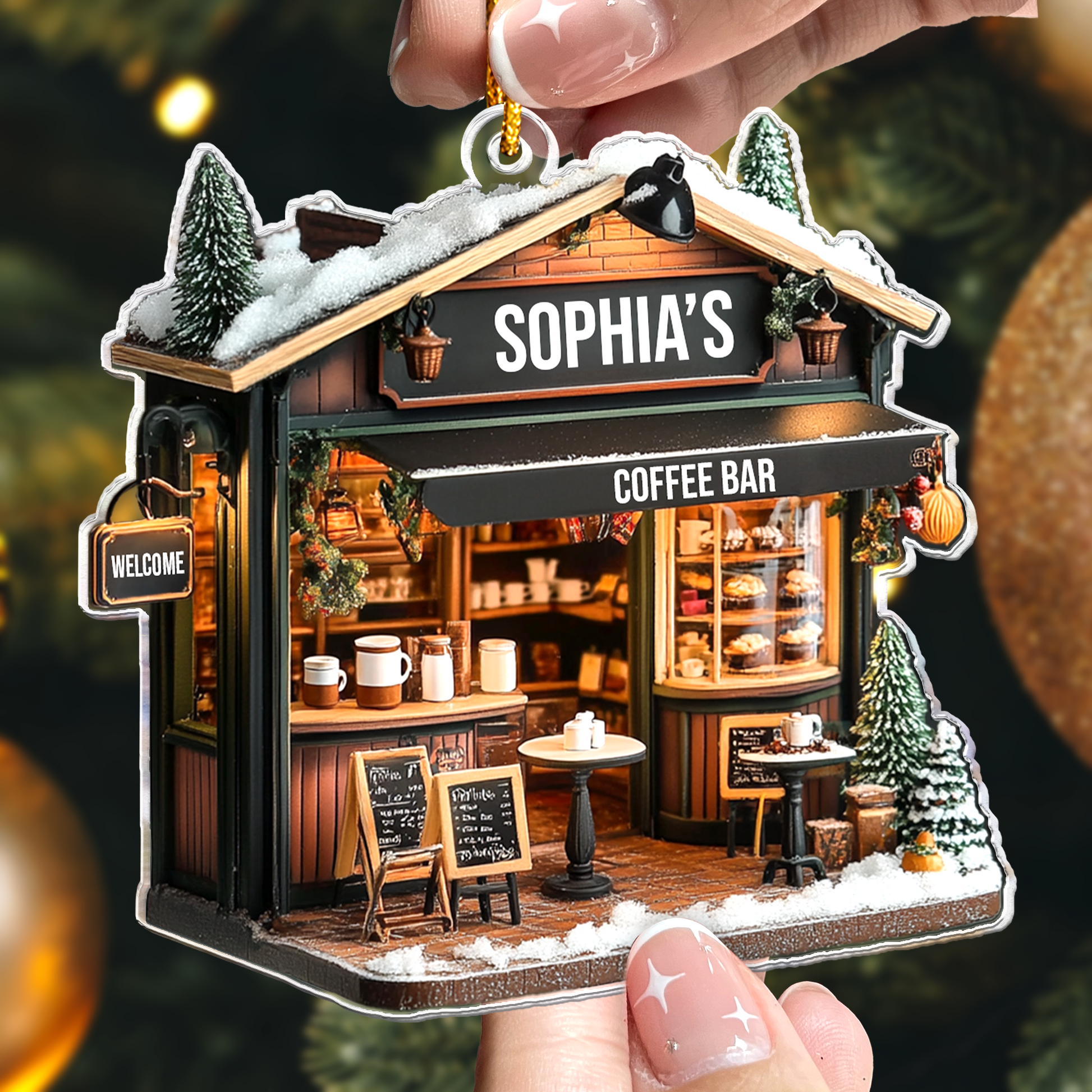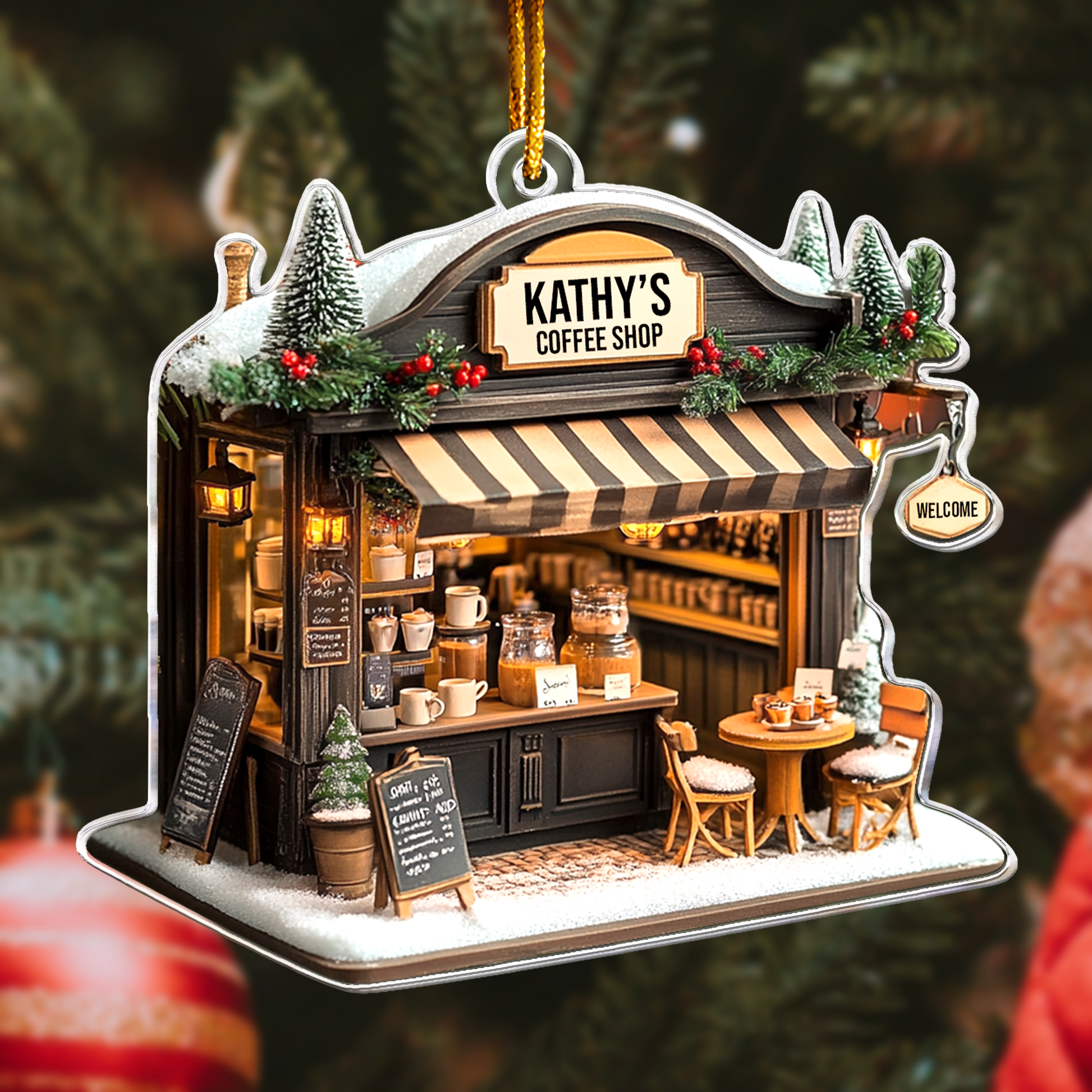 The Coffee Shop Ornament, Coffee Bar, Coffee Store Christmas Ornament - Personalized Acrylic Ornament is a perfect 2D flat decoration for coffee enthusiasts and shop owners alike! Designed as a delightful Christmas keepsake, this ornament celebrates the warmth and charm of coffee culture. Its flat (not 3D) design makes it lightweight and easy to hang, whether it's for a coffee bar at home or a bustling coffee store.