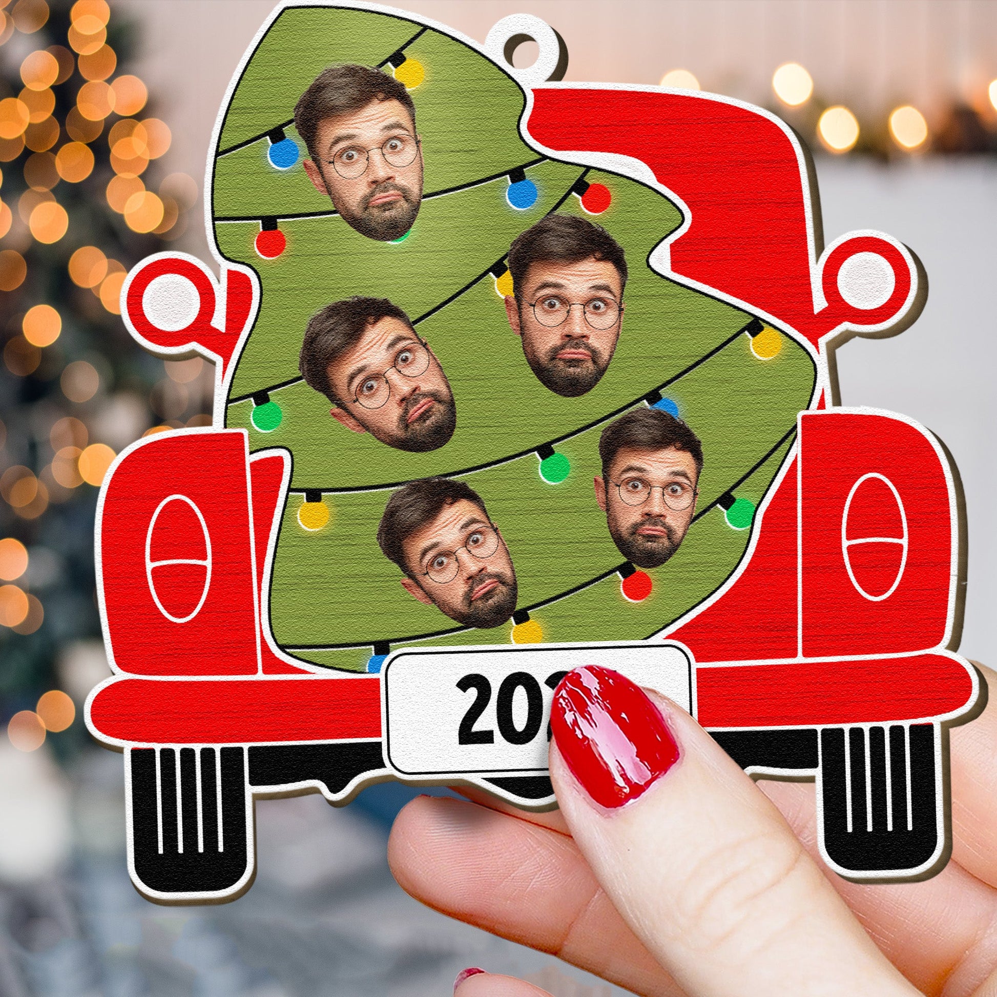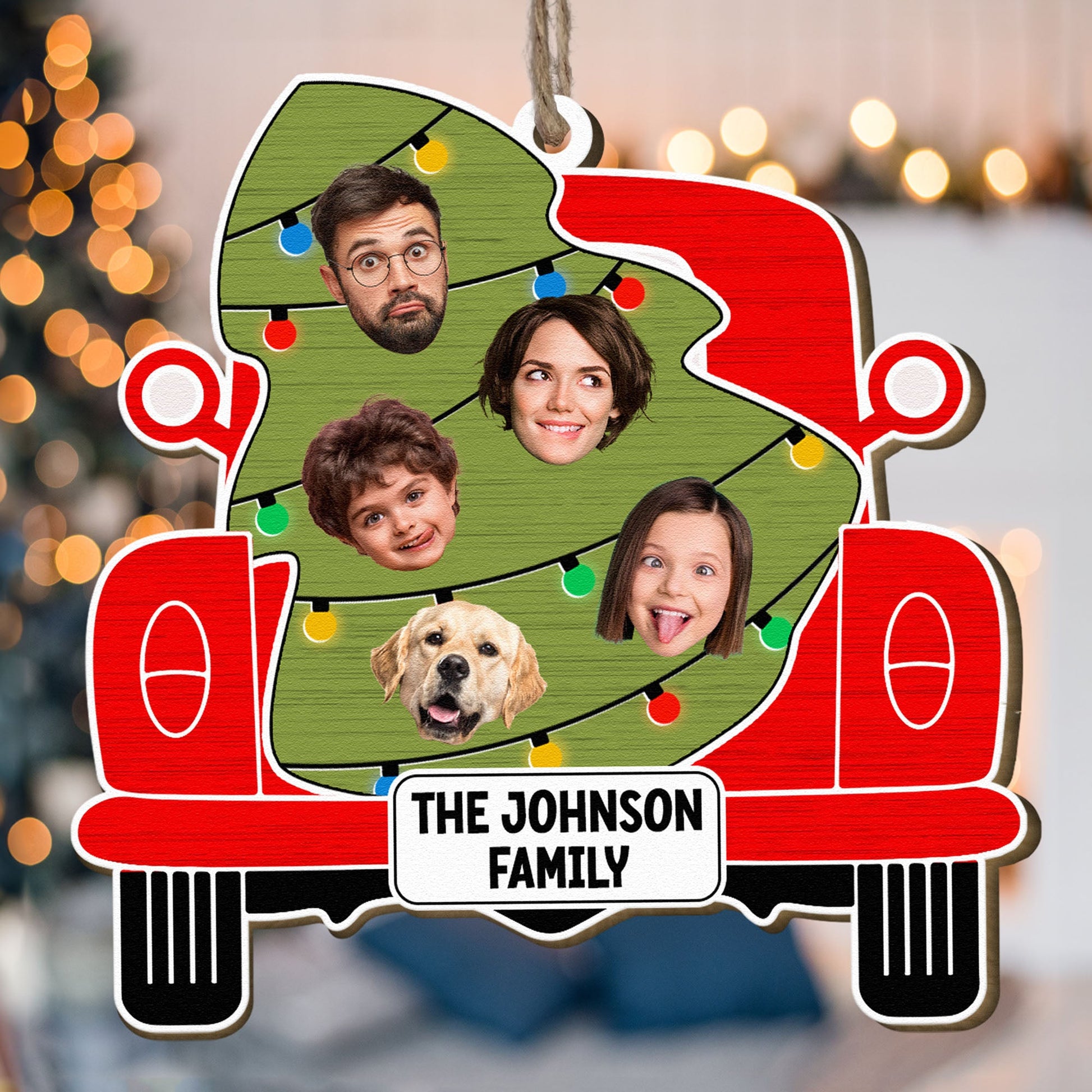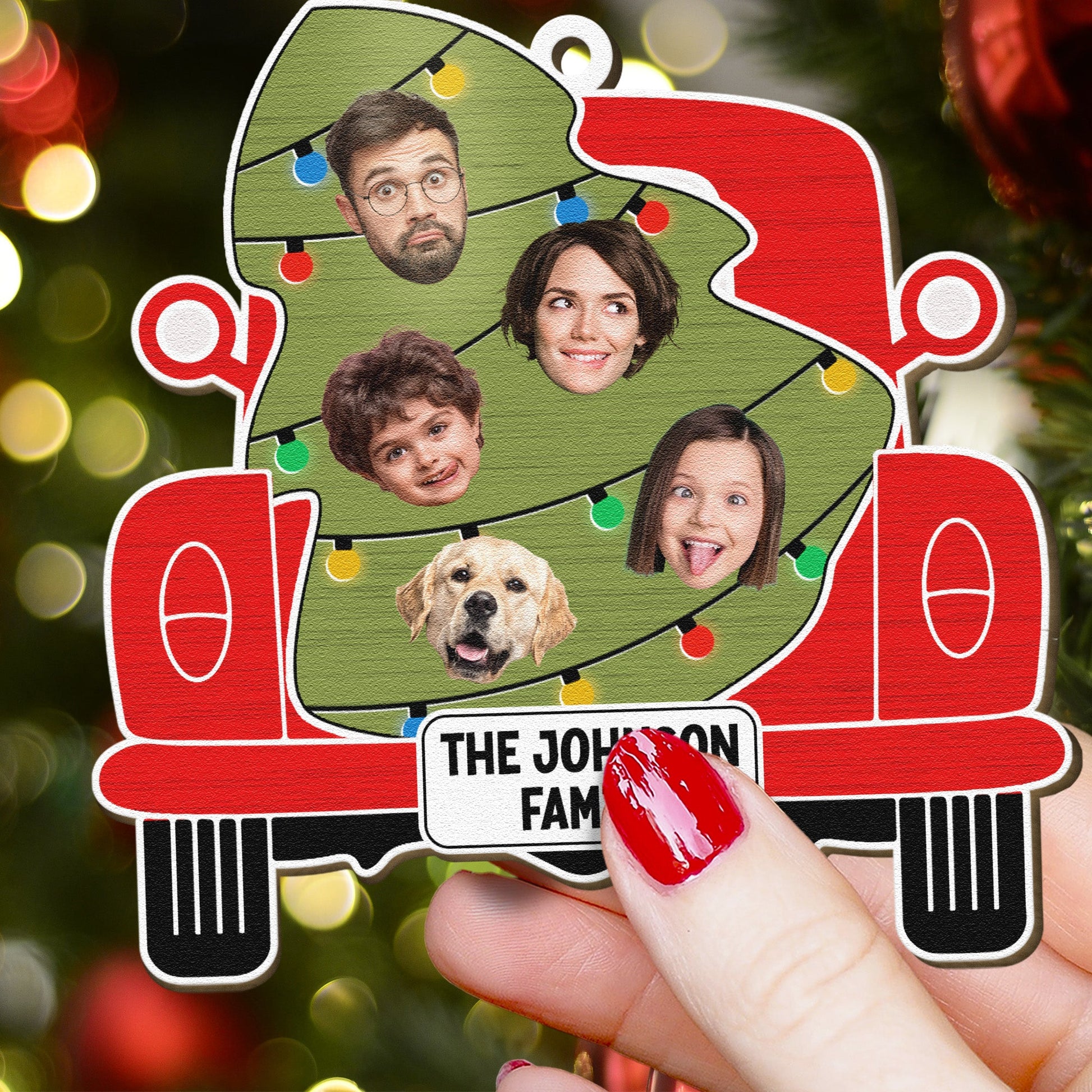 Custom Christmas Red Truck With Tree Family - Personalized Wooden Photo Ornament