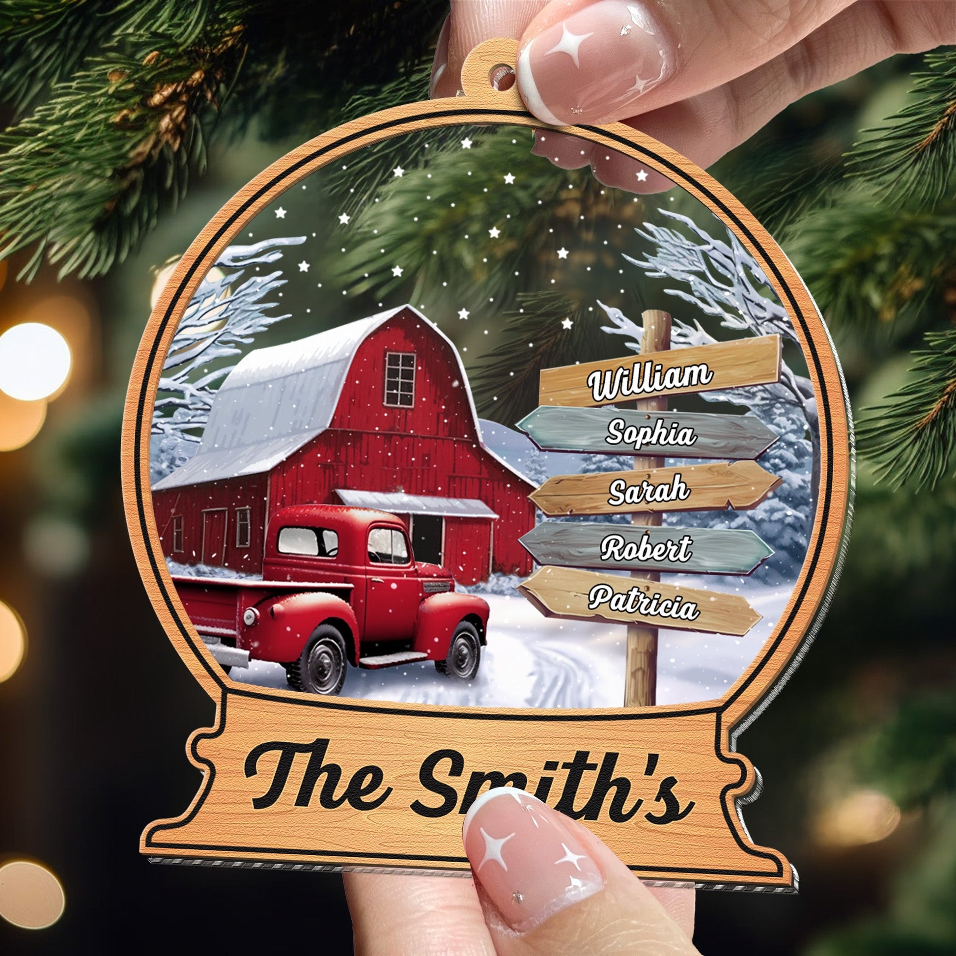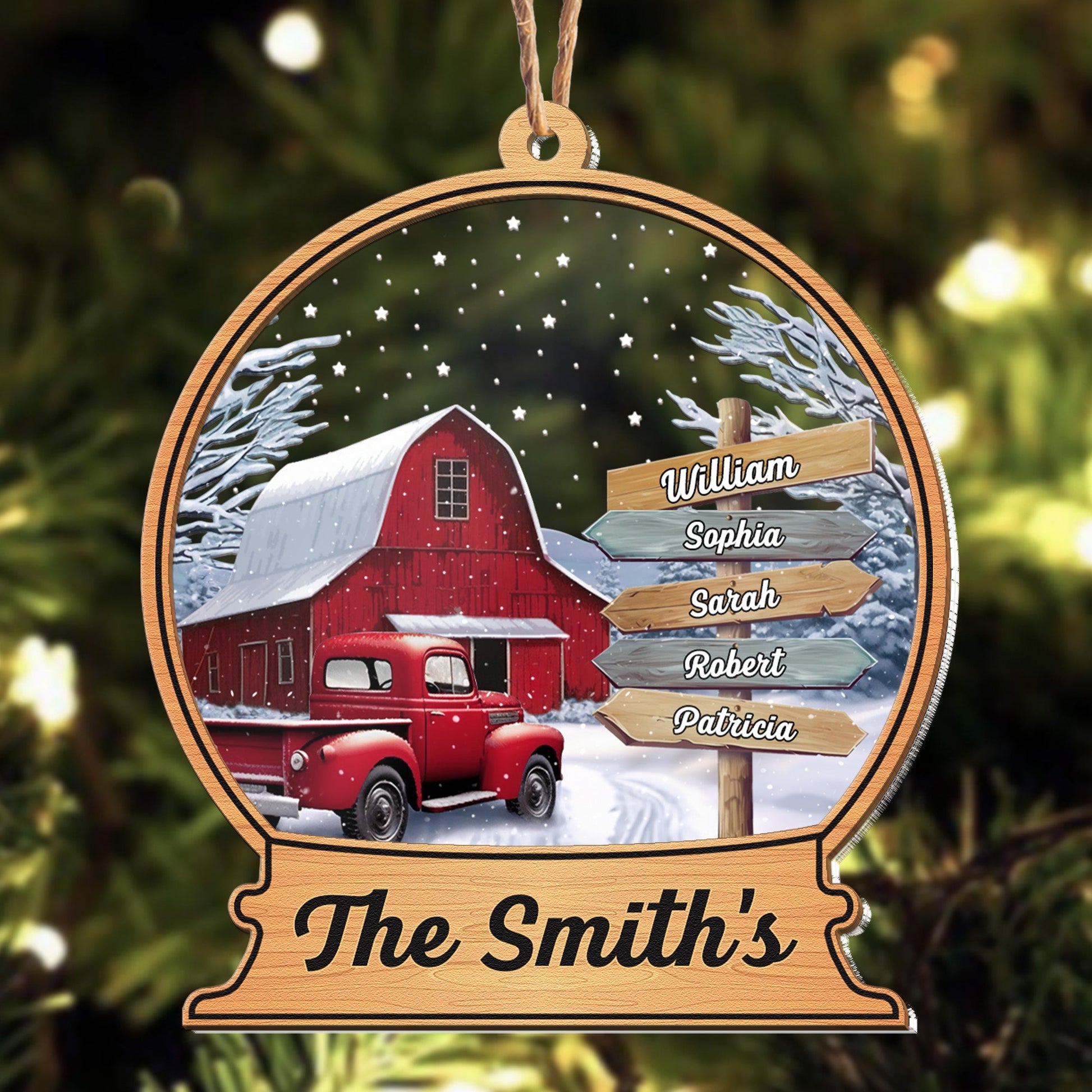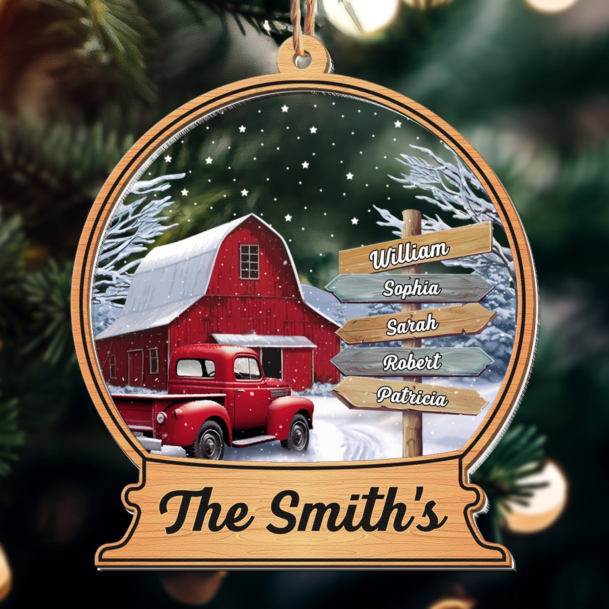 Custom Family Names Farmhouse Christmas - Personalized Wood And Acrylic Ornament With Bow