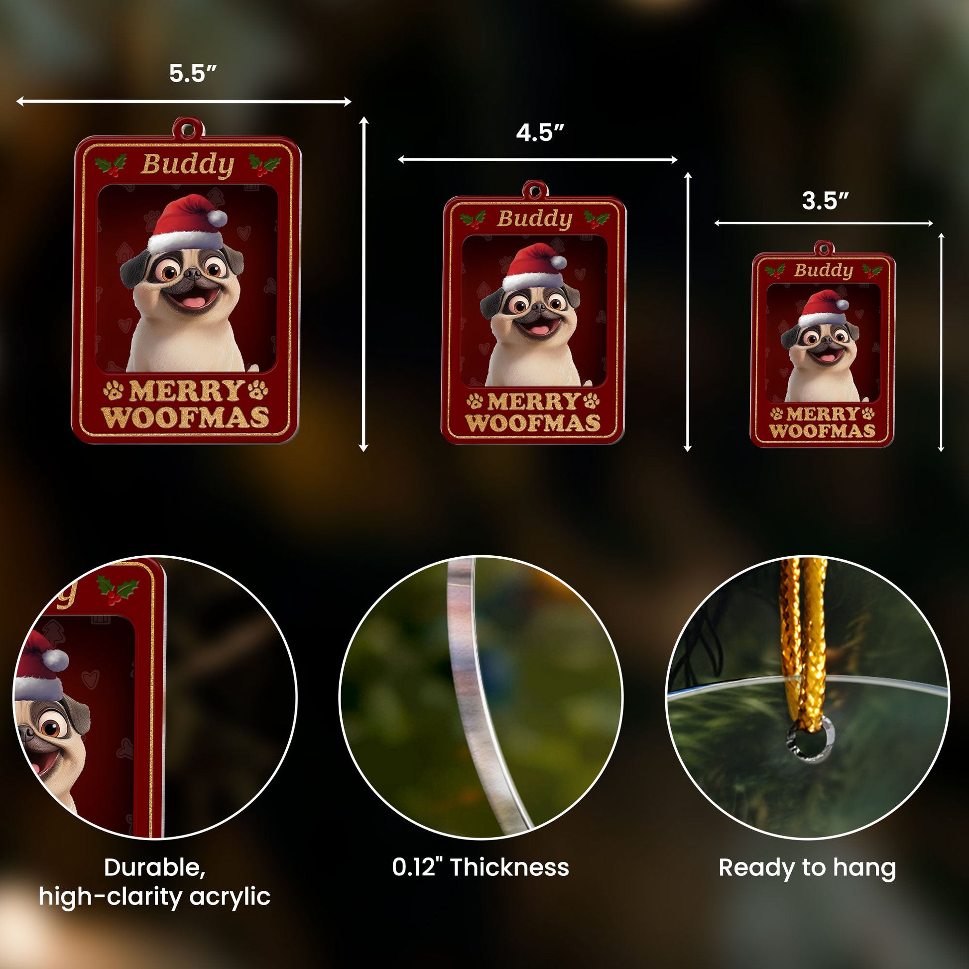 Introducing our Custom Shaped Acrylic Ornament, an adorable Dog Christmas Toy Box, personalized just for the canine friend in your family! Perfect for pet lovers, this delightful ornament is an ideal gift for celebrating the spirit of Christmas. It adds a festive touch to your home decor, fostering a loving bond with your furry buddy. The message, communicating a hearty 'Merry Woofmas,' enhances the holiday cheer and warmth of the season.