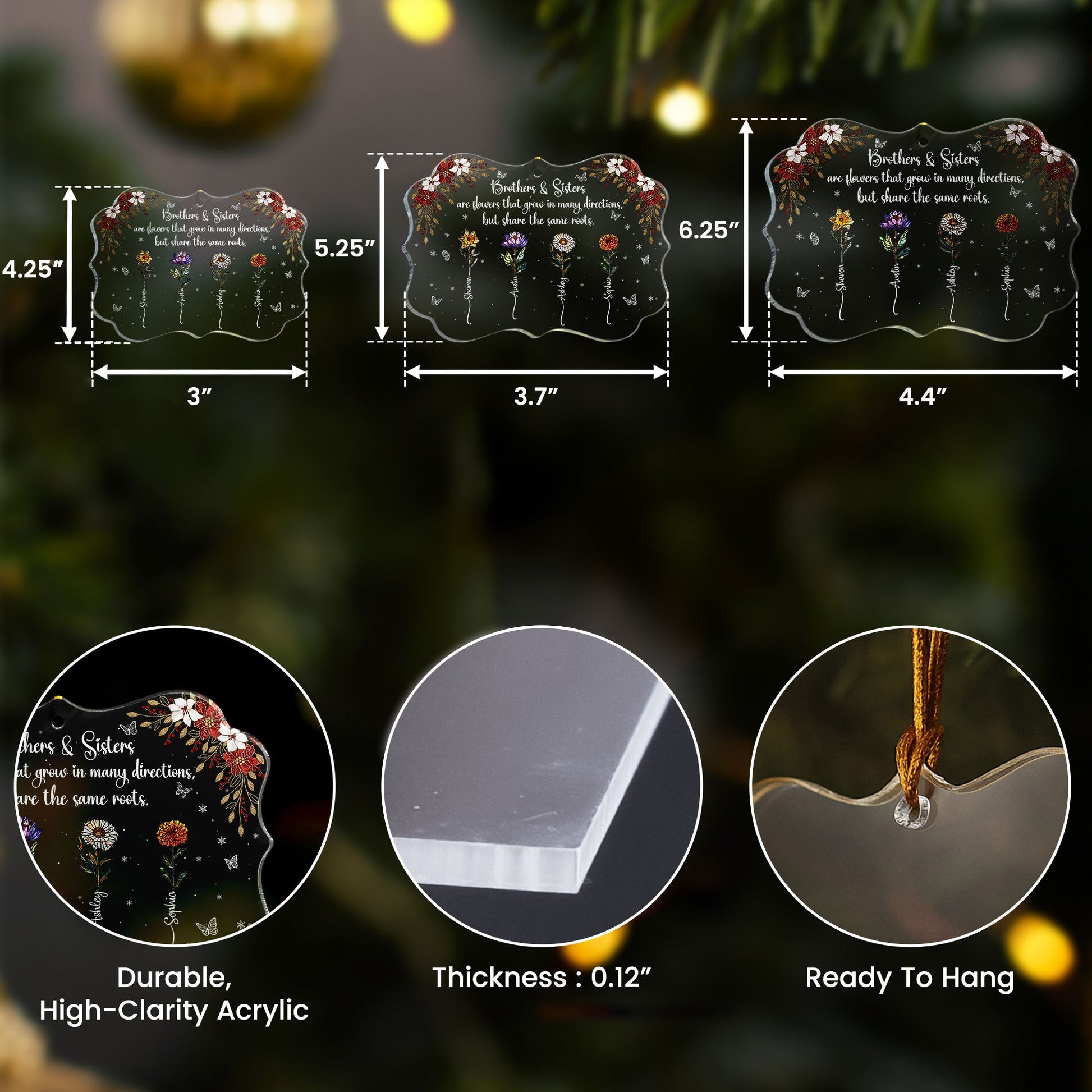 Celebrate the beauty of family bonding and resemblance with our Family Are Flowers That Share The Same Roots - Personalized Acrylic Ornament. This wonderful piece of art beautifully captures the notion of how, like flowers, family members bloom and grow in different directions, yet are united by the roots of love and care. Perfectly suited for siblings and family members, it serves as a reminder of the deep-rooted connections that hold a family together. It's perfect for all occasions, birthdays, Christmas, anniversaries, or any moment when you want to express your affection and solidarity.
