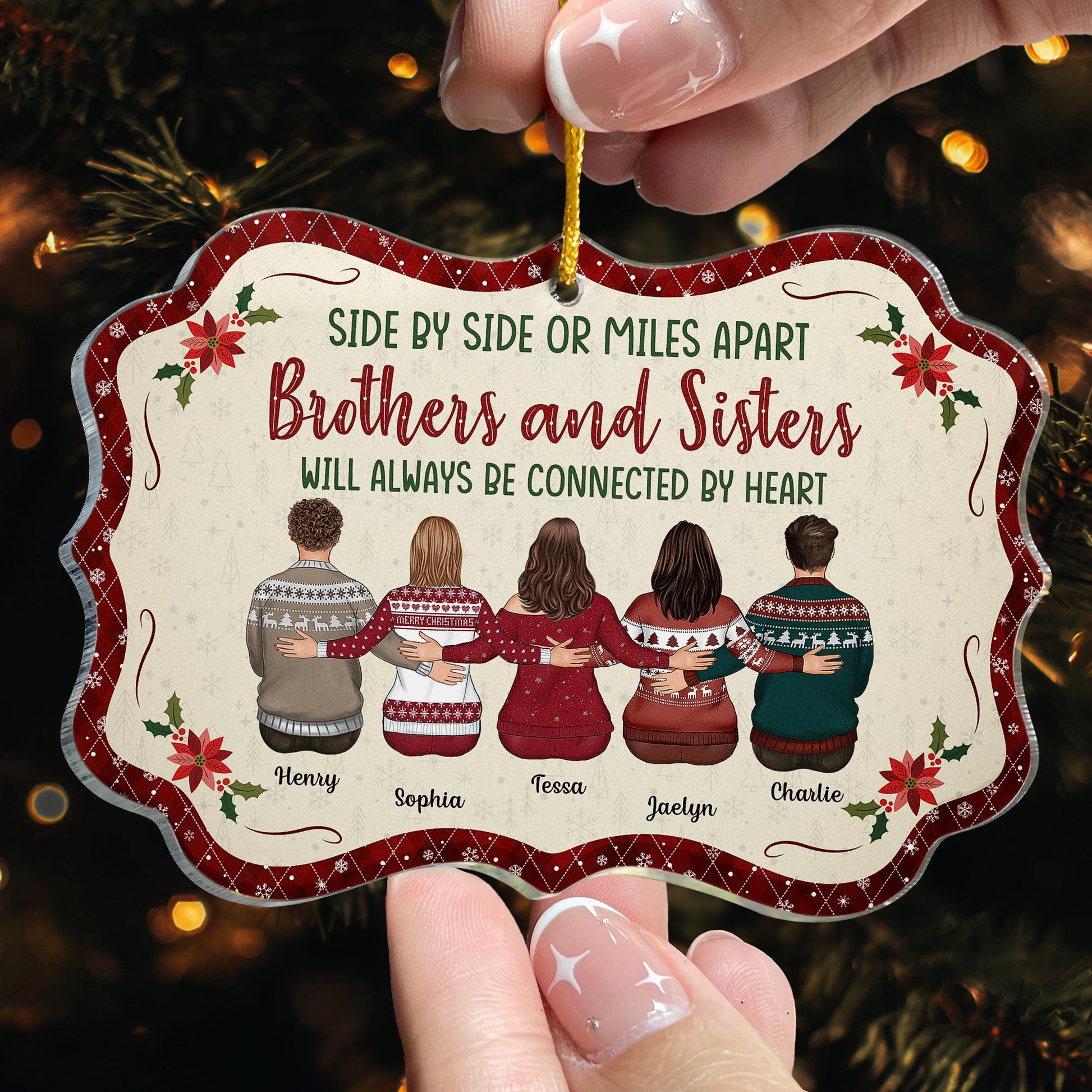 Celebrate family togetherness this holiday season with this personalized Christmas ornament, perfect for adorning any family’s festive home. Featuring a charming illustration of family members dressed in cozy holiday attire and personalized with each person's name and the family name, this ornament adds a personal touch to holiday decor. Crafted with seasonal details like poinsettias and snowflakes, it encapsulates the warmth and joy of Christmas gatherings.
