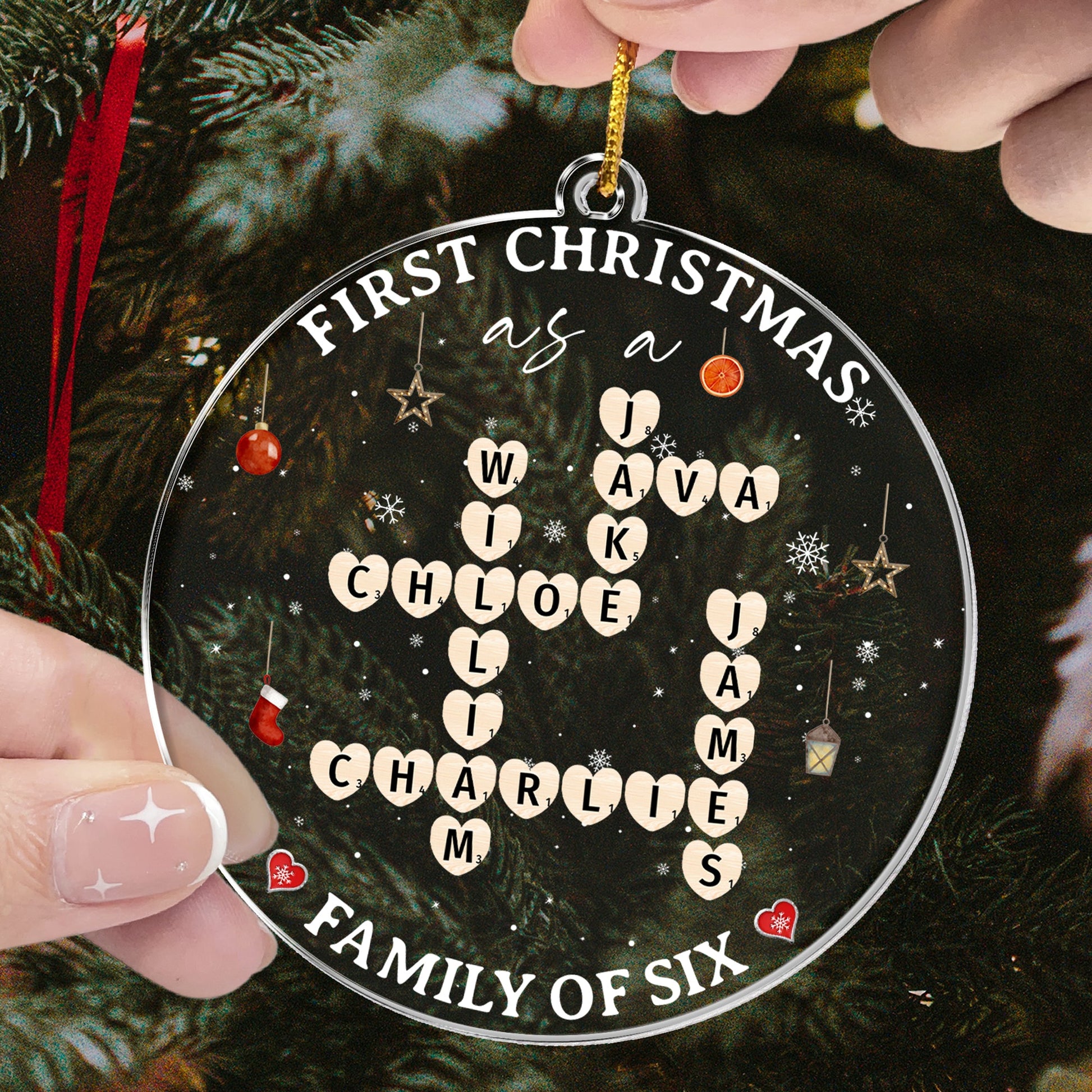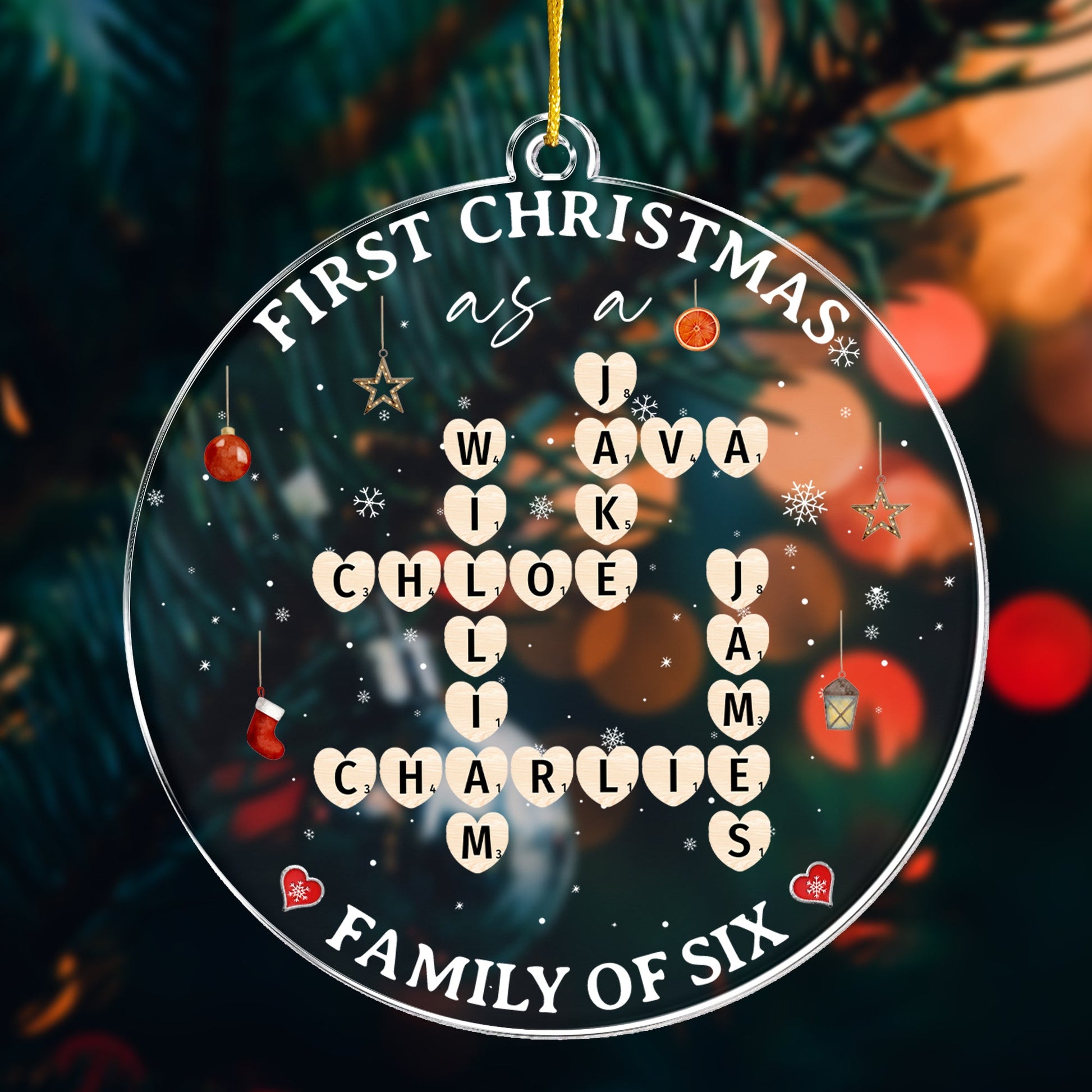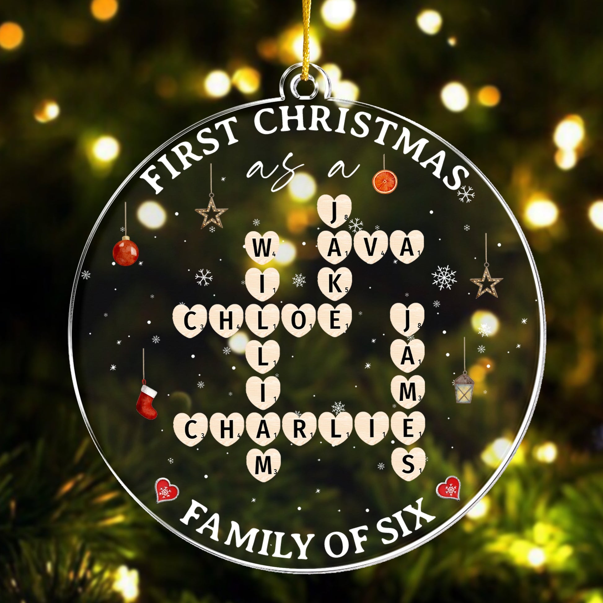 Celebrate a precious milestone with our Personalized Custom Shaped Acrylic Ornament, marking "First Christmas As A Family Of..." This beautiful keepsake allows you to customize each family member's name in a charming Scrabble-style crossword, adding meaningful words like a favorite place, special date, or loving message. Perfect for family, new parents, or newlyweds, this ornament adds a unique and personal touch to any Christmas tree.
