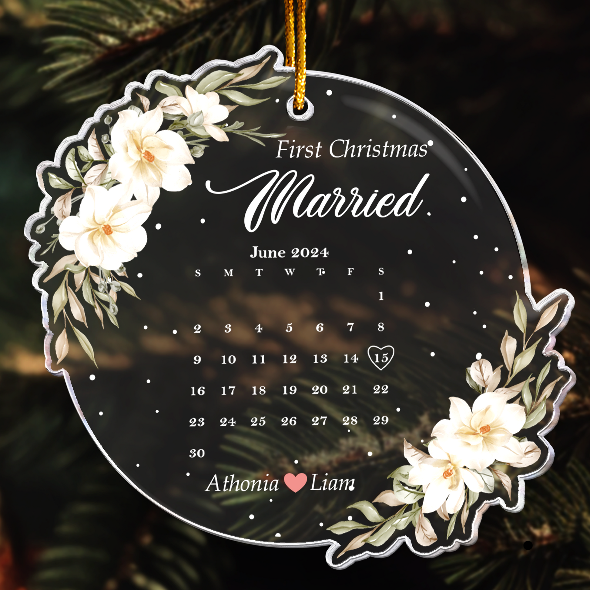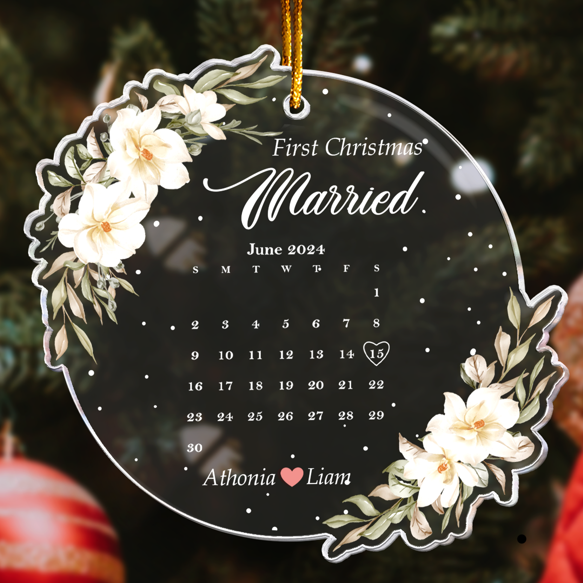 Celebrate your first Christmas together with our personalized acrylic ornament, featuring the message "First Christmas Married". This custom ornament is perfect for newlyweds, capturing the joy of your first holiday as a married couple. Ideal as a wedding gift or Christmas gift for couples, it’s a cherished keepsake for husband and wife. Customize it with a calendar to create a unique and memorable ornament for your festive season.