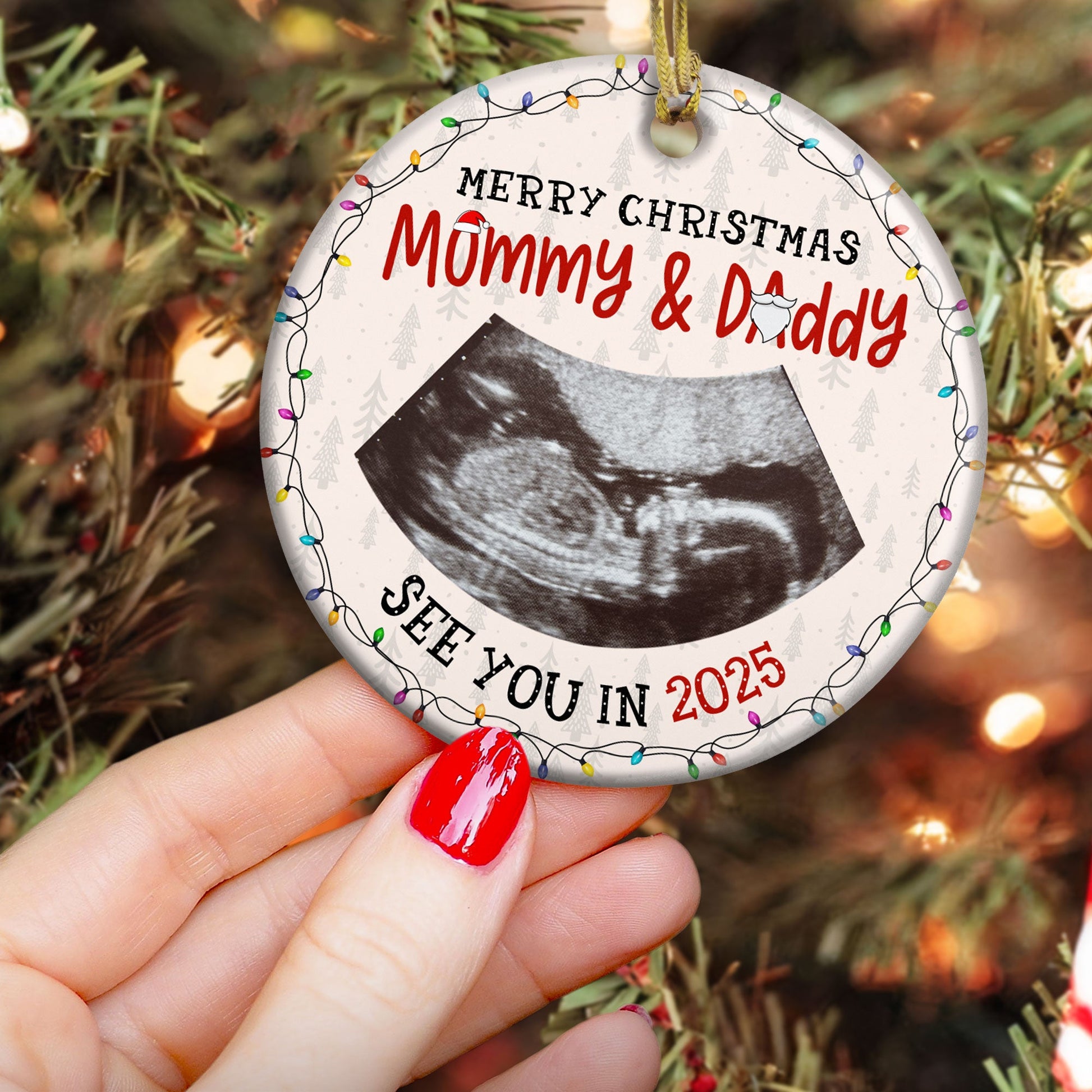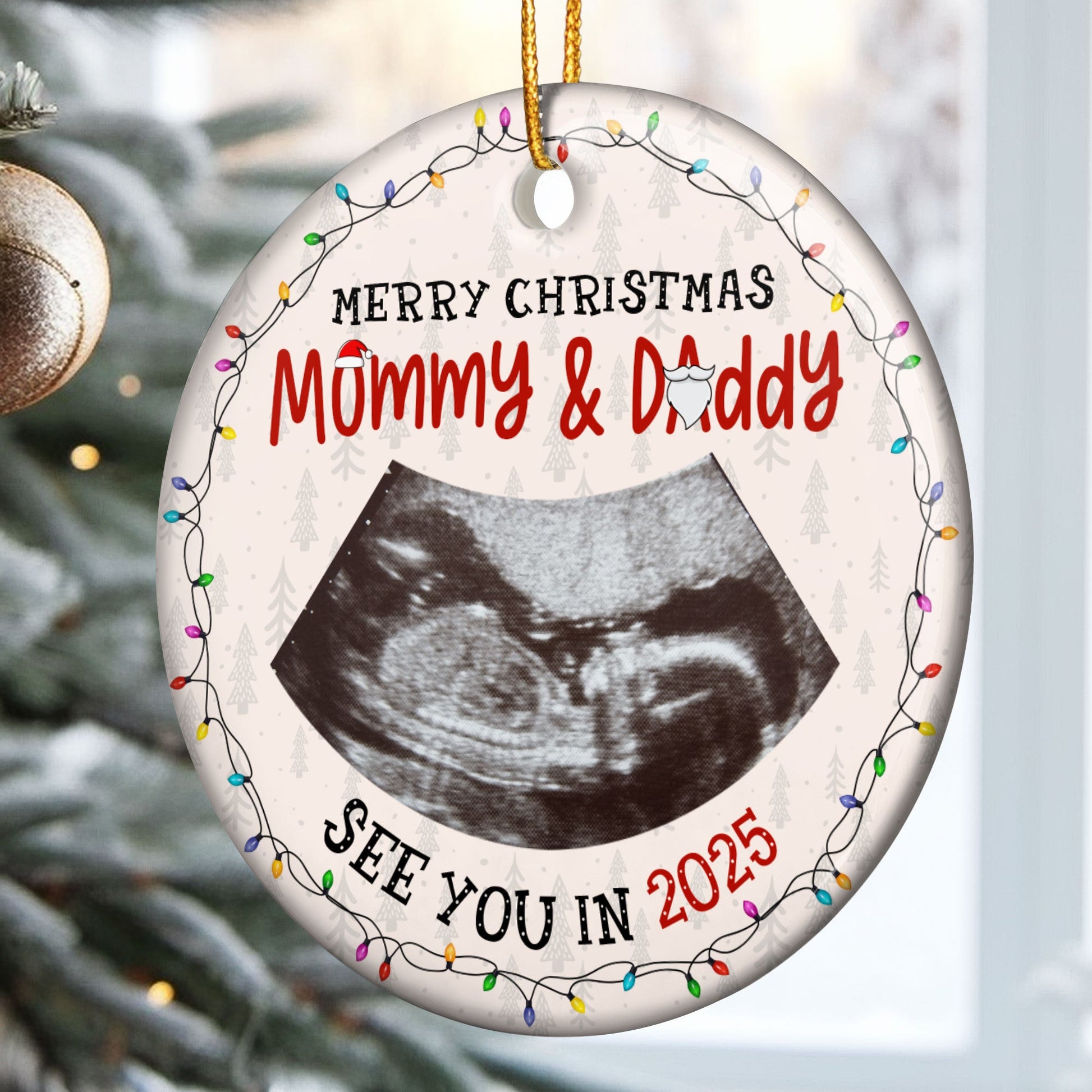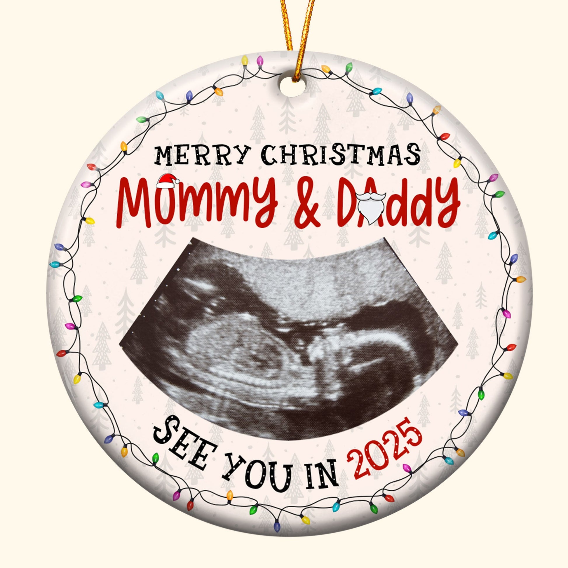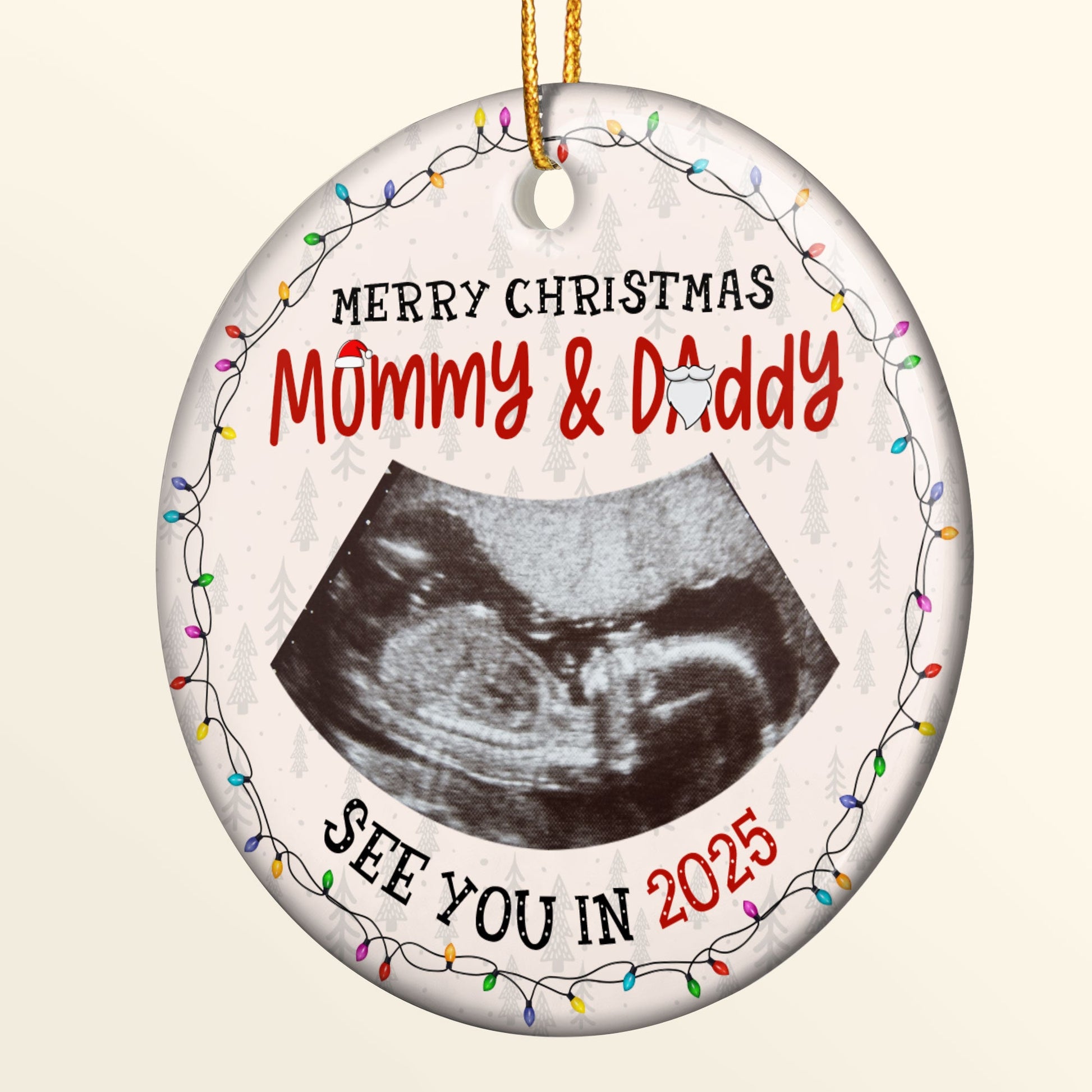 Capture the anticipation of togetherness with our touching First Christmas Mommy & Daddy personalized ceramic ornament. This heartfelt ornament features a loving message from your little one-to-be: