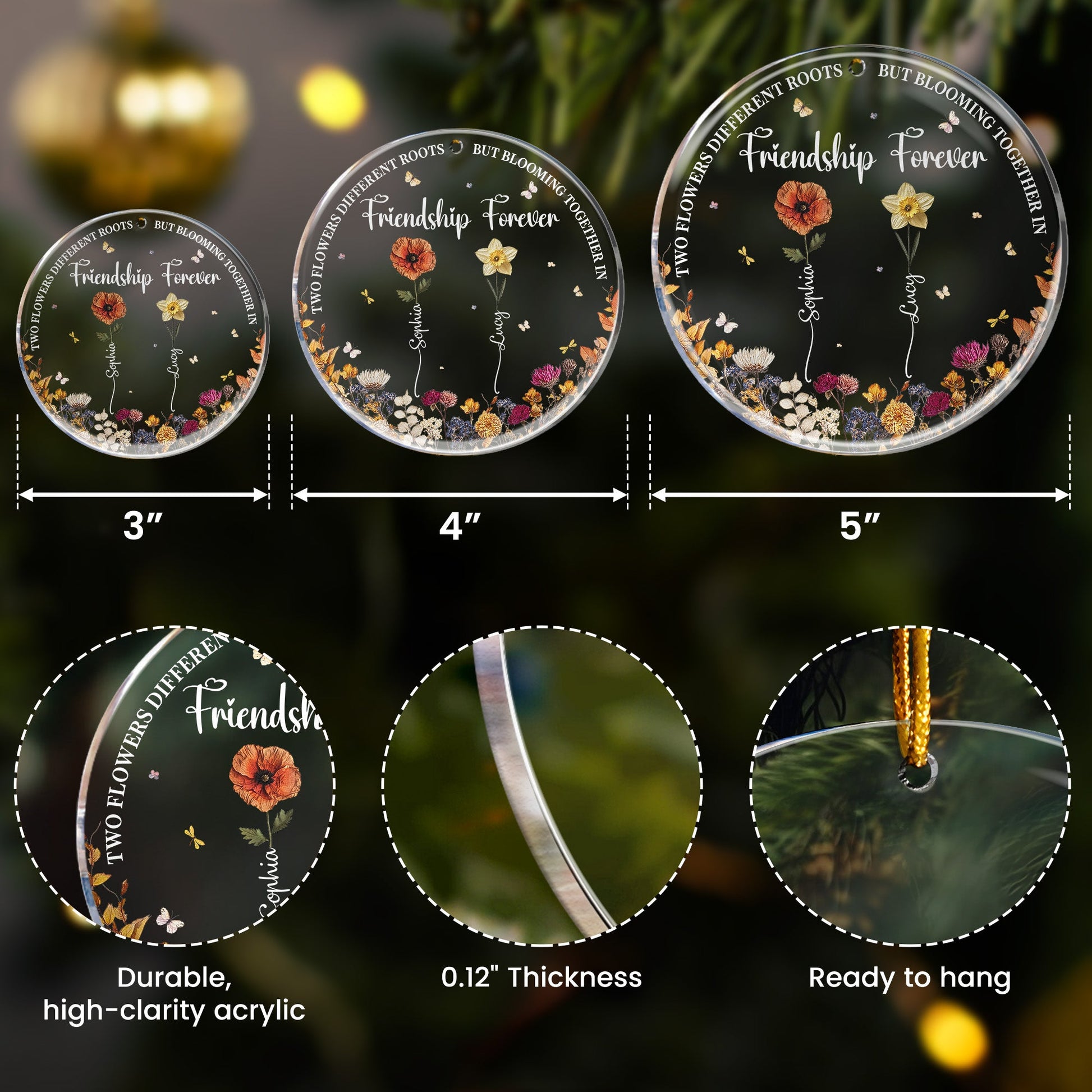 This personalized acrylic ornament graces your festive occasions like Christmas, adding a touch of unique bonding and blossoming friendship to your celebrations. The charm of its message reflects how different individuals, like flowers, bloom together to weave the beautiful story of cherished friendship. Place it on your tree or gift it to your friend to bring a smile on their faces. Brighten the live of your recipient and let your loving sentiments bloom forever. This perfect present is just a click away. Secure this symbol of friendship now!