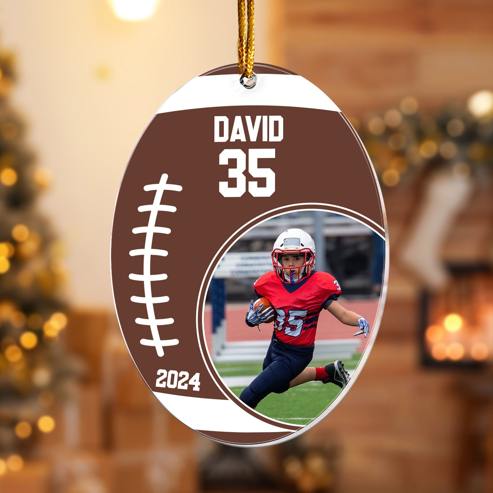 Score big this holiday season with a personalized custom-shaped acrylic photo ornament, designed especially for football players! Celebrate the hard work, unforgettable games, and team spirit by customizing this ornament with a favorite photo from the field.