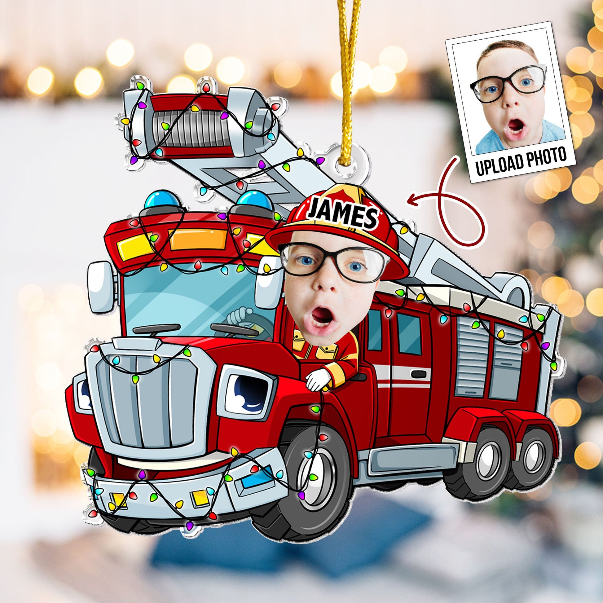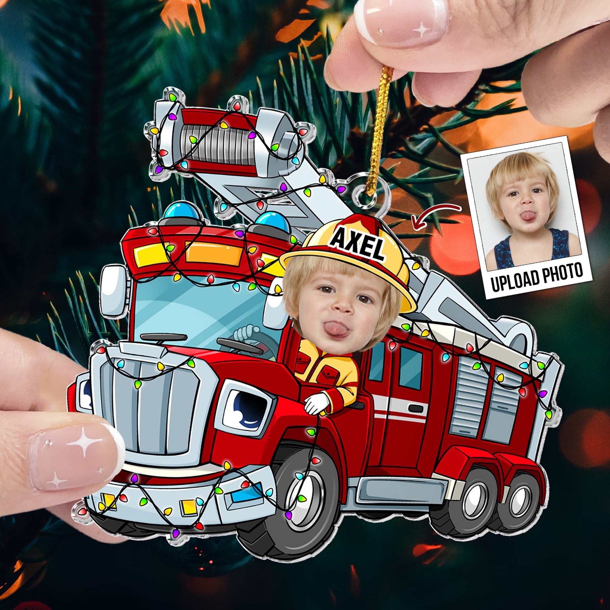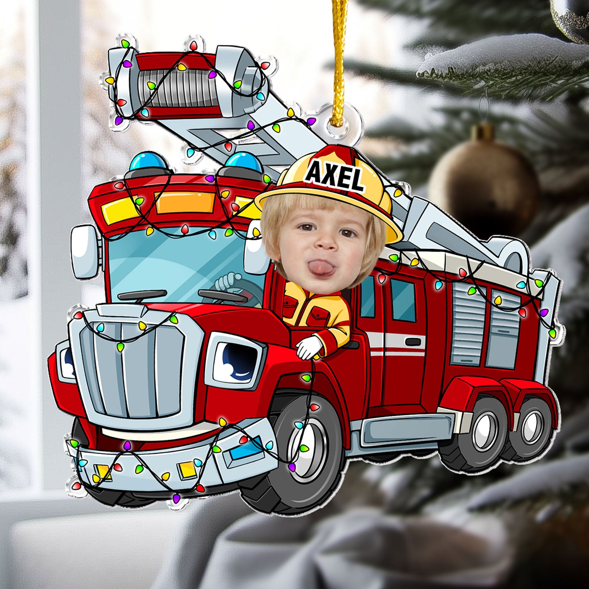 Celebrate the holiday season with this charming Personalized Custom Shaped Acrylic Photo Ornament featuring a cheerful Christmas Kid Riding Fire Truck . This ornament is the perfect addition to your Christmas tree and a delightful gift for kids, especially your little son. Customize it with a favorite photo to create a unique keepsake that will bring joy to your holiday celebrations