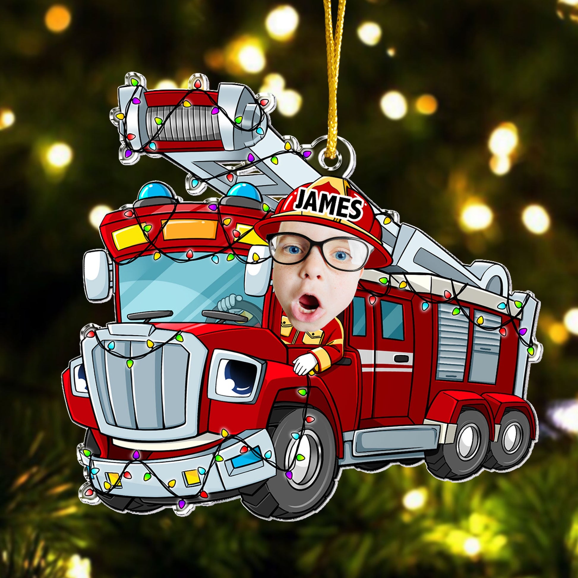 Funny Fire Truck Custom Kid Face - Personalized Acrylic Photo Ornament