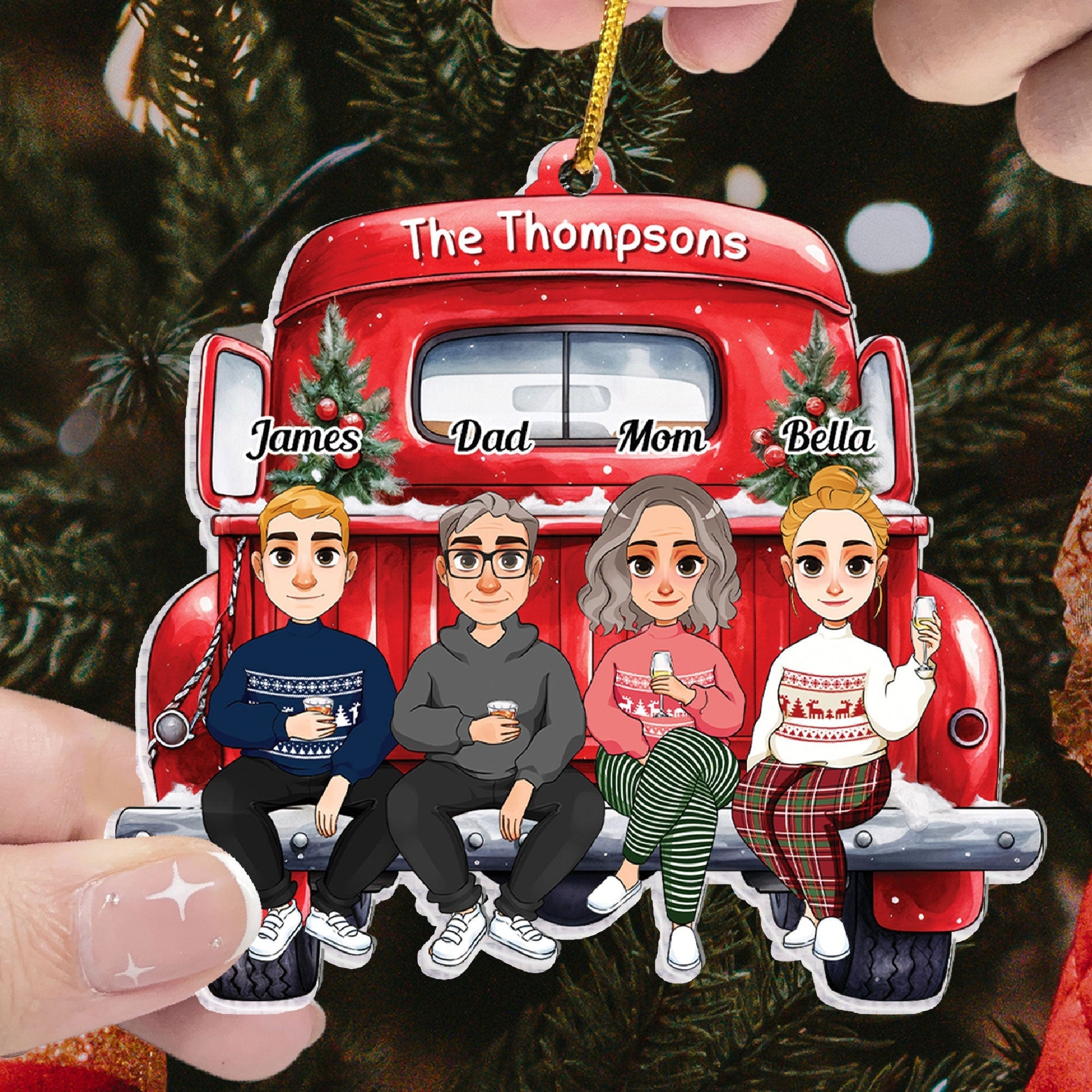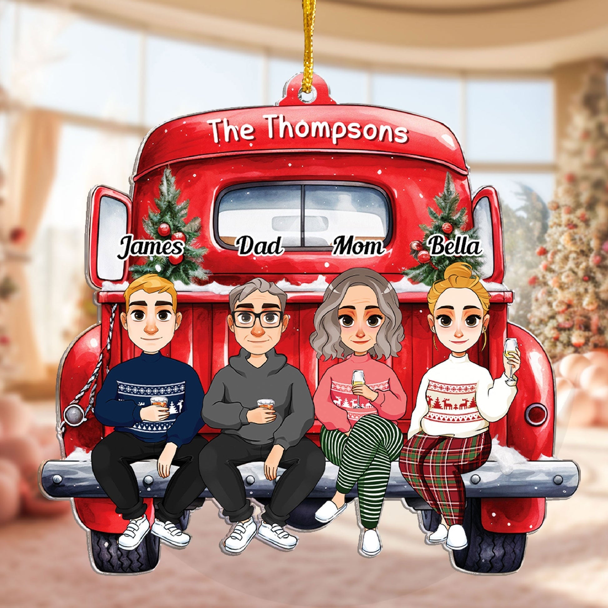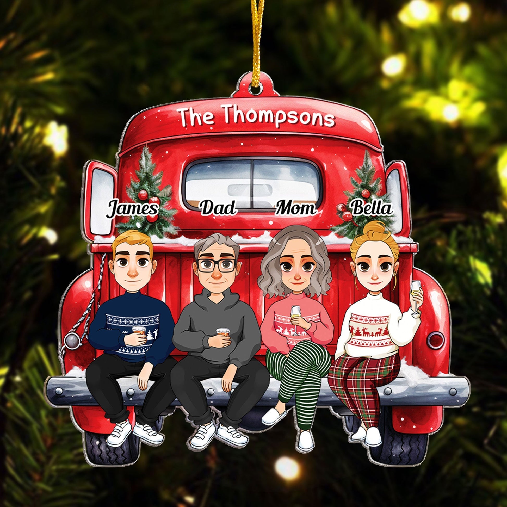 Make your family feel special with our personalized custom shaped acrylic ornament. This lovely ornament features a fun and festive design that shows your family members as customized characters sitting on a cartoon red truck. You can customize the ornament with your family members’ names, hair styles, skin tones, and outfits.