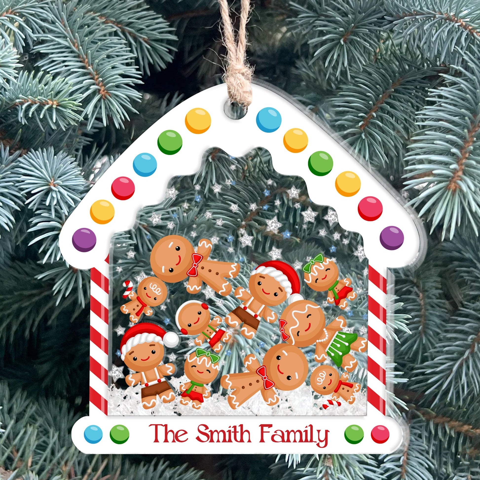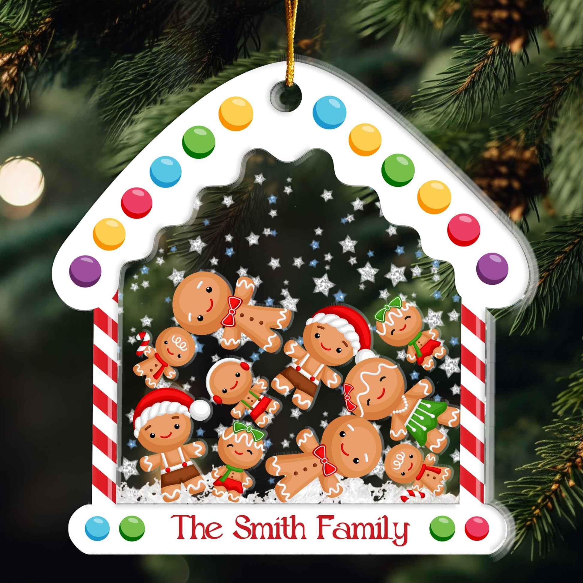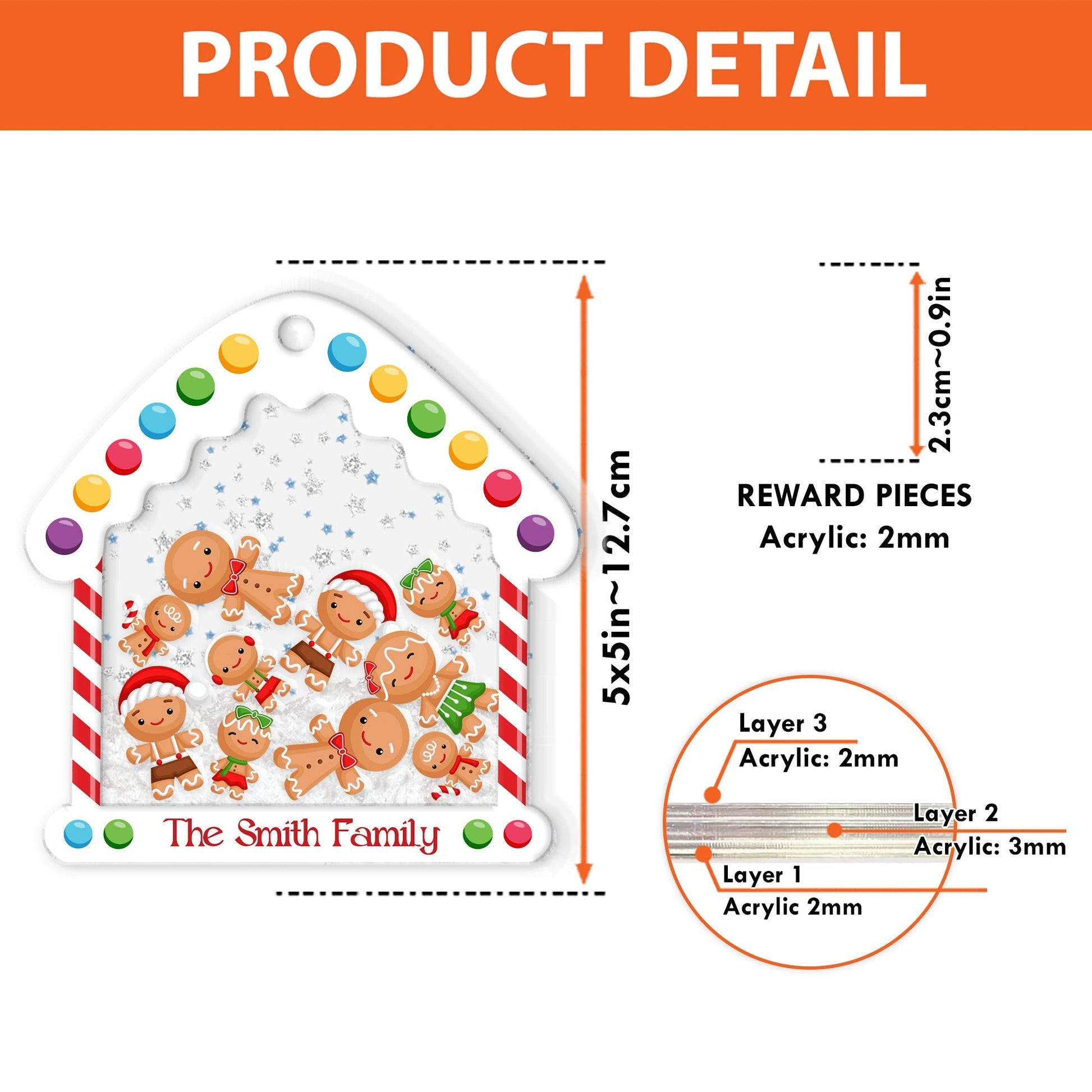 The ornament features a 3 layered design that creates a shaker effect. The first & third layer has a gingerhouse outline. The middle layer has a transparent window that shows the gingerbread people inside