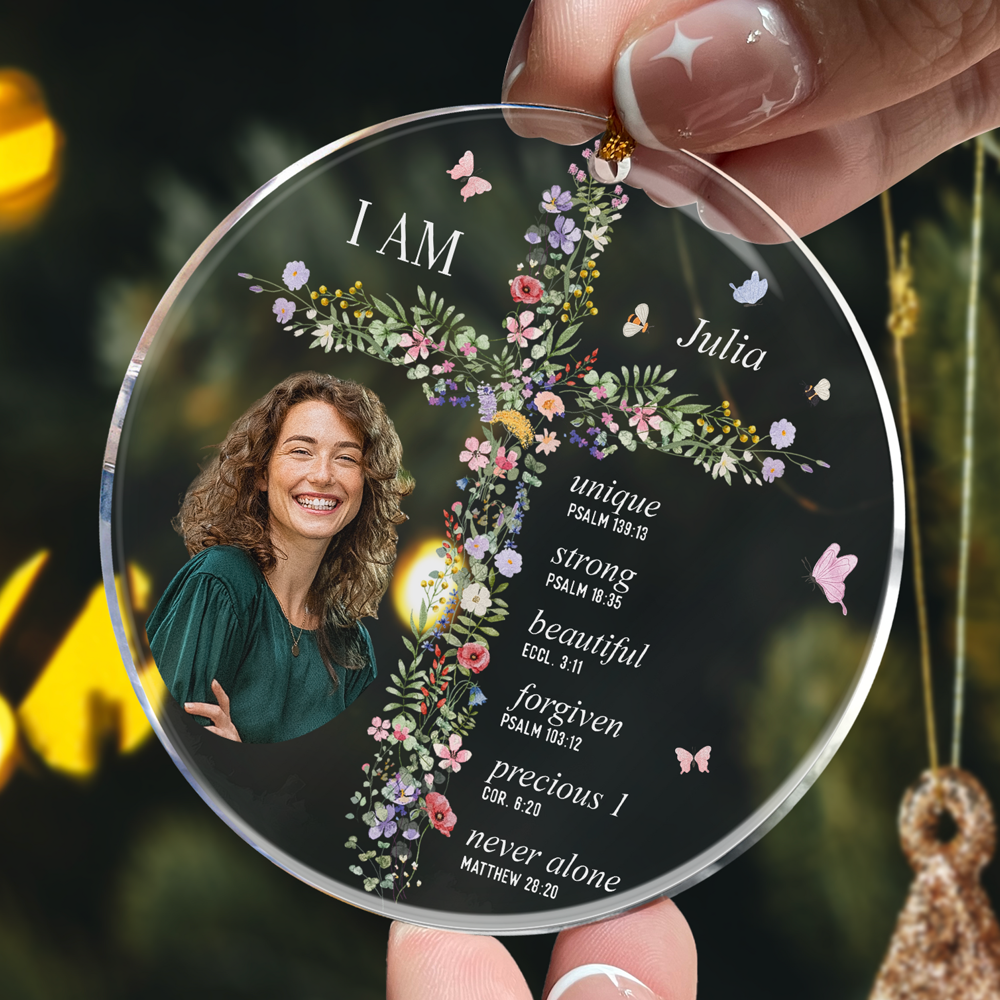 The "God Says I Am With Flowers Cross" Personalized Circle Acrylic Ornament is a heartfelt and meaningful gift for your daughter, perfect for expressing your love and reminding her of God's presence in her life. Featuring a beautifully crafted floral cross design, this ornament serves as a symbol of faith, strength, and beauty, making it an ideal gift for Catholic and Christian girls. Personalize it with her custom photo, appearance, and name to create a unique and cherished keepsake that reflects her spiritual journey. Whether for Christmas, her birthday or as a surprise reminder of your love, this ornament is a thoughtful gift that she can hang on the tree or display year-round. It offers daily reflection on love, encouragement, and faith, making it a timeless treasure she will hold dear forever.