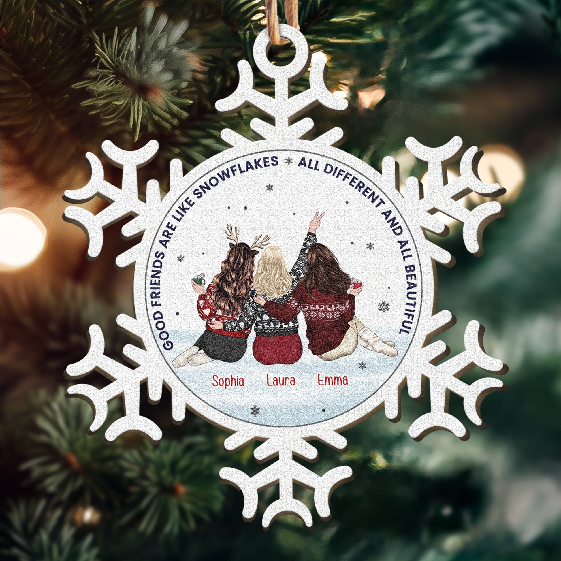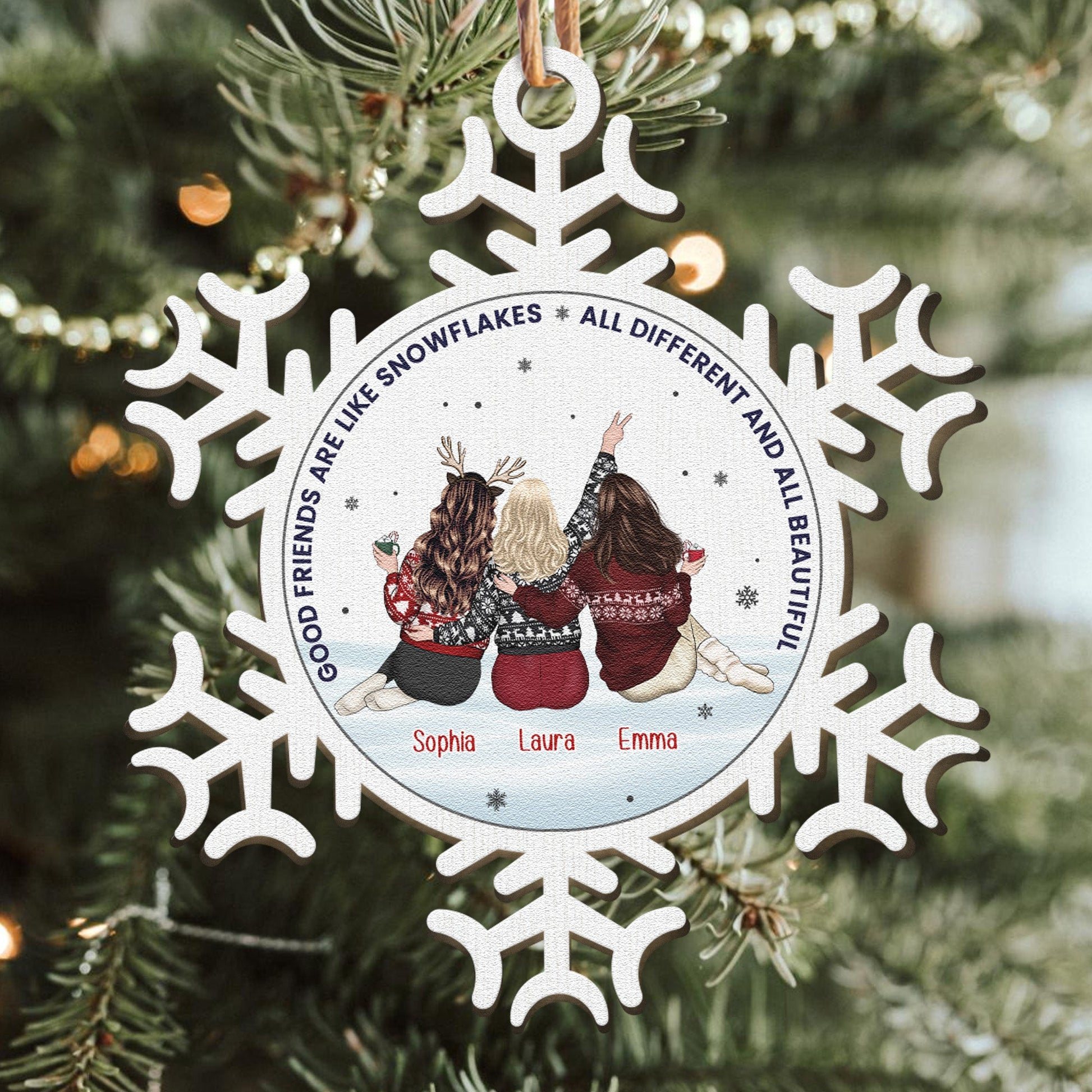 Celebrate the beauty of friendship this holiday season with our Personalized Snowflake-Shaped Wooden Ornament, featuring the heartfelt message "Good friends are like snowflakes – All different and all beautiful." This charming ornament is carefully crafted from high-quality wood, showcasing a delicate snowflake design that symbolizes the uniqueness of each friendship.