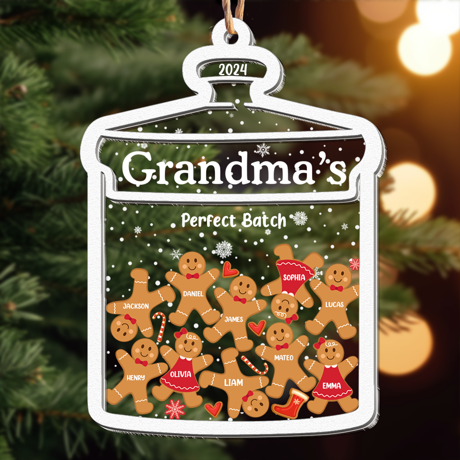 The ornament features a classic gingerbread design, complete with intricate icing patterns and a touch of festive sparkle. Its nostalgic charm evokes memories of homemade gingerbread cookies and cozy family gatherings during the holiday season. The words "Grandma's Perfect Batch" are delicately inscribed, paying tribute to the special role grandmothers play in creating cherished family traditions.