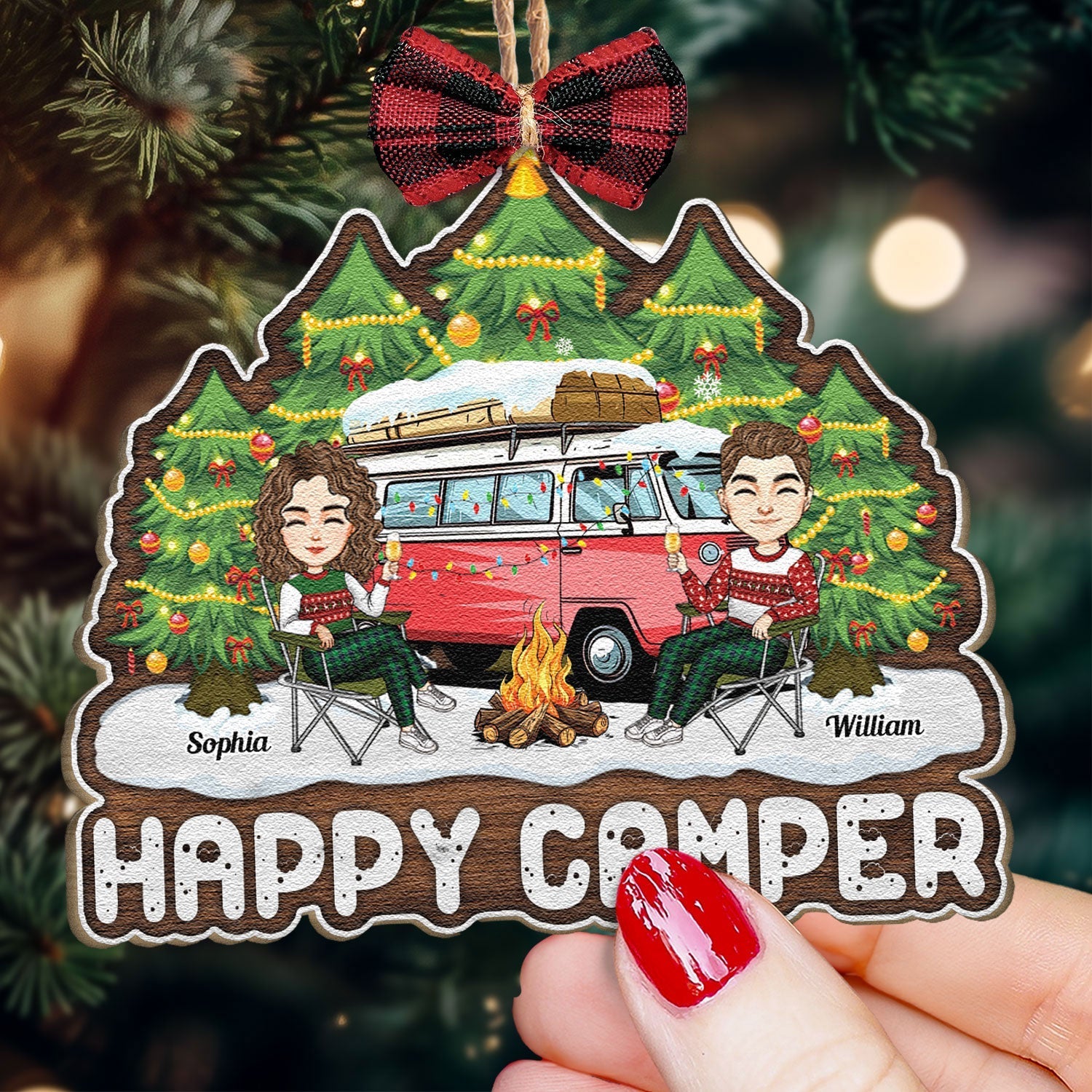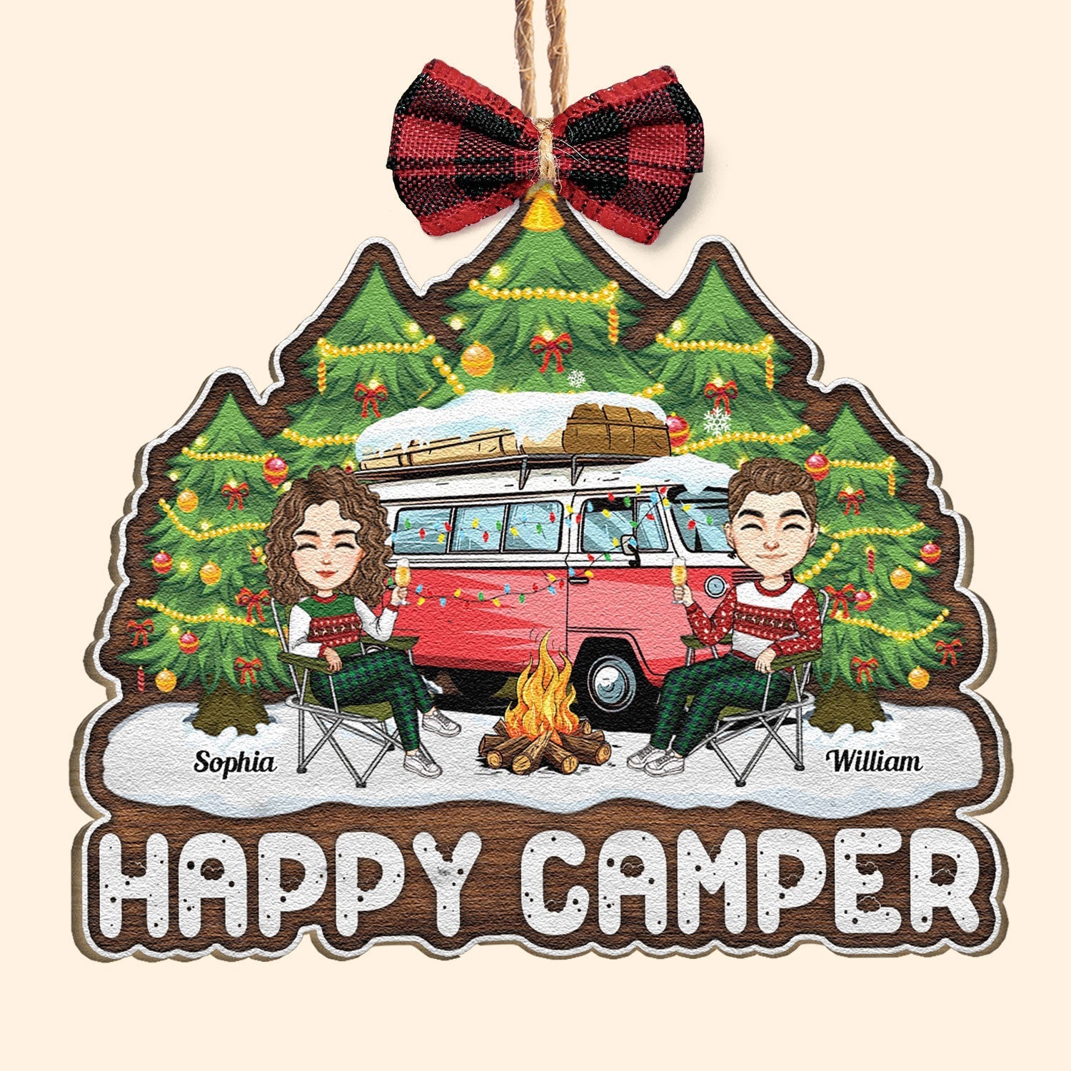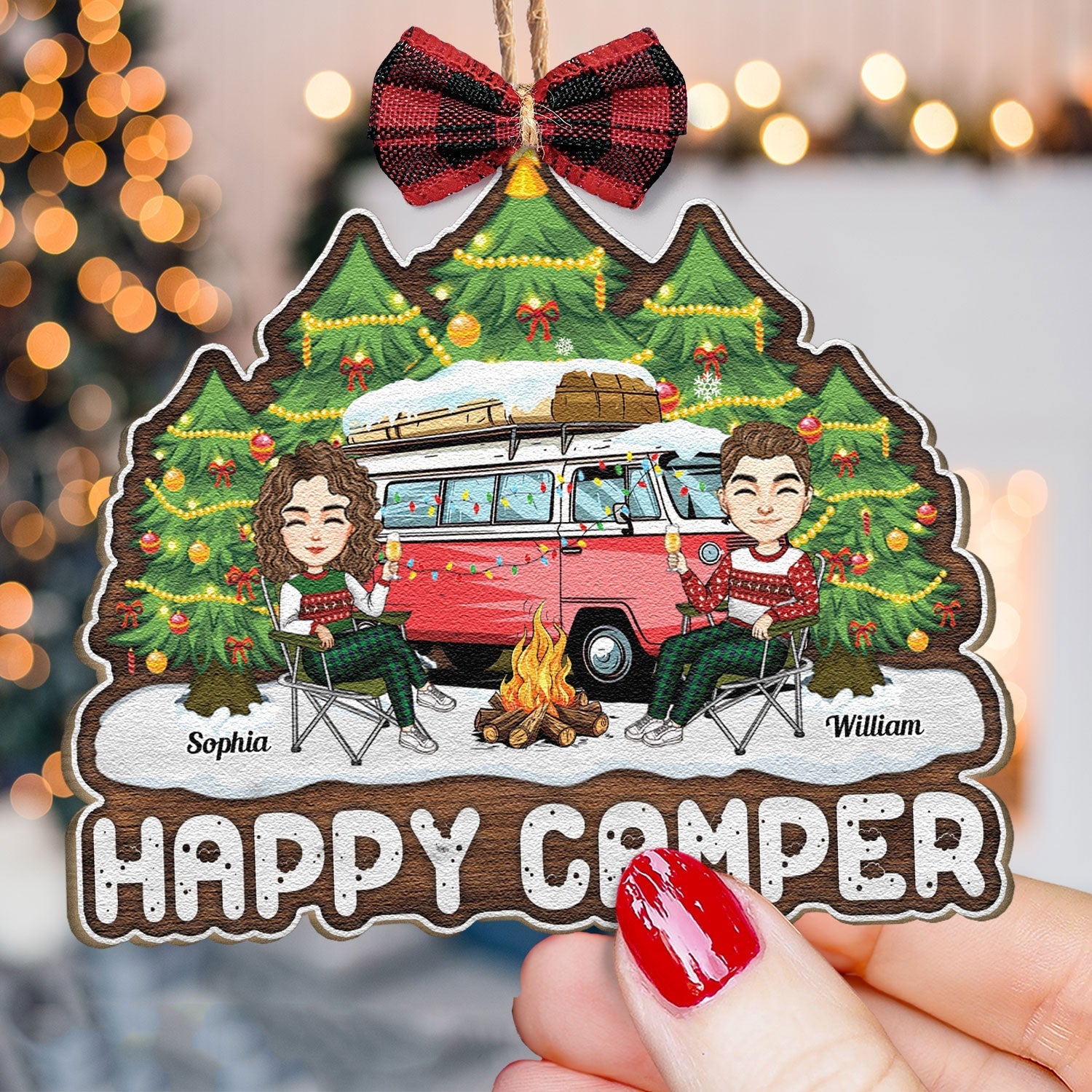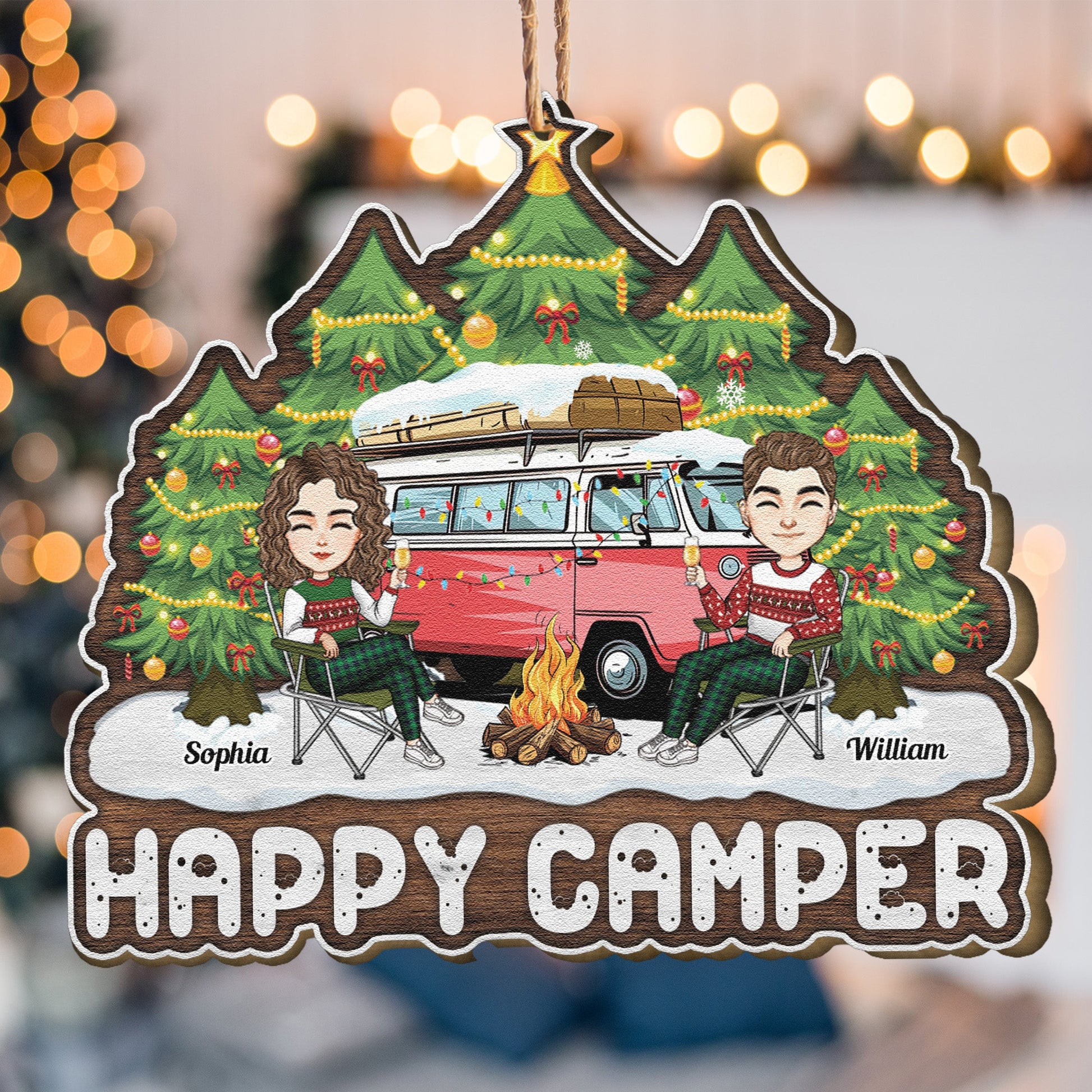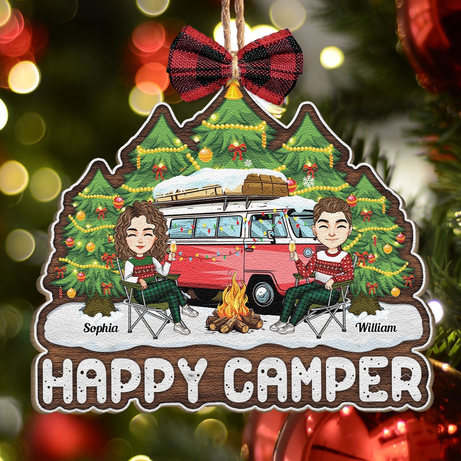 Happy Camper Camping Couples - Personalized Custom Shaped Wooden Ornament