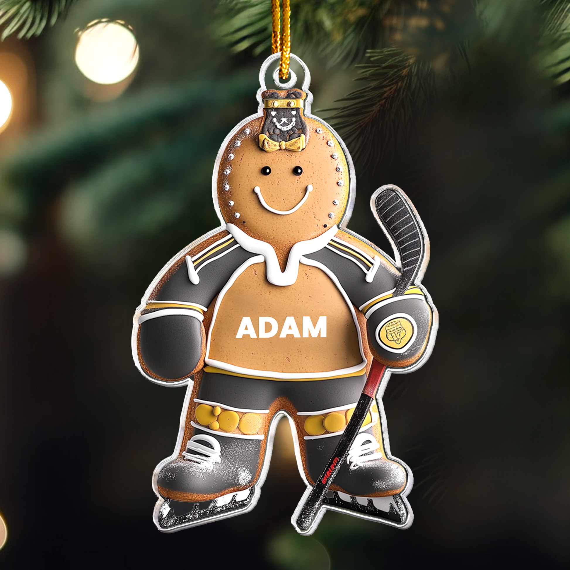 The Hockey Gingerbread Christmas Ornament - Gift For Hockey Lovers, Kids - Personalized Acrylic Ornament is a playful, personalized acrylic ornament designed for hockey lovers and kids alike. Crafted in a fun gingerbread style with a 3D effect, this ornament captures the holiday spirit with a hockey twist. Customize it with a name to make it a unique keepsake for any hockey enthusiast. Perfect for adding a touch of sporty charm to the Christmas tree, this ornament is a fantastic gift that celebrates both the joy of the game and the holiday season. An ideal keepsake for hockey fans, young and old!