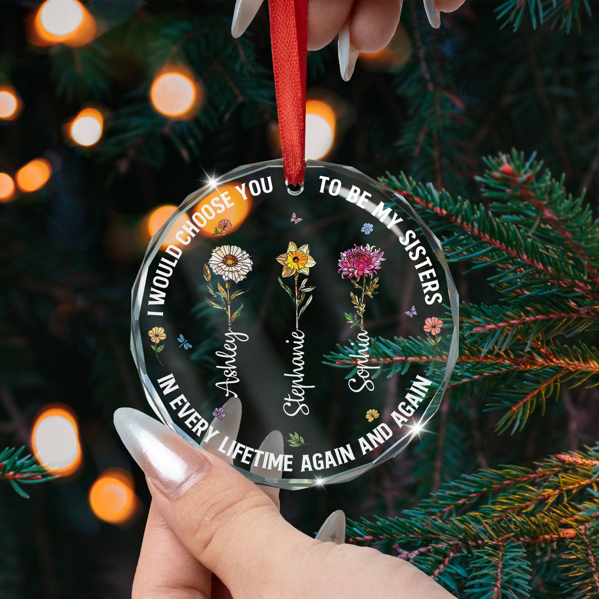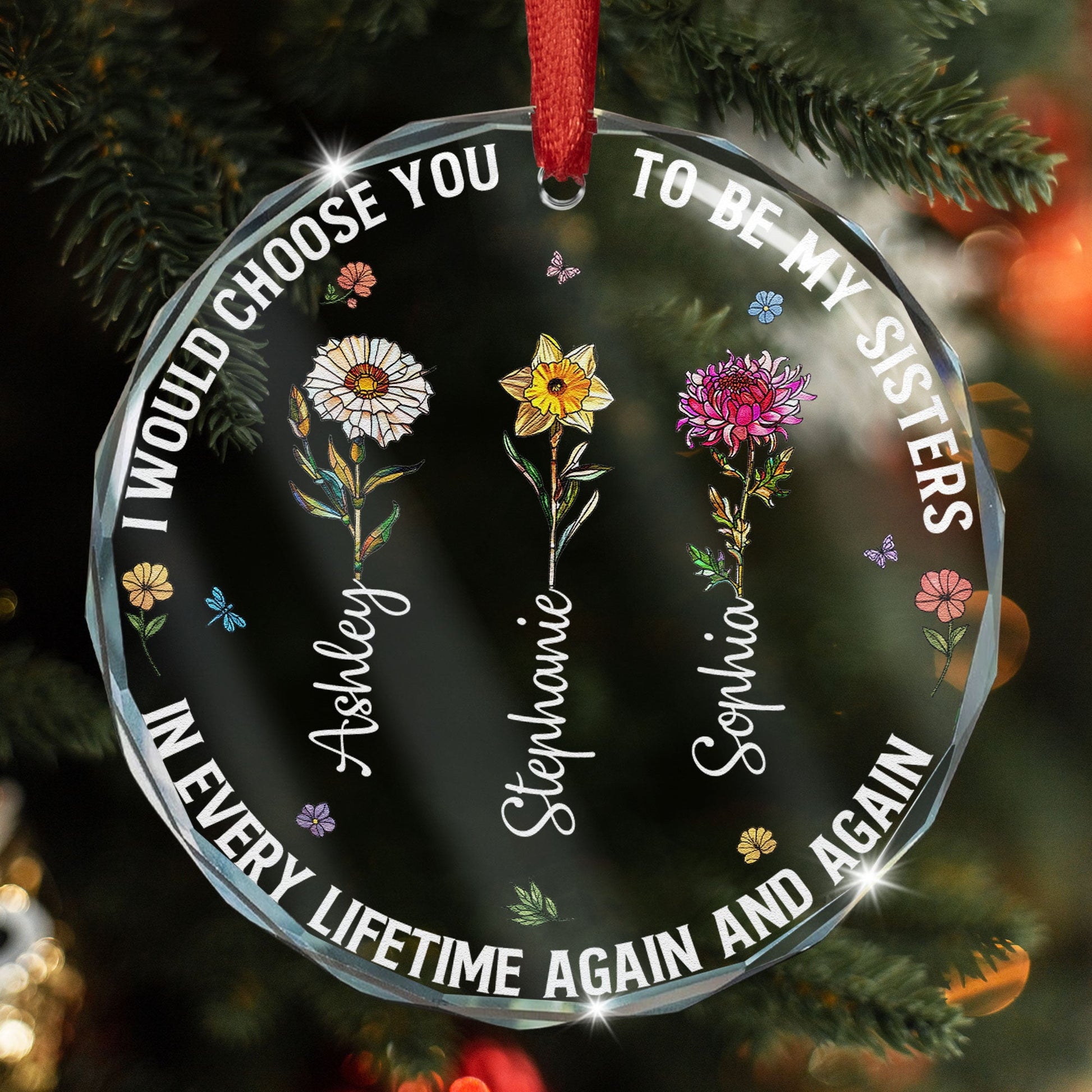 Celebrate the inseparable bond of sisters with our beautifully crafted 'I Would Choose You - Personalized Glass Ornament.' This unique product encapsulates the powerful sentiment of choosing your very own sibling lifetime after lifetime. Emphasizing the endearing connection within a family and solidifying the special bond between sisters, this Christmas ornament is indeed a masterpiece. It's perfect for different occasions such as Christmas, birthdays, anniversaries, wrapping the essence of your love for your sister in a heartfelt ornament.