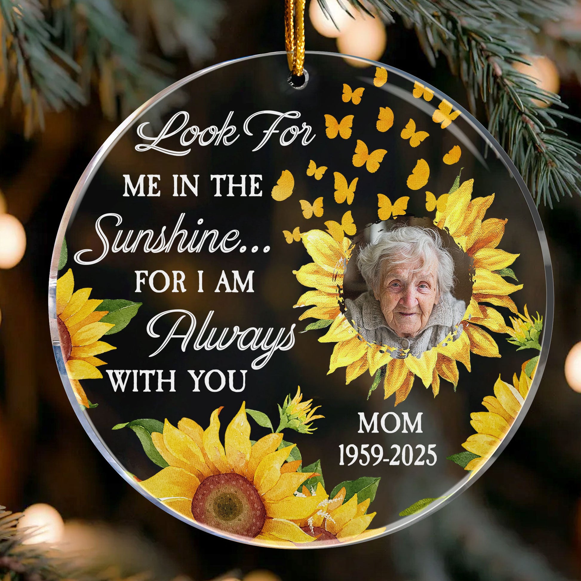 Bring comfort and warmth to your loved ones with the Look For Me In The Sunshine - Personalized Acrylic Photo Ornament. As a Circle Acrylic Ornament, this product ensures to preserve your sentimental memories and foster family connections. It invites you to experience the joy of reminiscing by integrating your very own photos into the design. Perfect for Memorial events, birthdays, Christmas, anniversaries, or any occasion... This ornament brings a thoughtful element to any festive gathering or intimate family moment.