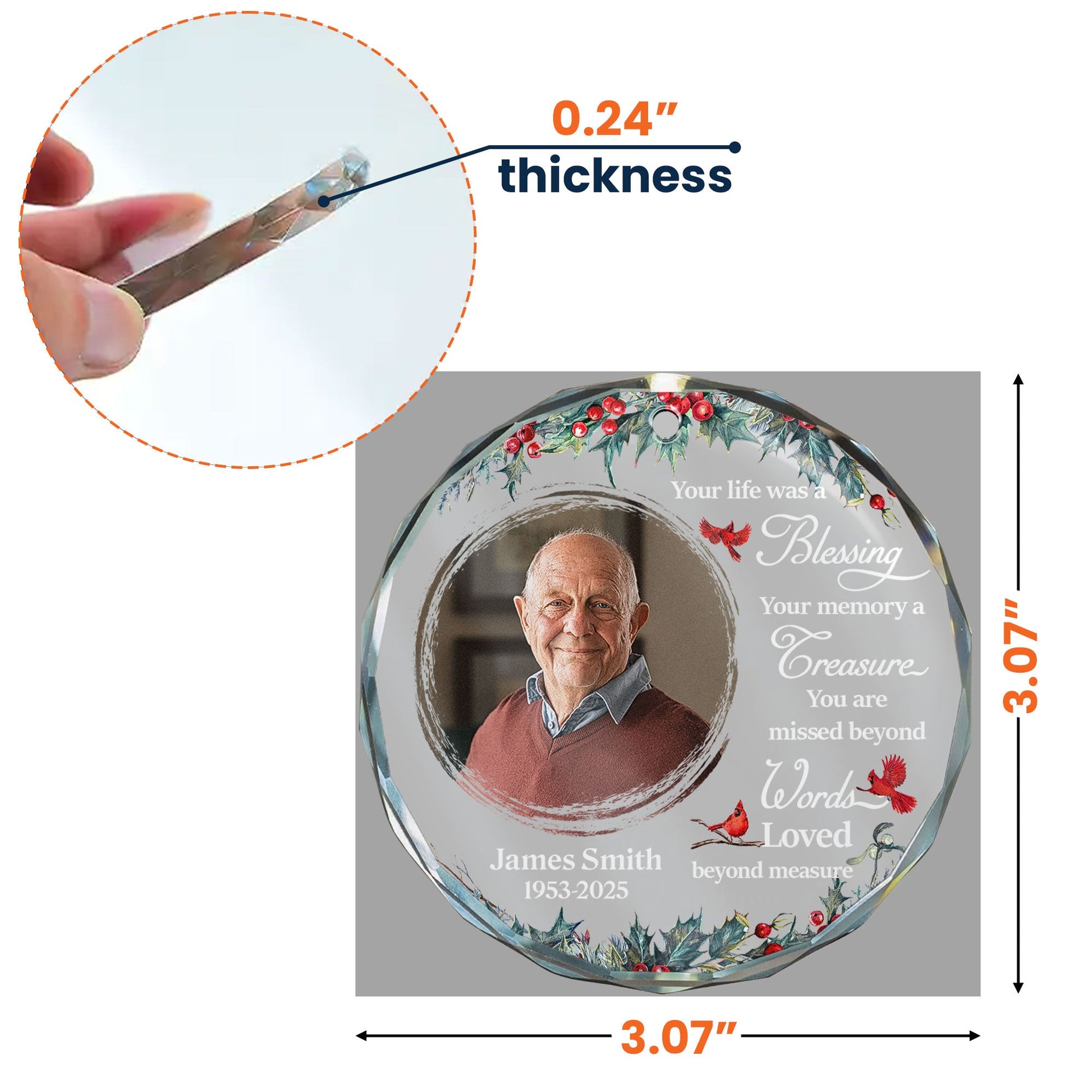Our personalized Glass Ornament titled "Memorial Ornament Your Life Was A Blessing" not only serves as an elegant piece of holiday decor, but also encapsulates sentimentality, creating an enduring bond with your loved ones. Custome designed with the capacity for a cherished photo, this ornament allows you to relive valued memories of your beloved family and friends, making it a thoughtful unique gift for those who treasure their relationships. Perfect for memorial occasions, Christmas, birthdays, anniversaries, or any occasion as it broadens the gift appeal fostering an emotional resonance that goes beyond tangible value.