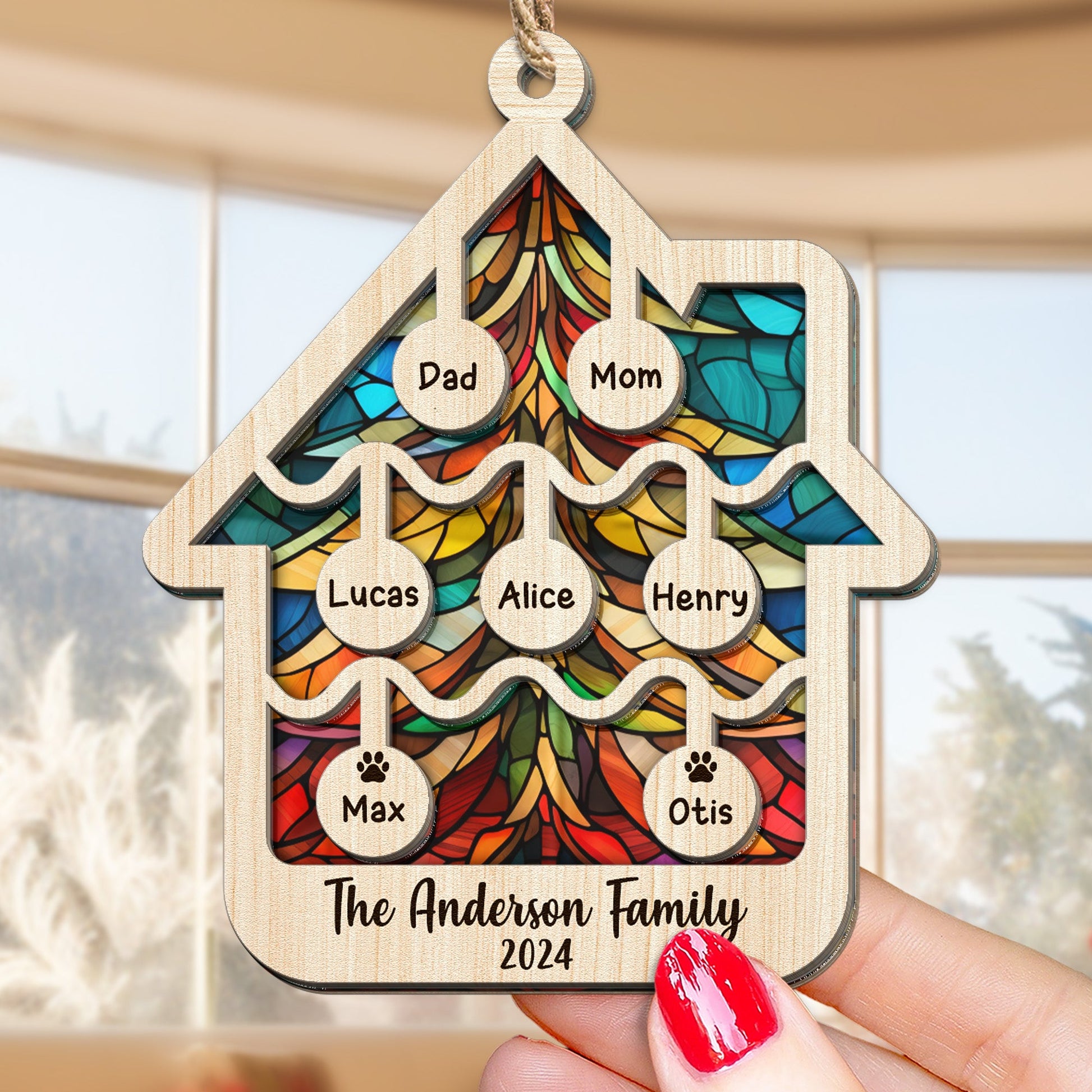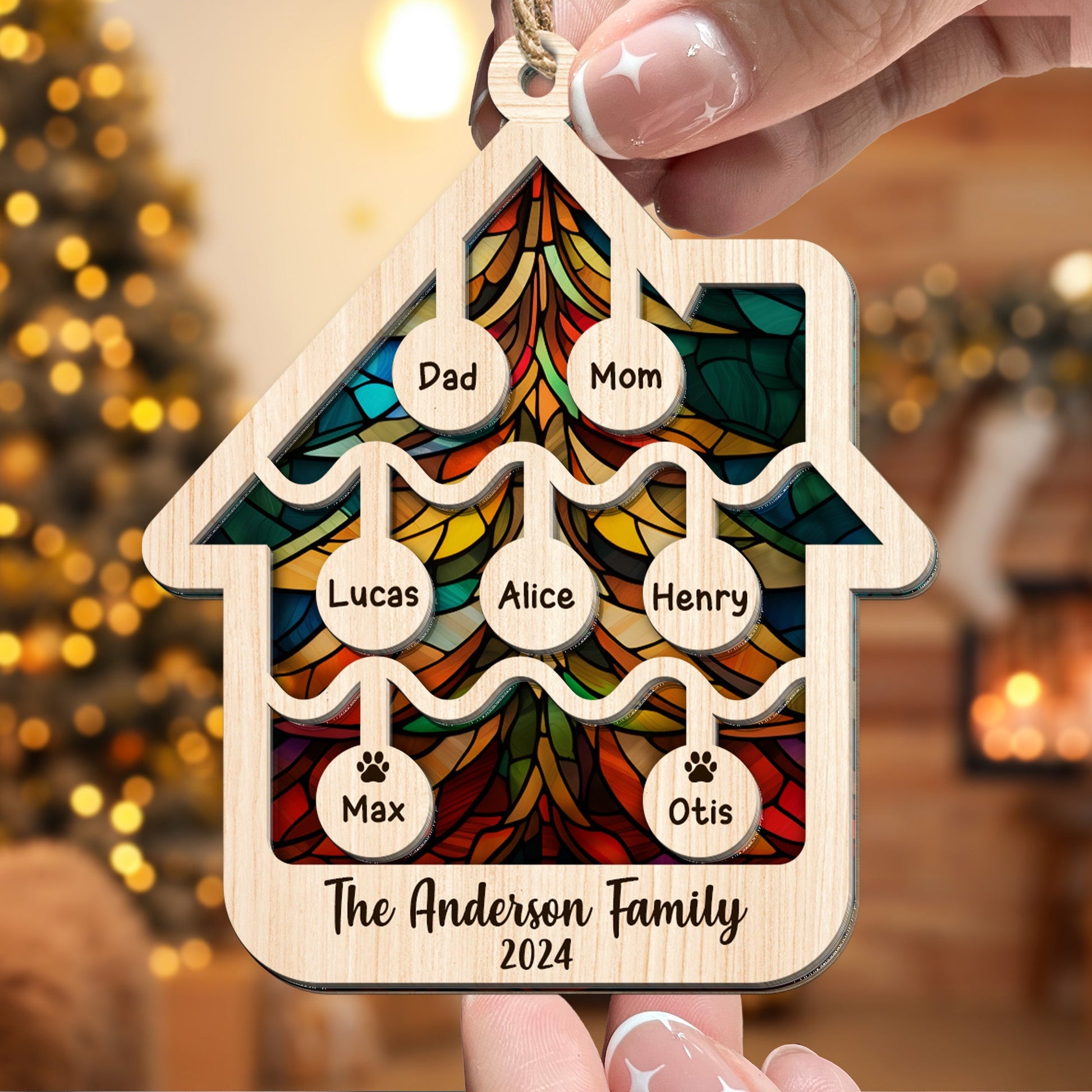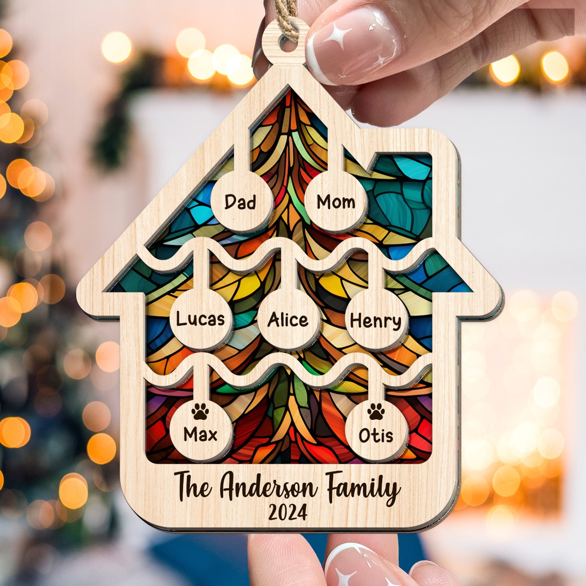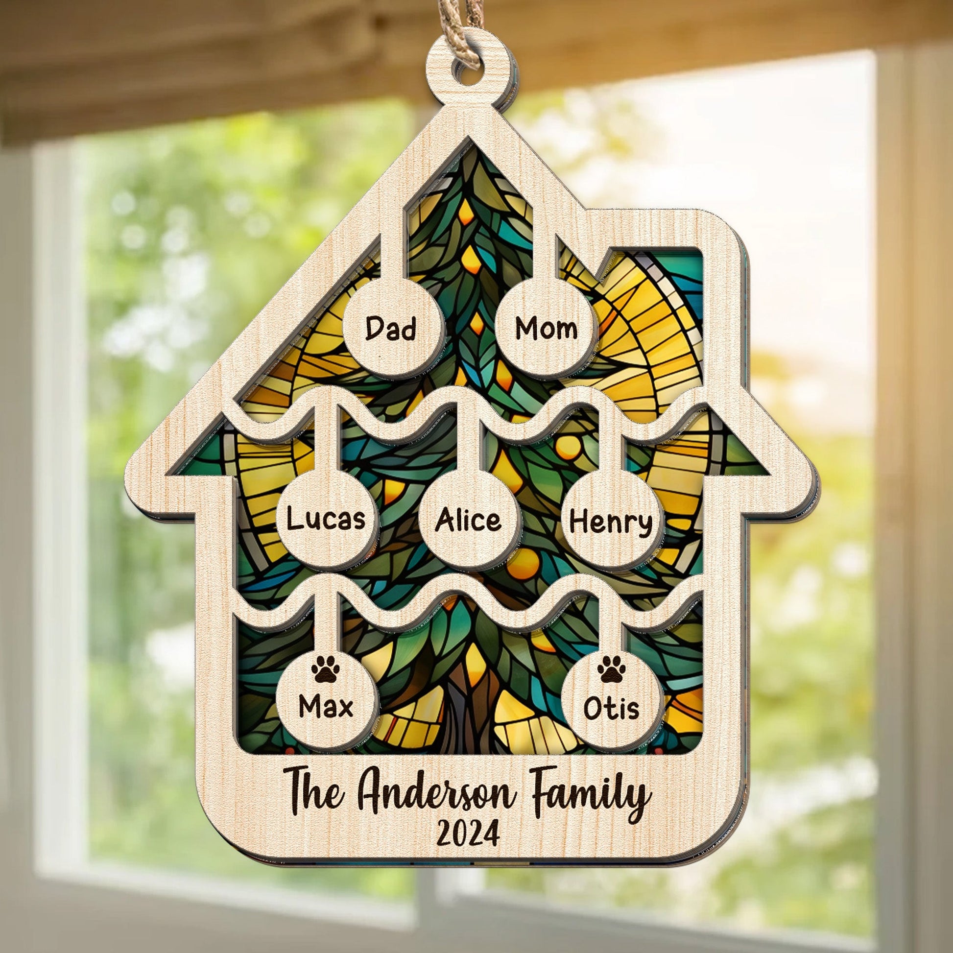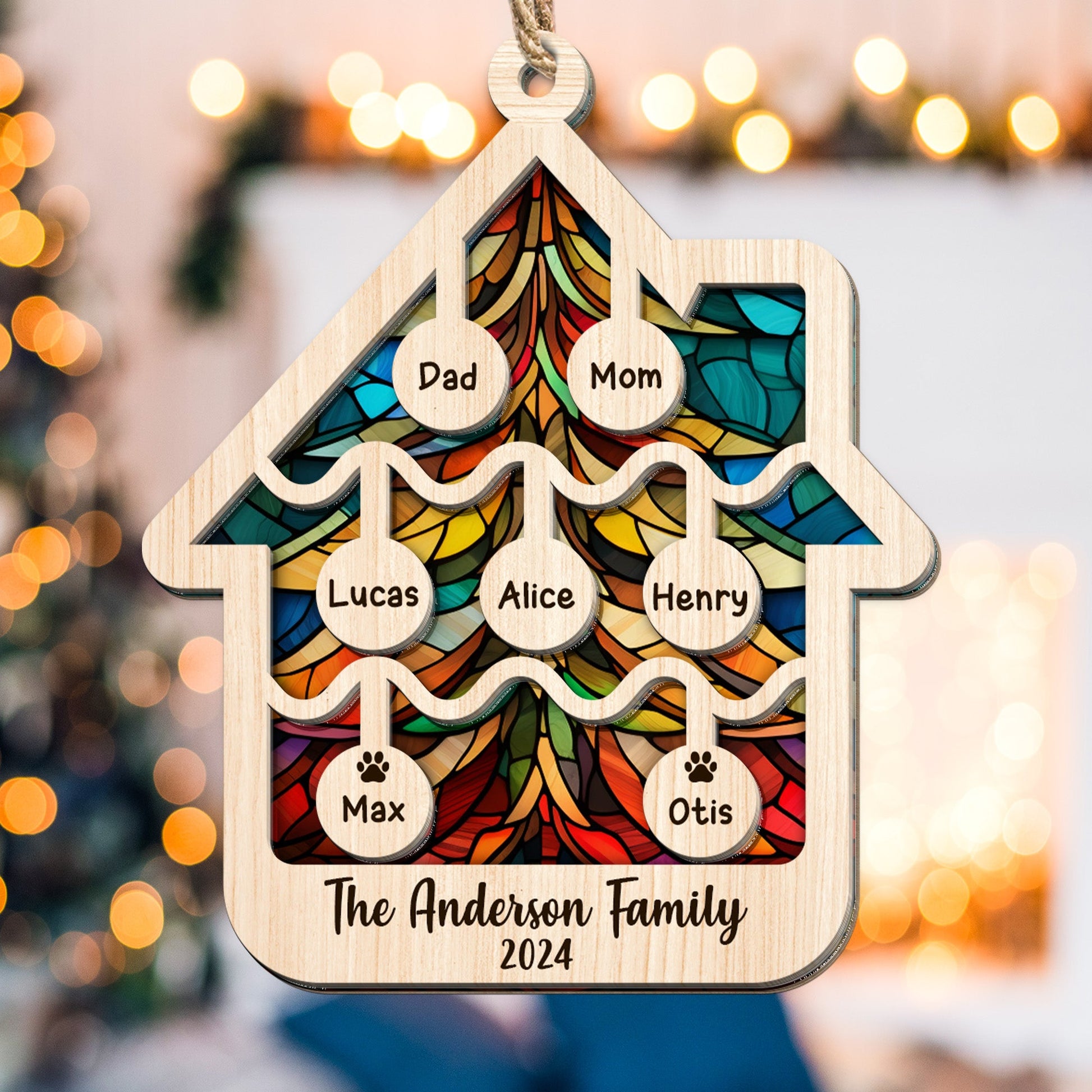 Illuminate your holidays with our Suncatcher Ornament. Crafted with care, this high-quality, house-shaped suncatcher is more than an ornament; it's a personalized masterpiece. Add your family name for that extra touch of warmth and love. Perfect for gifting to parents or grandparents, it's a unique Christmas keepsake, capturing the essence of family and home. Brighten up your tree and celebrate togetherness this holiday season with this beautiful, custom ornament.