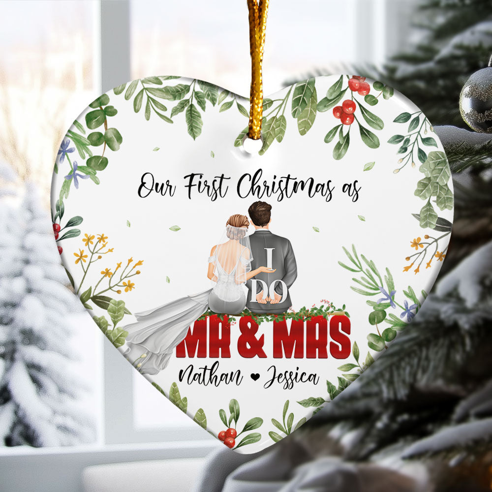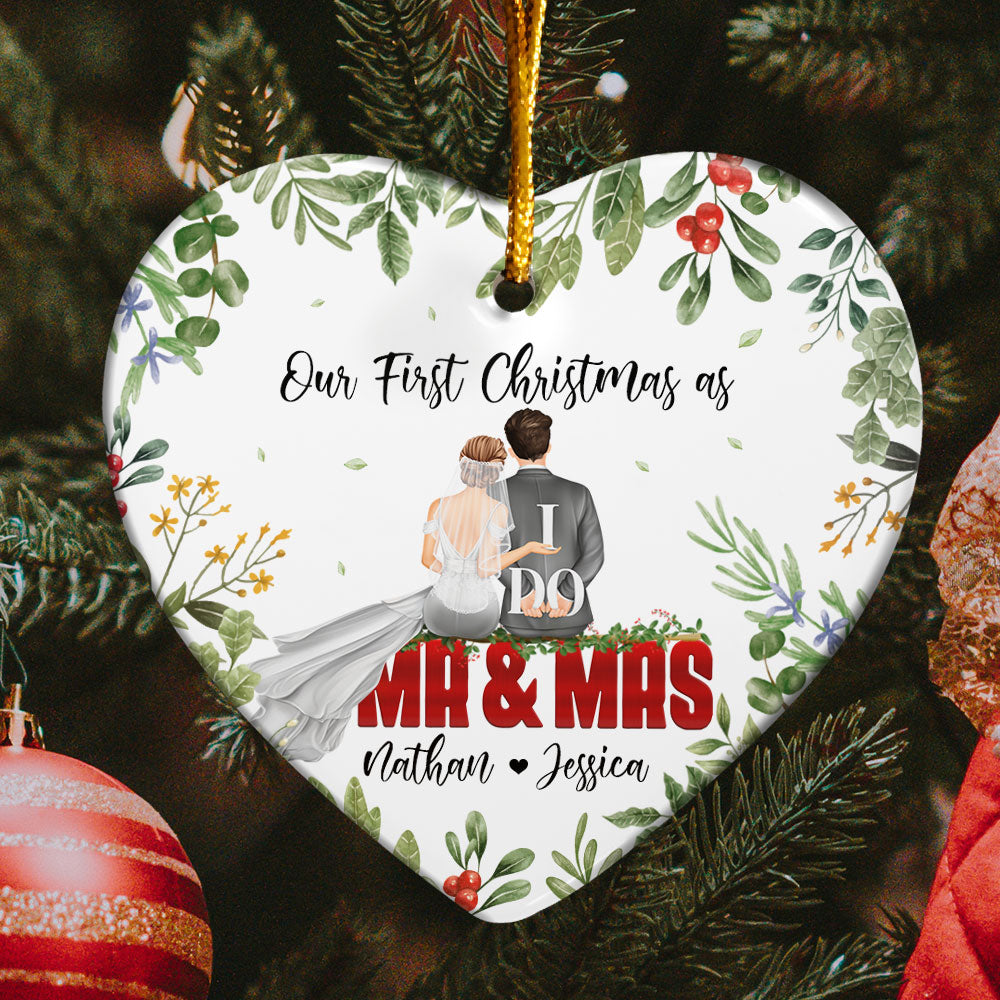 Our First Christmas As Mr. & Mrs. - Personalized Heart Shaped Ceramic Ornament