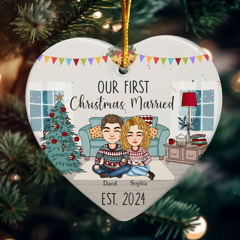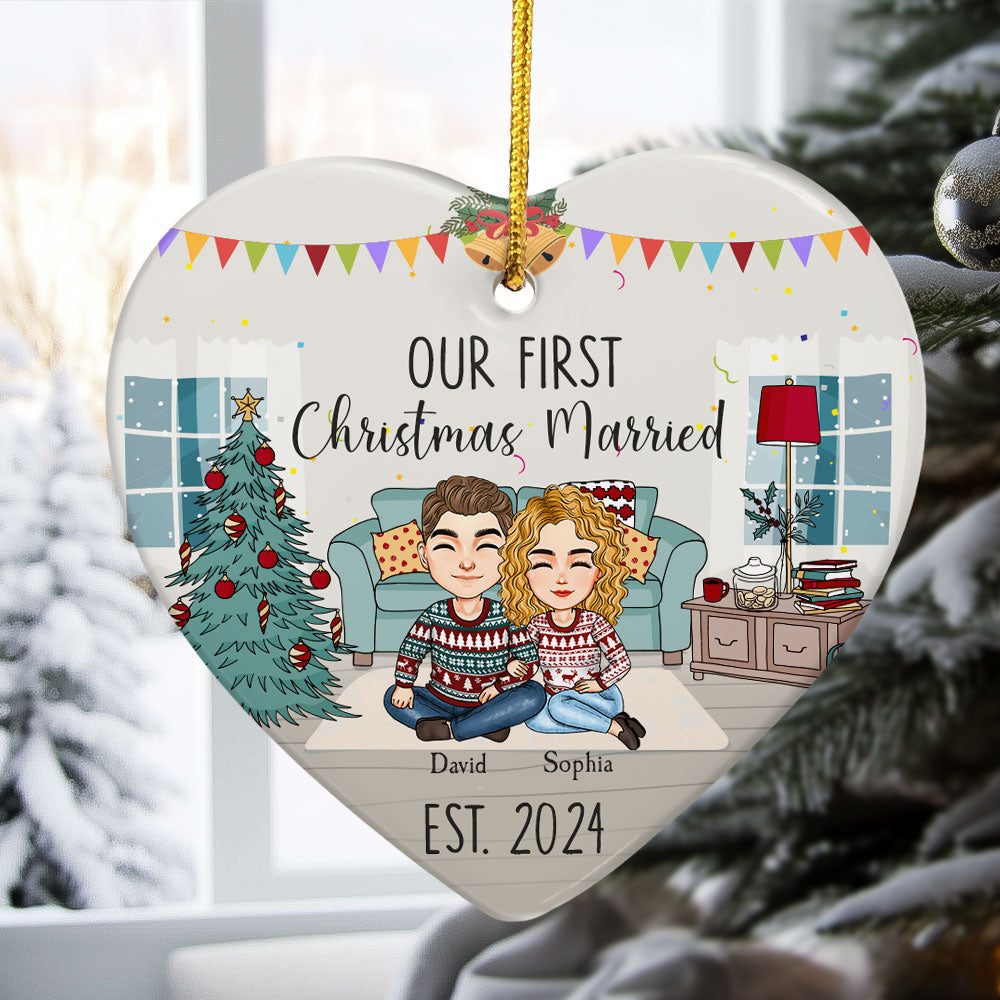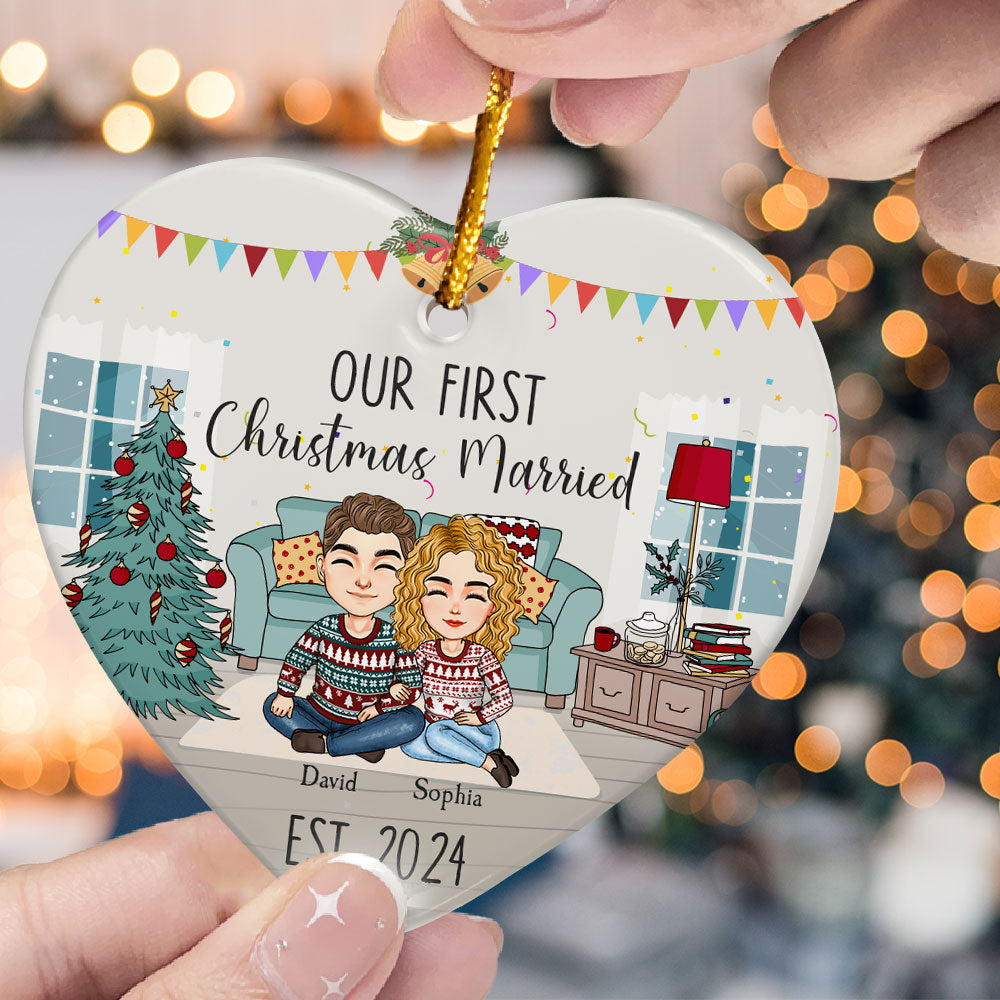 Our First Christmas Married - Personalized Heart Shaped Ceramic Ornament
