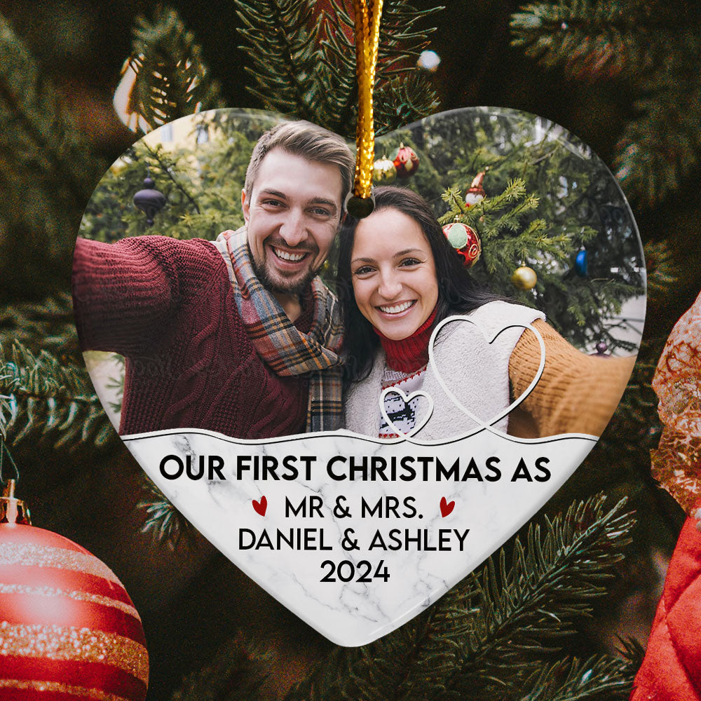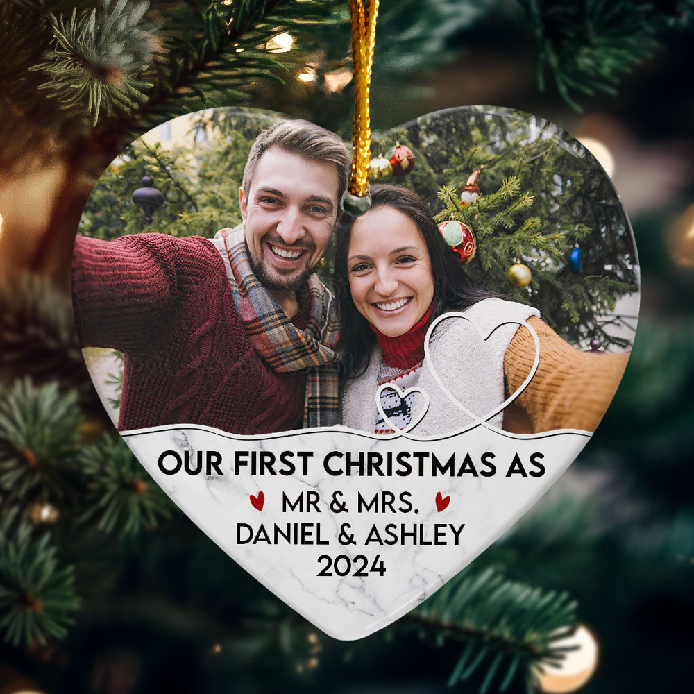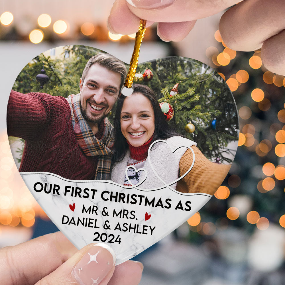 Our First Christmas As Mr & Mrs - Personalized Heart Shaped Ceramic Photo Ornament