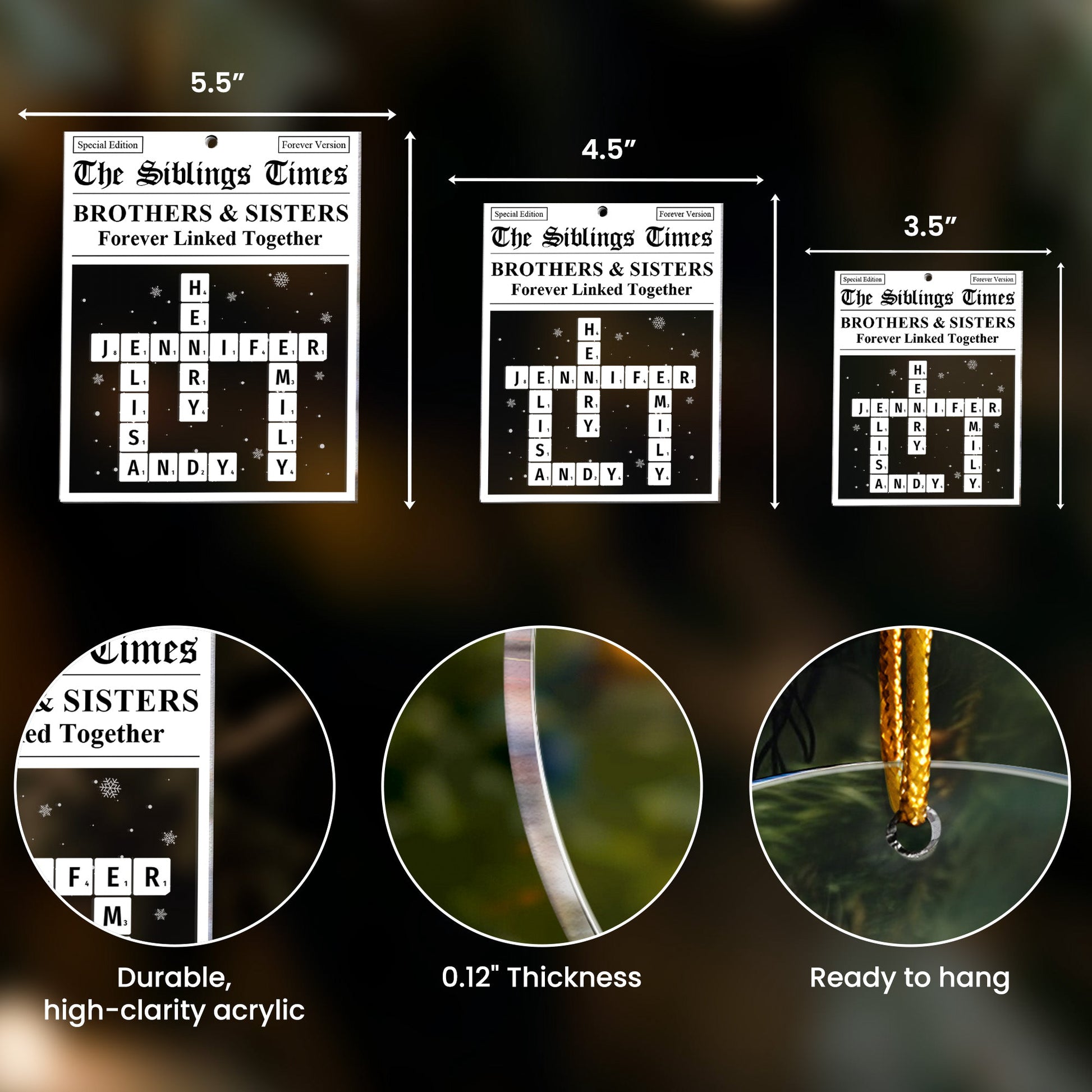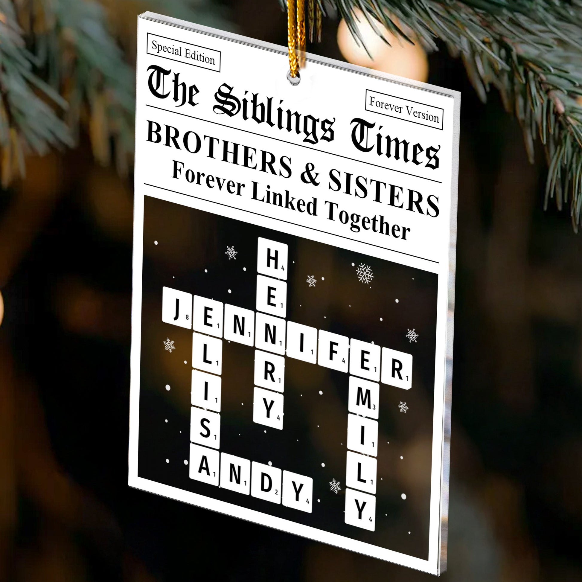 Introducing our Custom Shaped Acrylic Ornament, specially designed for sibling bonding. Named as the "Siblings Times Scrabble Name", this personalized ornament transcends the timeless love between siblings. It vividly captures the engrossing tale of siblinghood, preserving the priceless memories that celebrate the robust bond of brothers and sisters, destined to last forever. Perfect for Christmastime, birthdays, anniversaries, or any occasion when a thoughtful and unique gift is needed.