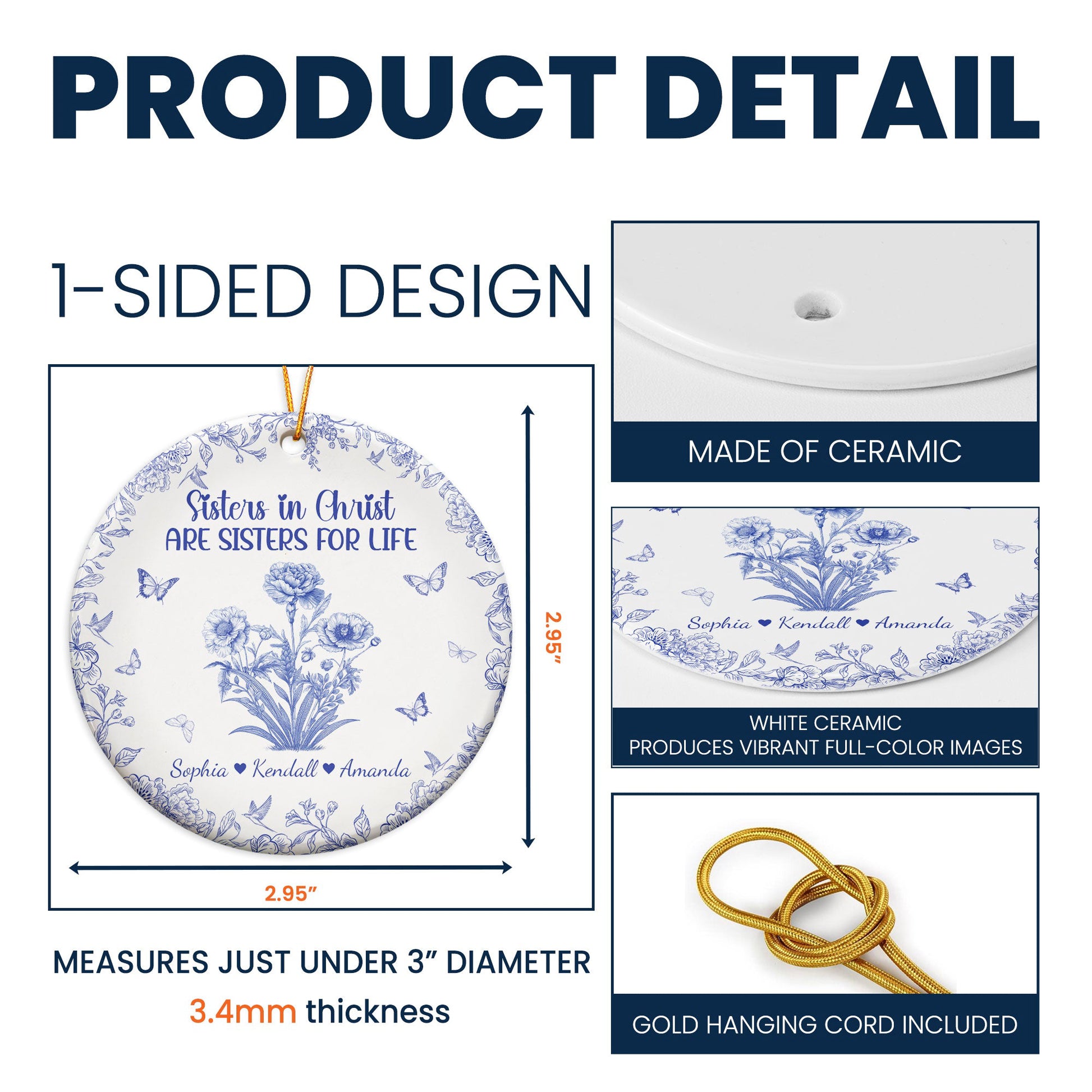Cherish the bond of sisterhood with this uniquely designed Ceramic Ornament. Featuring a delicate Toile De Jouy pattern, this ornament is personalized to celebrate and uplift your spiritual connection with a beloved sister in Christ. As the saying goes, sisters in Christ are sisters for life, and this ornament beautifully resonates with this sentiment. It's perfect for adorning a Christmas tree, using as a wall hanger, or simply as a charming home decor piece to augment the holiday spirit.