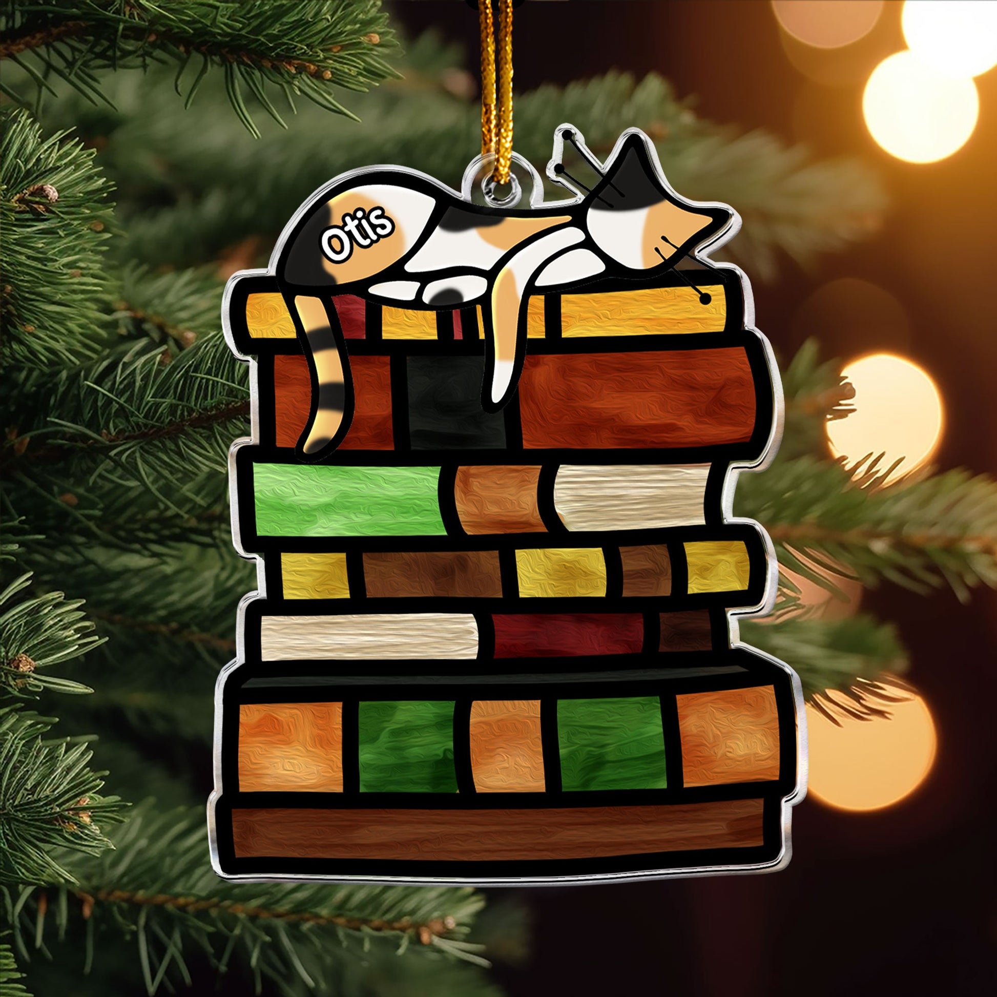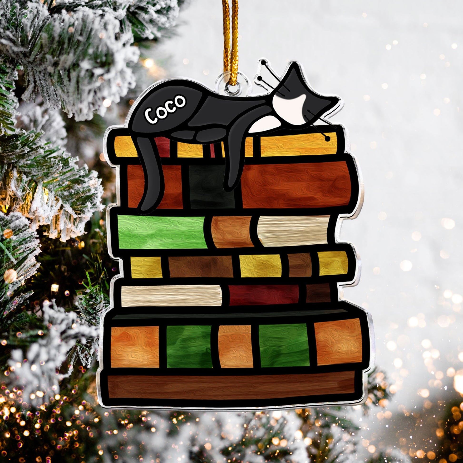 Crafted in a stained-glass style, it adds a touch of artful elegance to your Christmas tree or window, creating a stunning display as the light shines through. Whether you're gifting it to a fellow book and cat lover or adding it to your own collection, this ornament is sure to bring a smile and cozy vibes all winter long.