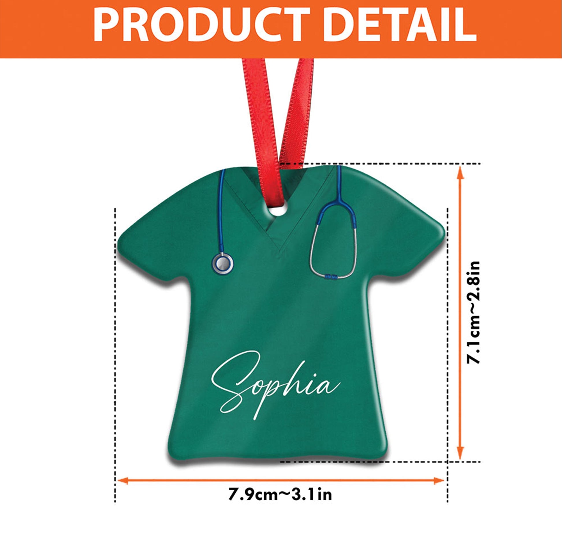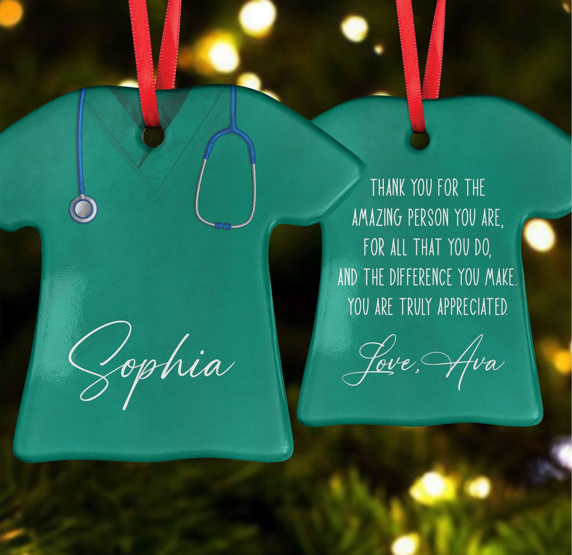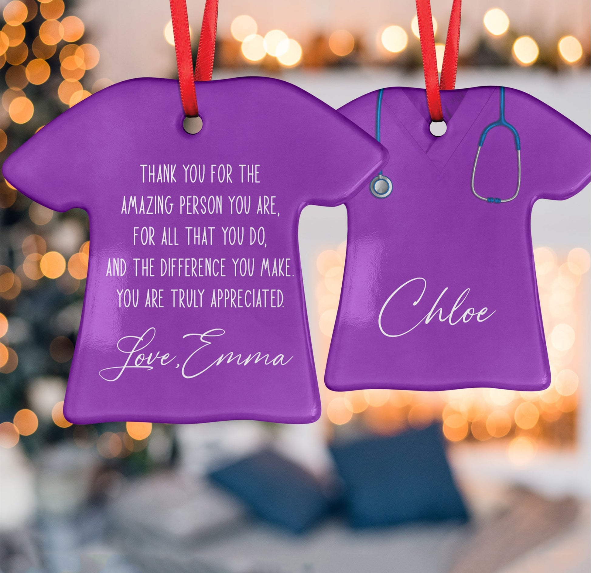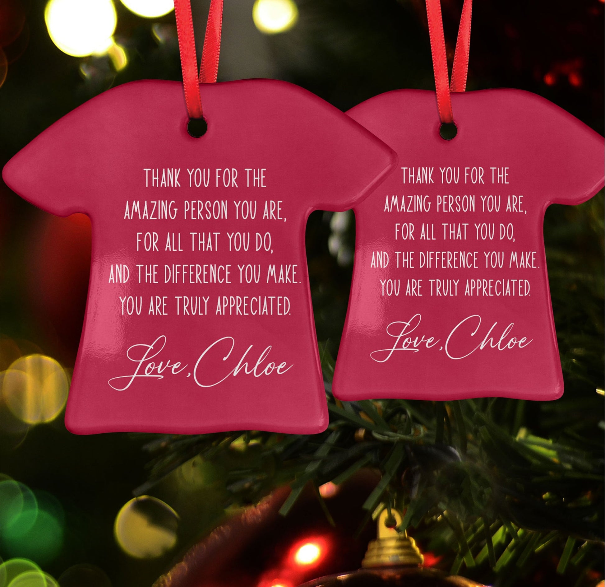 Introducing our heartwarming Personalized Shirt Shaped Ceramic Ornament, a perfect token of appreciation for nurse friends and besties who brighten our lives with laughter and joy. This beautifully crafted ornament carries a heartfelt message: "Never Forget The Difference You Make" With a touch of personalization, this thoughtful gift will forever remind them of the cherished bond you share. Show your gratitude and celebrate the power of friendship with this special keepsake.
