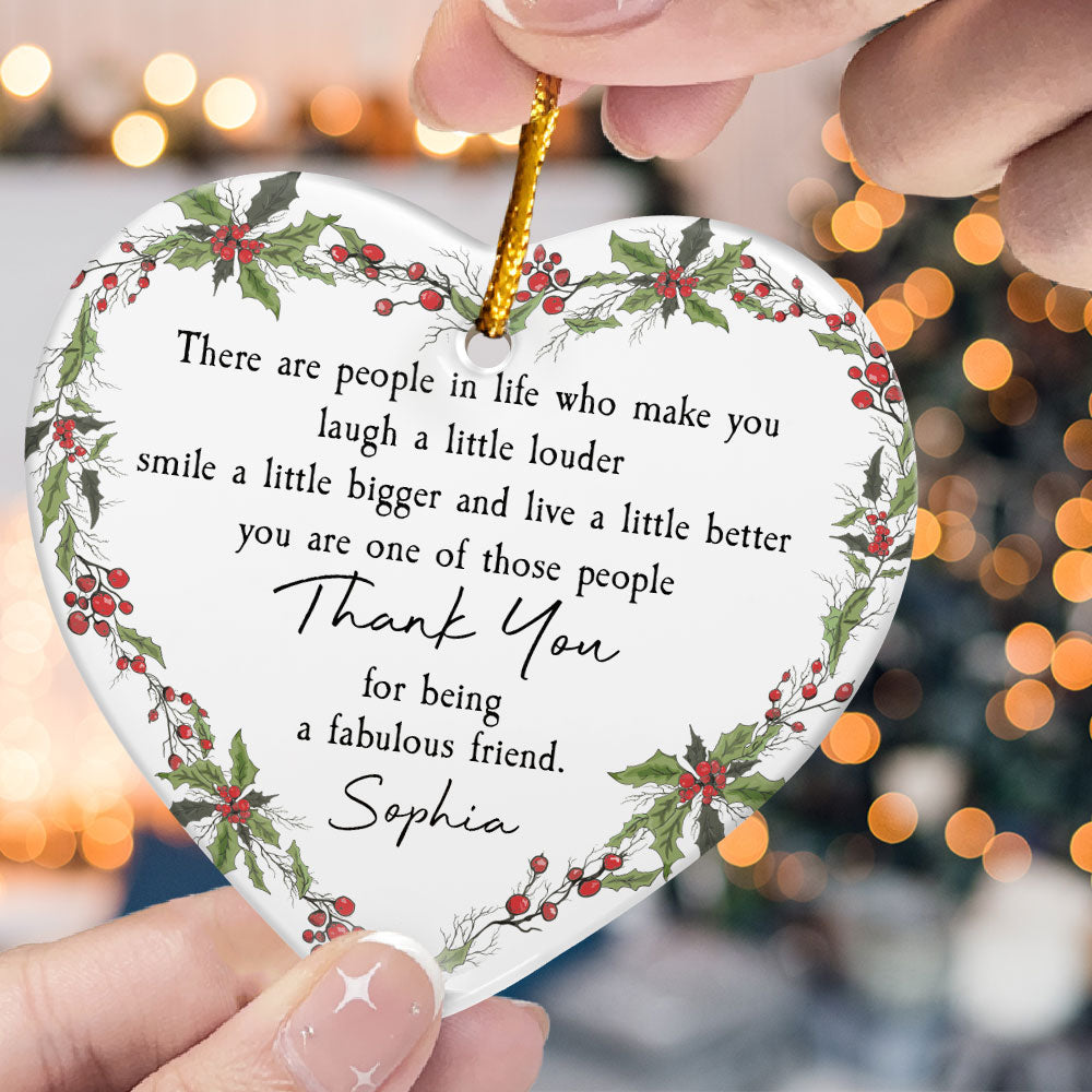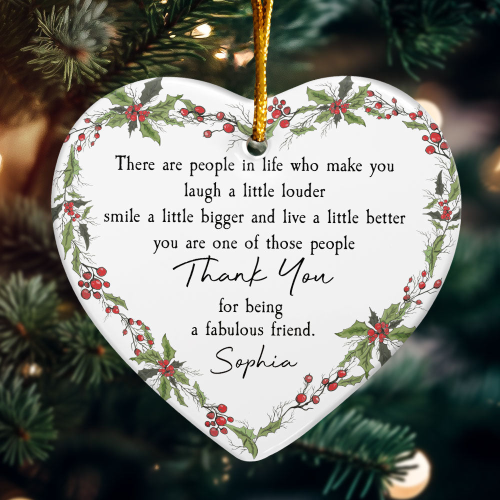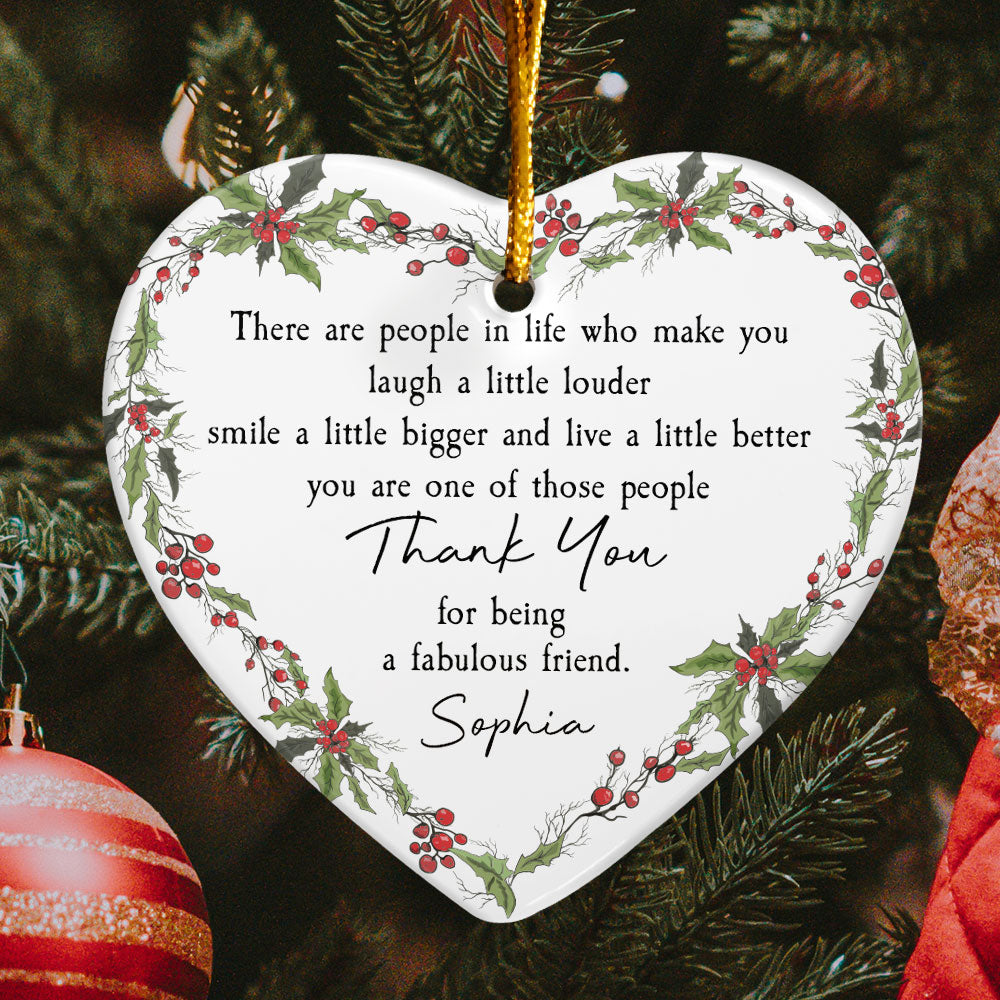 Introducing our heartwarming "Thank You - Personalized Heart Shaped Ceramic Ornament," a perfect token of appreciation for friends and besties who brighten our lives with laughter and joy. This beautifully crafted ornament carries a heartfelt message: "There Are People In Life Who Make You Laugh A Little Louder, Smile A Little Bigger, And Live A Little Better. You Are One Of Those People. Thank You For Being A Fabulous Friend." With a touch of personalization, this thoughtful gift will forever remind them of the cherished bond you share. Show your gratitude and celebrate the power of friendship with this special keepsake.