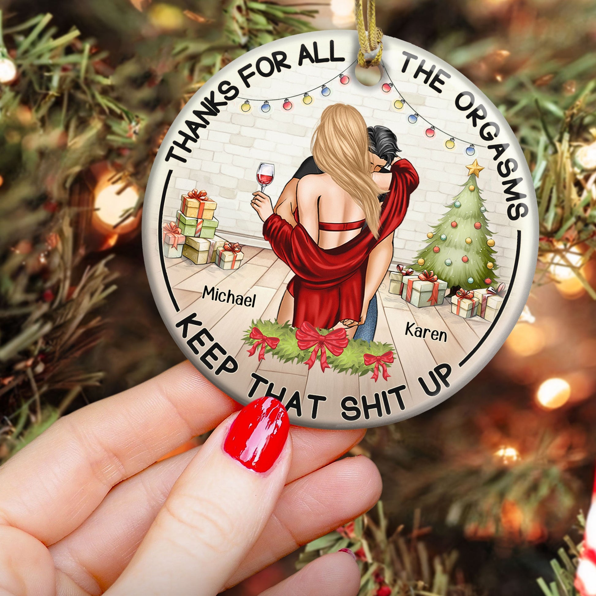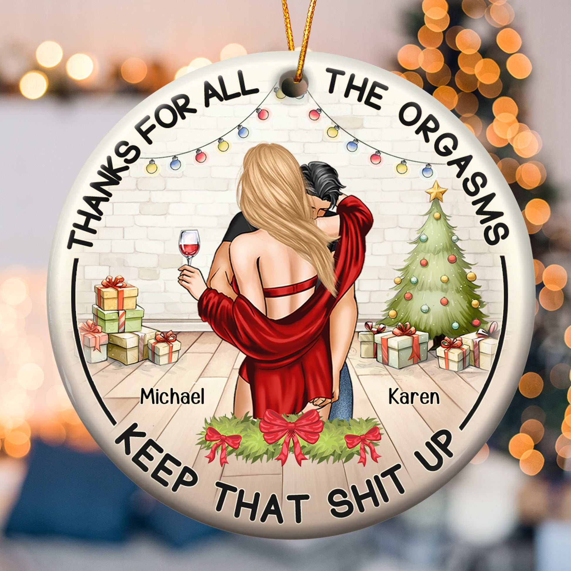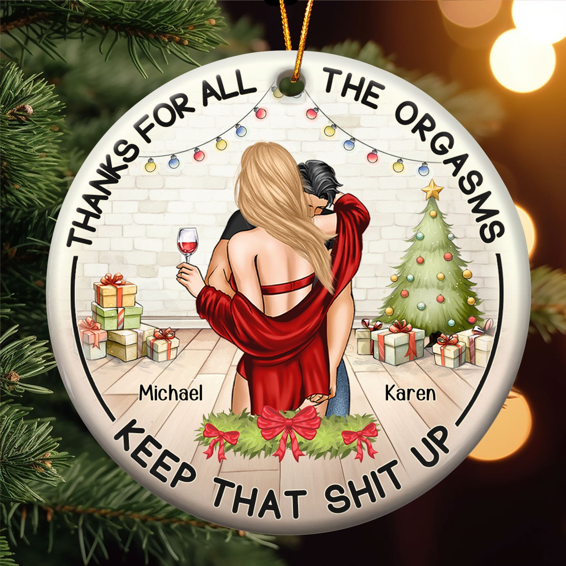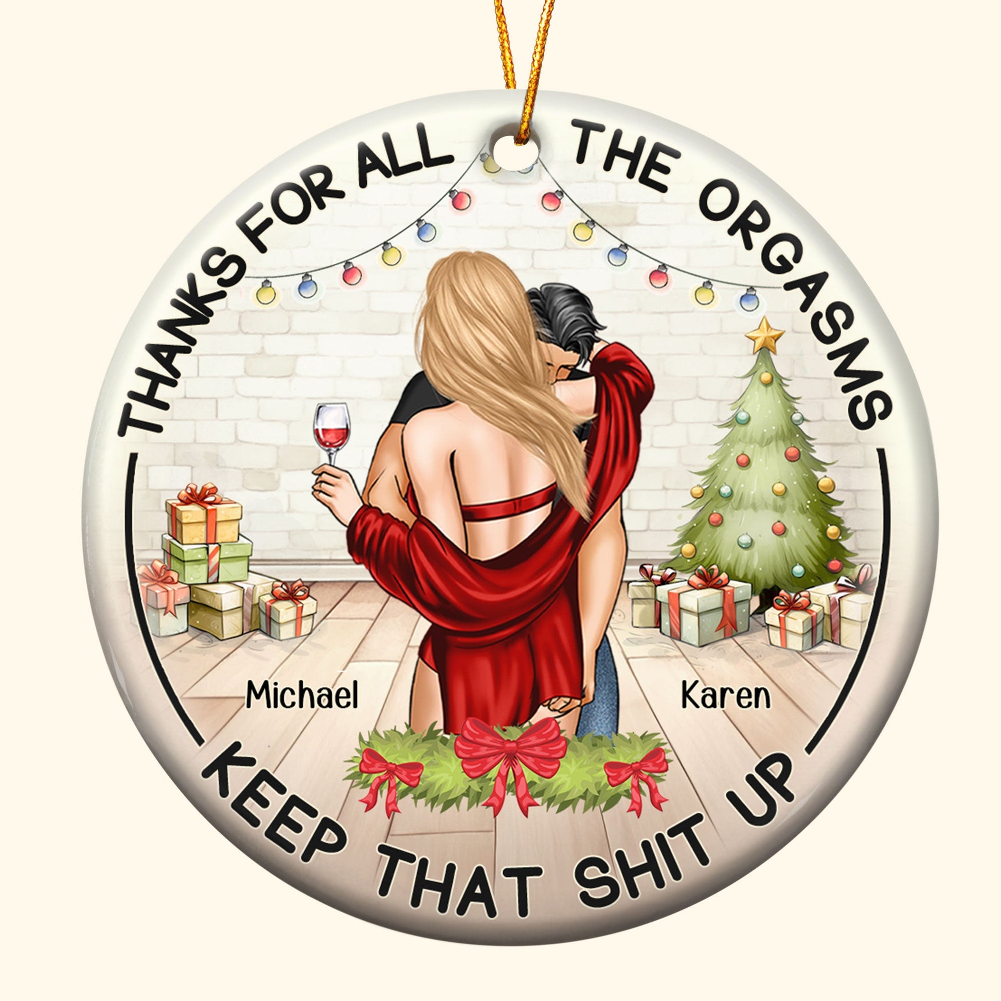 Celebrate your love with this Thanks For All The Orgasms Gift For Couples - Personalized Ceramic Ornament. This 2024 christmas couples ornament is a perfect christmas gift ornament decorations for husband from wife, or for your boyfriend, girfriend. Commemorate your first Christmas as a couple or your anniversary christmas together, to capture the joy of this special milestone. Add a personal touch with our ornament, where you customize to make it a truly unique and sentimental keepsake.