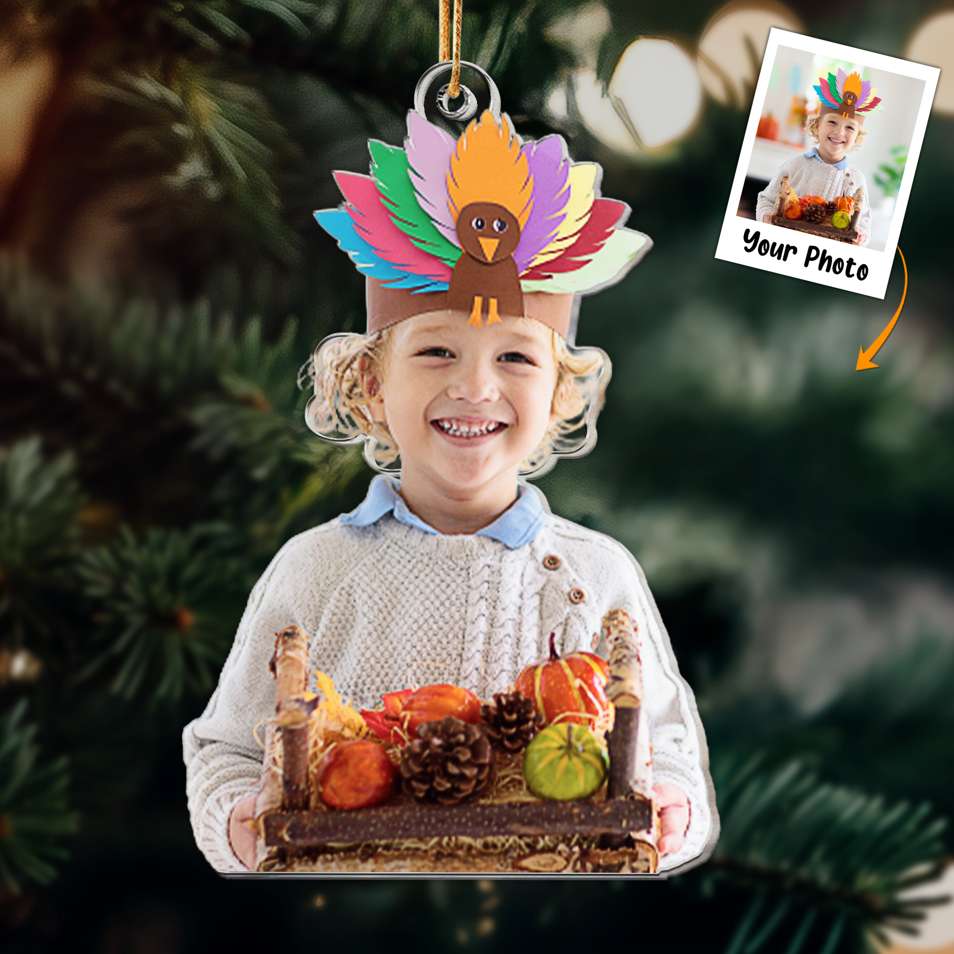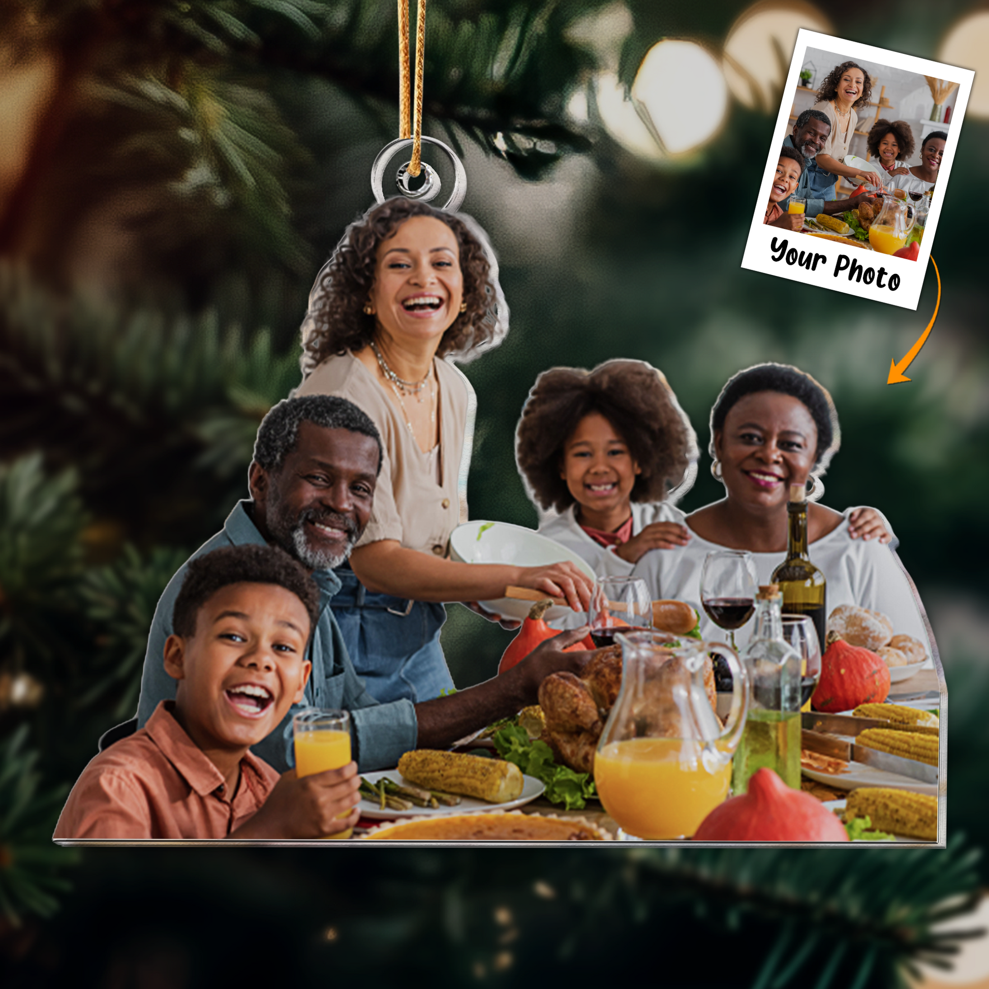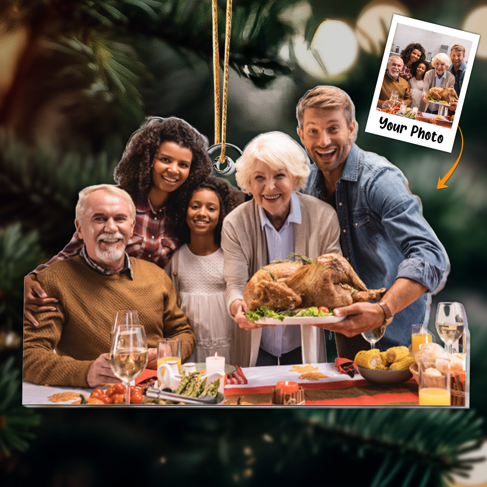 Introducing our custom-shaped photo ornament, a heartwarming keepsake that beautifully captures the essence of your family gathering on Thanksgiving Day. This unique ornament serves as a cherished memento and a thoughtful gift for grandparents, parents, and kids alike, preserving those precious moments spent together.