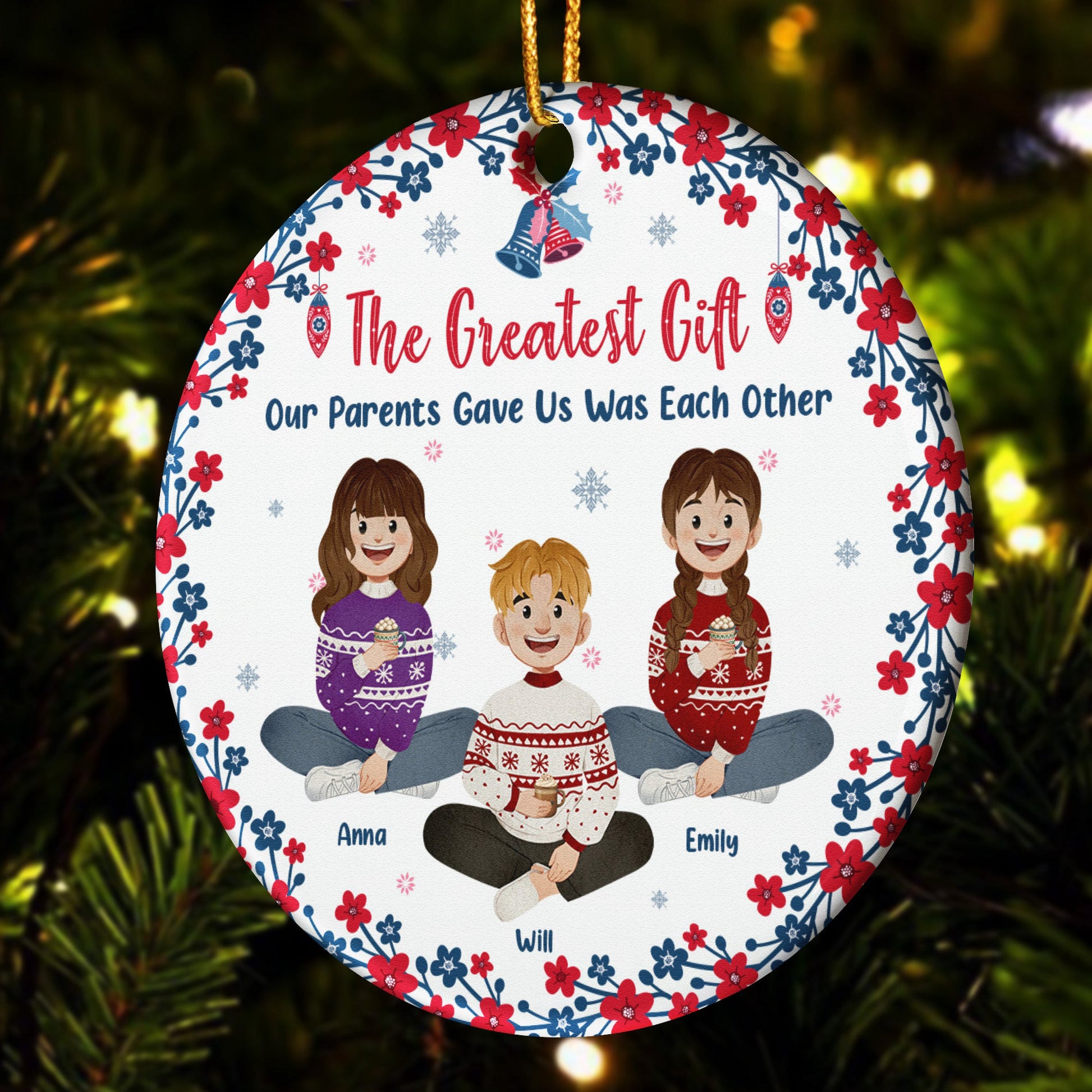 Introducing the beautifully crafted Ceramic Ornament titled "The Greatest Gift Our Parents Gave Us, Folk Art". Designed to celebrate the intimate bond between siblings, this personalized ornament bears a heartfelt tribute to the lifelong connection that brothers and sisters share. This makes it a truly wonderful gift for your sister or sibling, encapsulating a testament to the love your parents have given by gifting each other to you. Festive season like Christmas becomes an opportune moment to express this bond, although this sentiment transcends seasons and occasions; making it a perfect choice for anniversaries, birthdays, or just a random day to show your love.