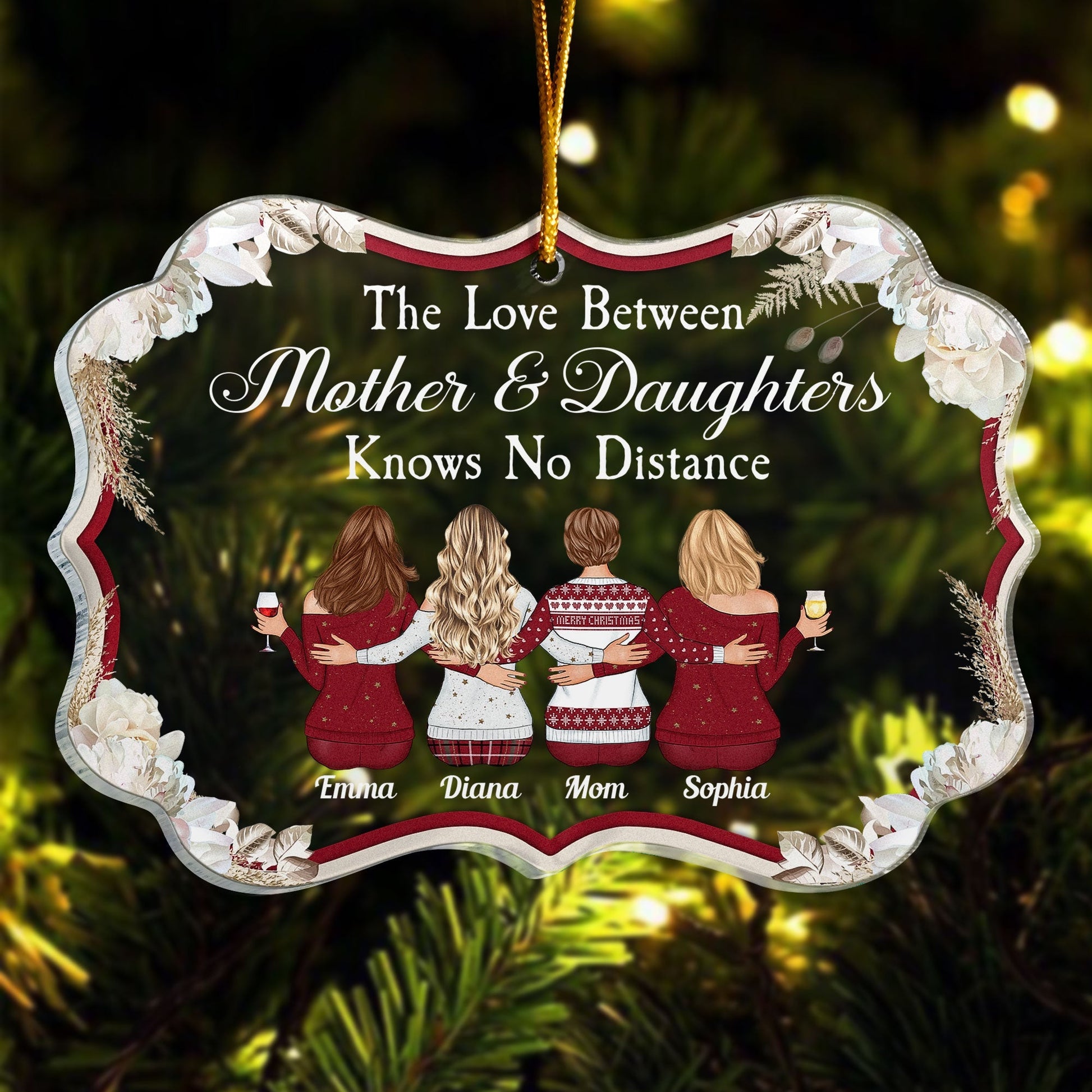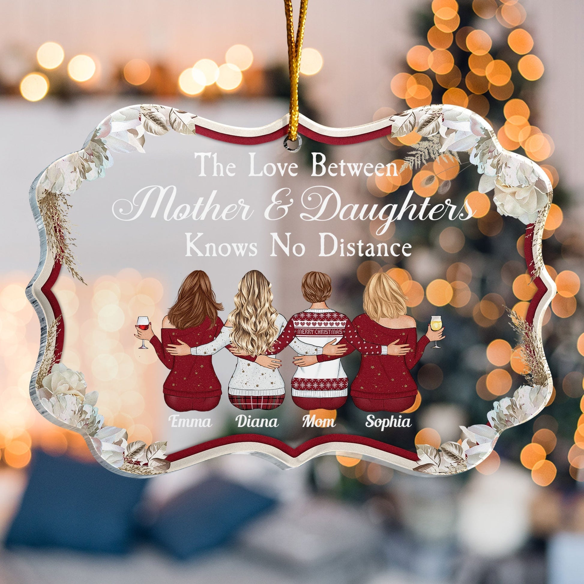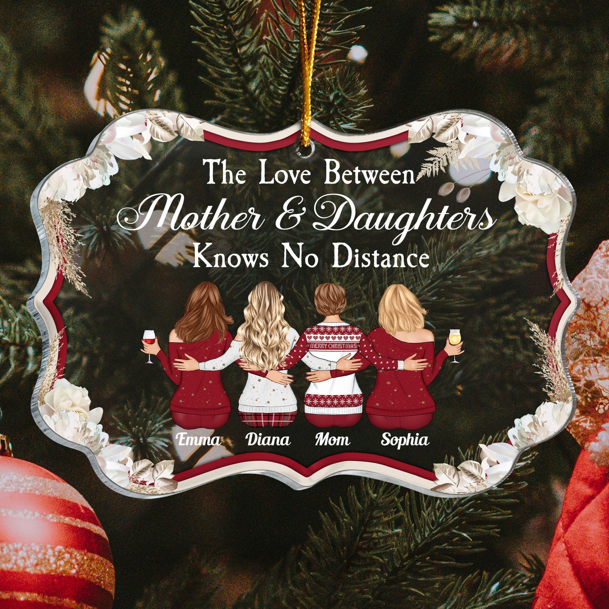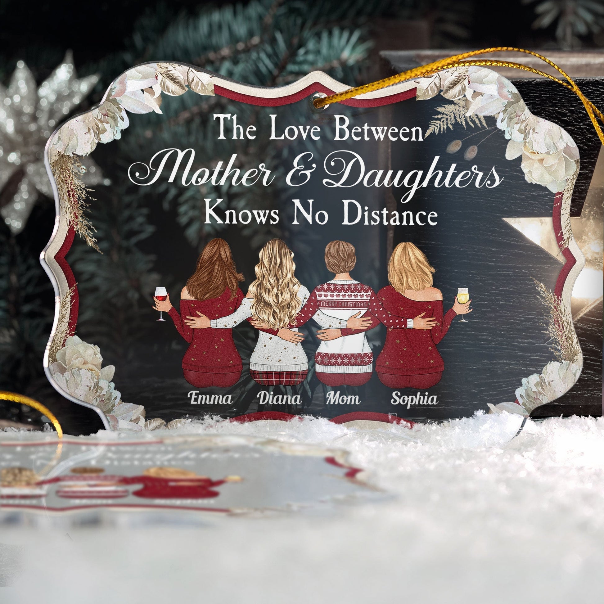 The ornament features a heartwarming quote that says “The Love Between Mother & Daughter Knows No Distance”. This is a perfect way to express your love and gratitude for your mom. It is also a way of acknowledging the challenges and the joys of being apart from her. The ornament also has part of customized characters as mom and daughters. You can choose from different hairstyles, skin tones, outfits, and accessories to make a cartoon-like representation of you and your mom. You can also customize the ornament with your name and your mom’s name.