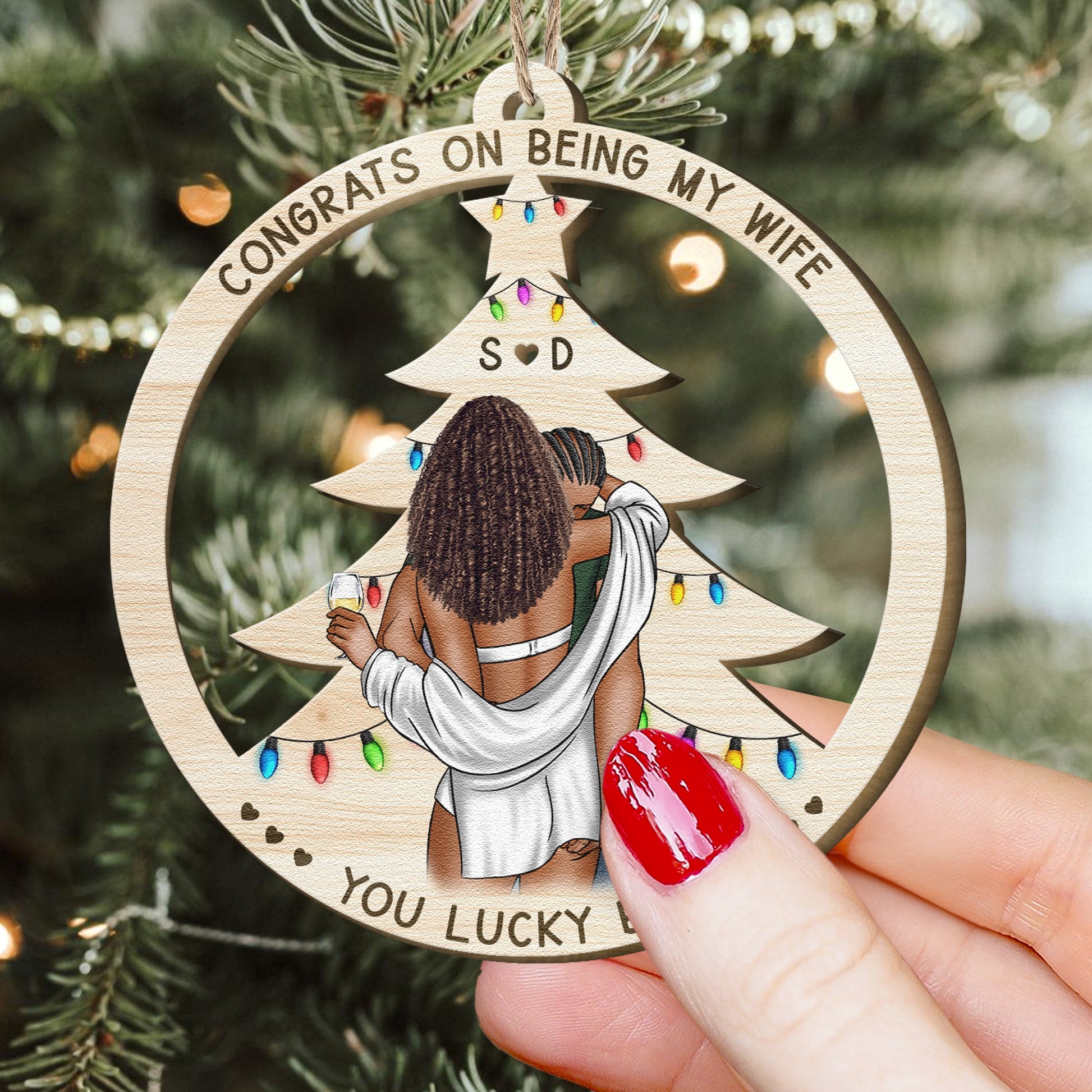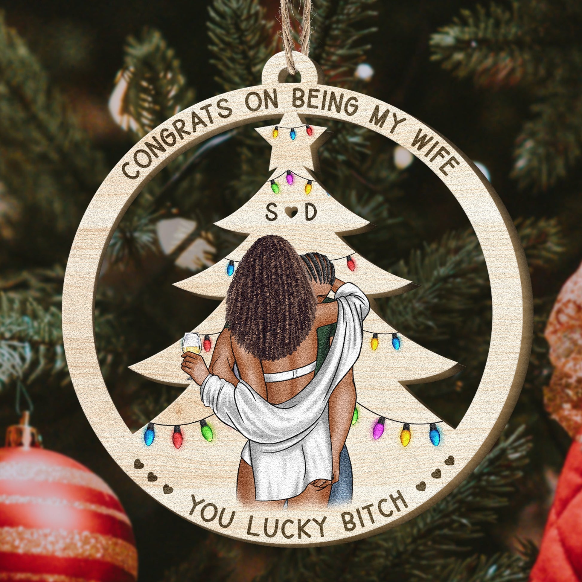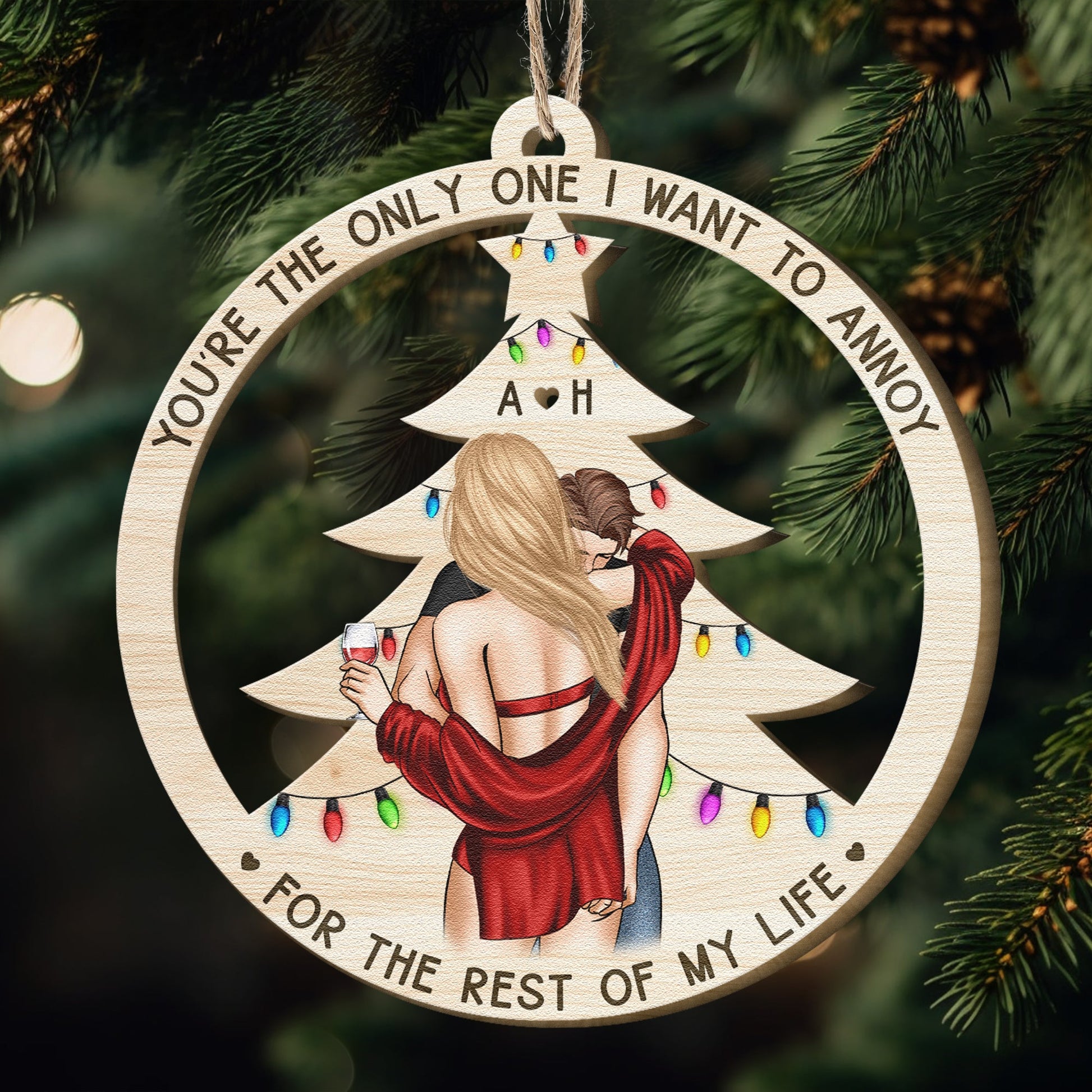 Celebrate this Christmas with a touch of humor and love with our personalized couple's ornament. Featuring a cozy, intimate illustration of a couple sharing a festive moment, this ornament is perfect for those who enjoy a playful and light-hearted connection. The ornament is engraved with the charming phrase, "You're the only one I want to annoy for the rest of my life," making it a memorable and unique gift for your significant other. Hang it on your Christmas tree to symbolize the joy, warmth, and lasting bond you share with your loved one. Ideal for couples who cherish both love and laughter, this ornament will be a cherished keepsake for years to come.