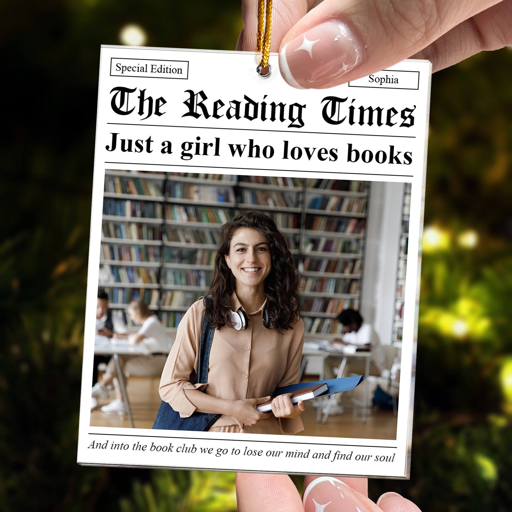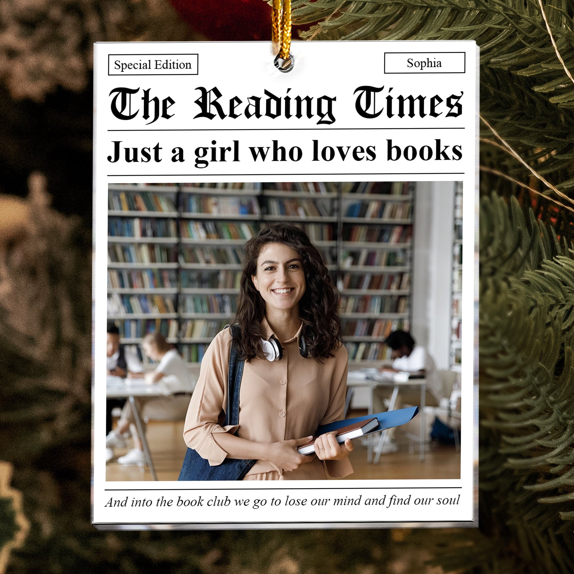 Delight the book lover in your life with our Personalized Custom Photo Ornament, styled after the iconic New York Times theme. Perfect for friends, daughters, or anyone who adores reading, this ornament features a cherished photo and a customizable "headline" celebrating their love for books, storytelling, and literary adventures.