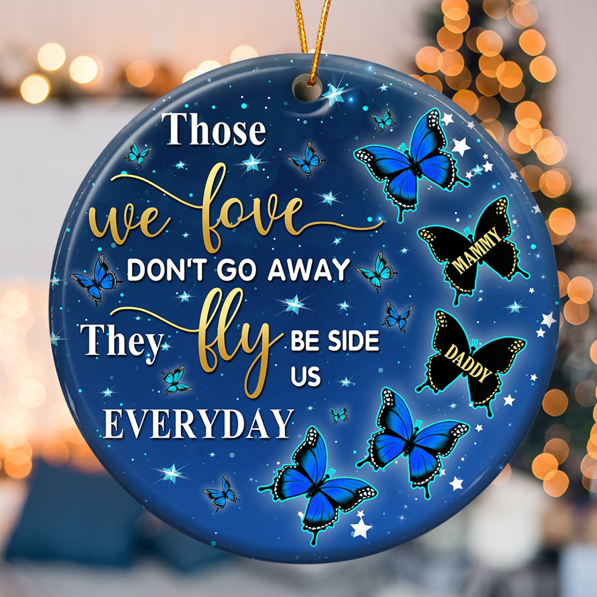 The ornament features a beautiful and heartfelt message that says “Those we love don’t go away, they fly beside us everyday”. The ornament also has a butterfly design that represents your family member who passed away. You can customize the butterfly with their name.