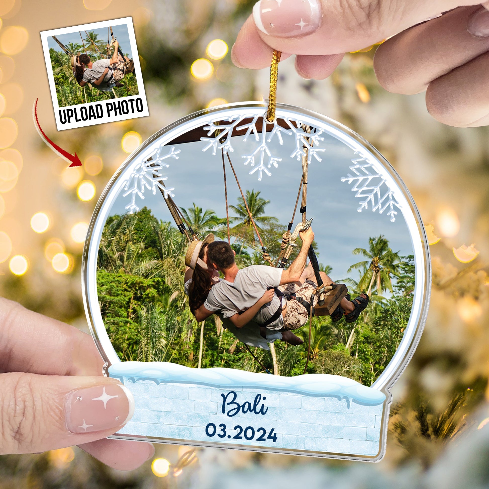 Celebrate your family's growth and new beginnings with a special custom ornament version for Christmas. This ornament can be personalized with the photo and location of your family's vacations. Kids and parents will adore watching these beautiful custom ornament on the Christmas tree.