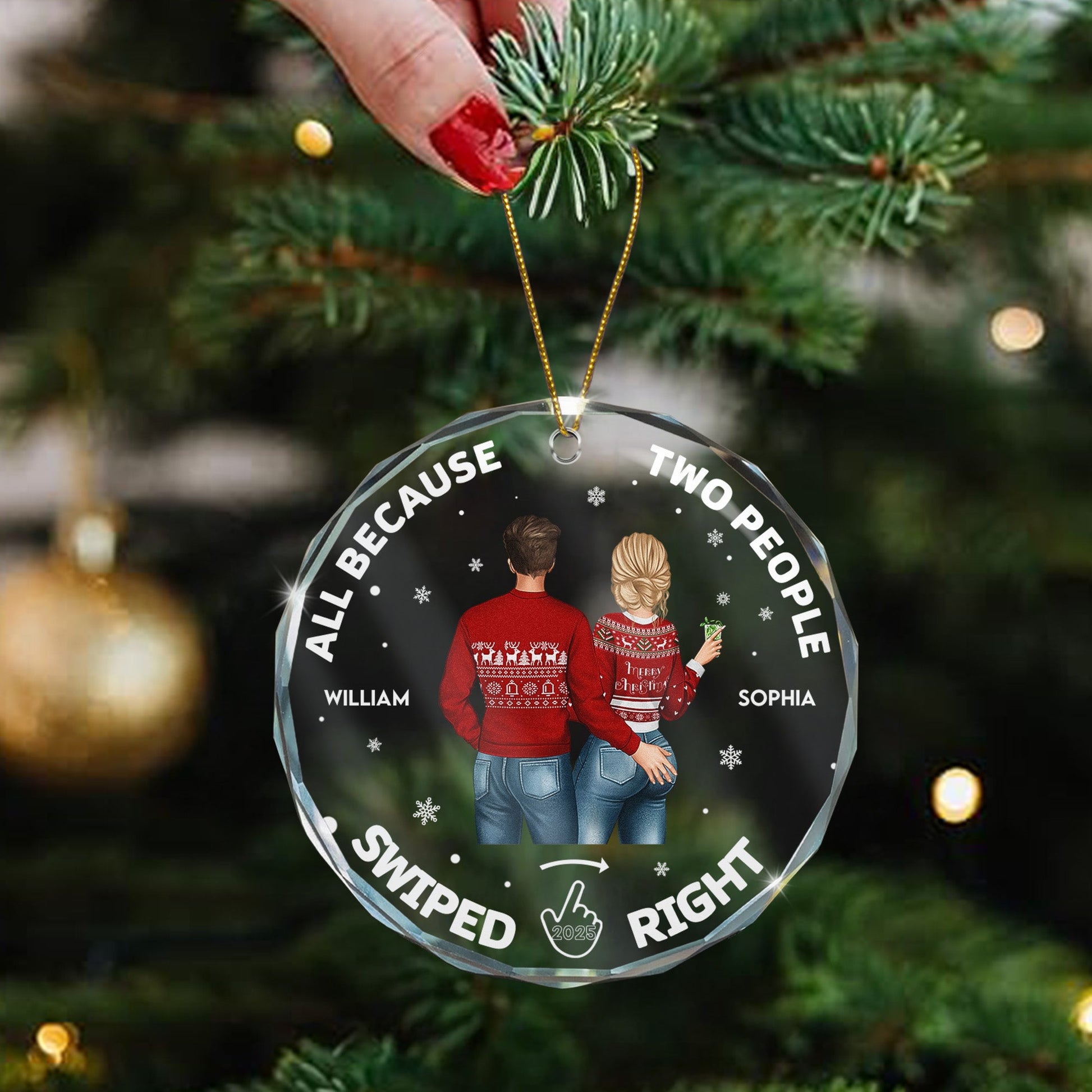 Perfect for anniversaries, Christmas, or any occasion where love is celebrated, this beautiful ornament can grace the branches of your Christmas tree or adorn your living spaces, sharing its story with everyone. The subtle message, alluding to the chance act of two people swiping right that brought them together is discreetly woven into the design. The ornament serves as a love-filled, sentimental gift, sure to tug at the heartstrings of your better half. Don't miss this chance to sparkle your love story with our Personalized Glass Ornament. Order now to gift or enjoy it yourself!