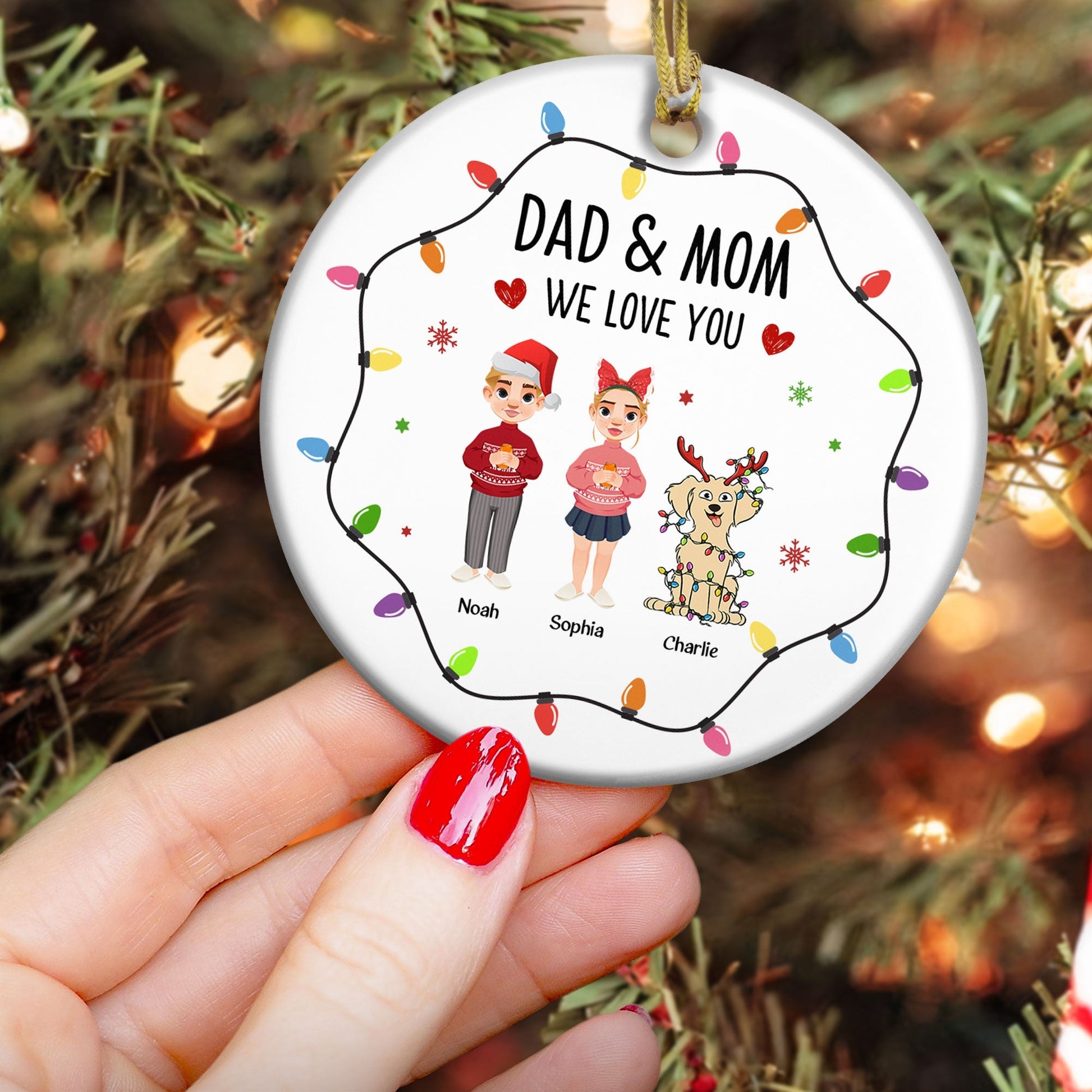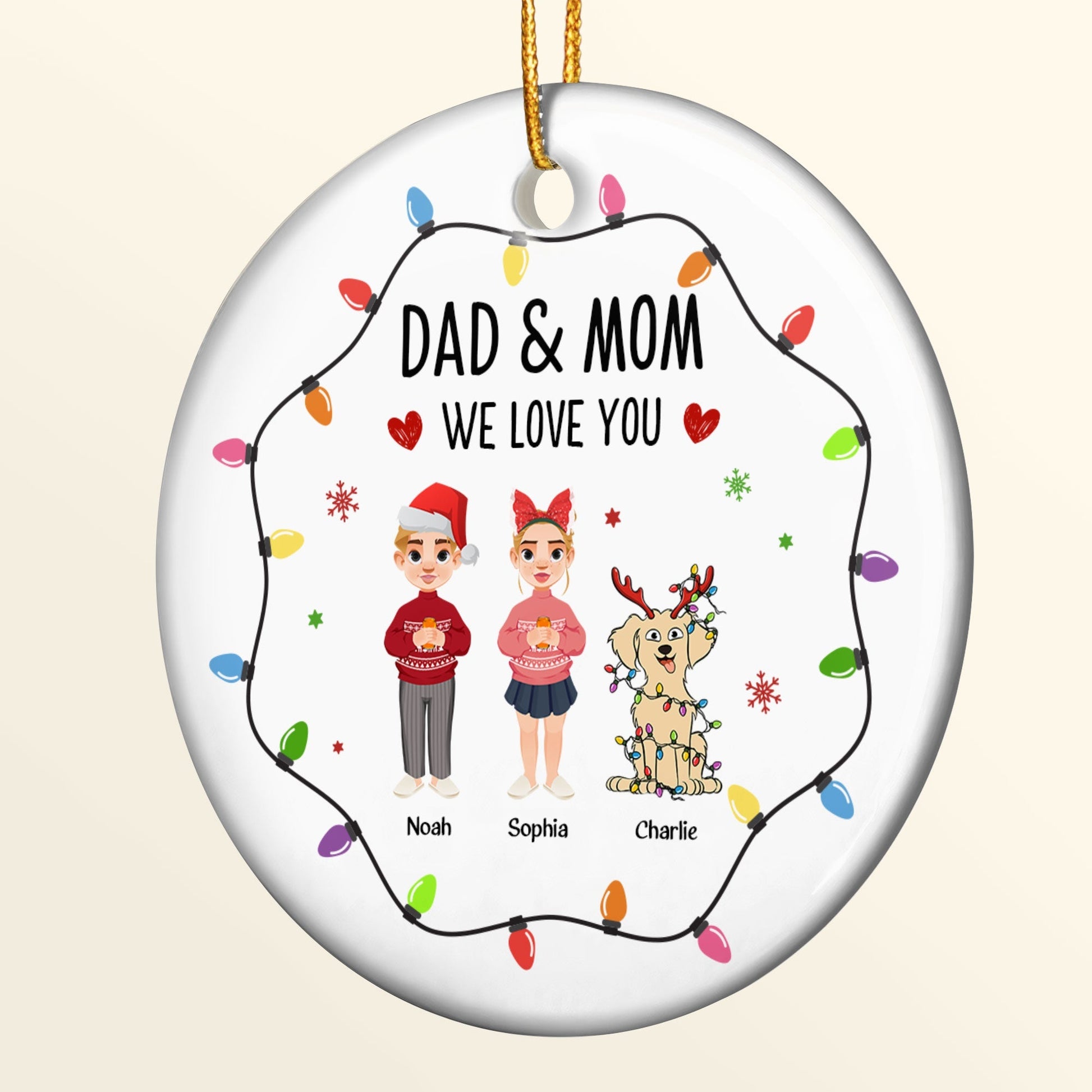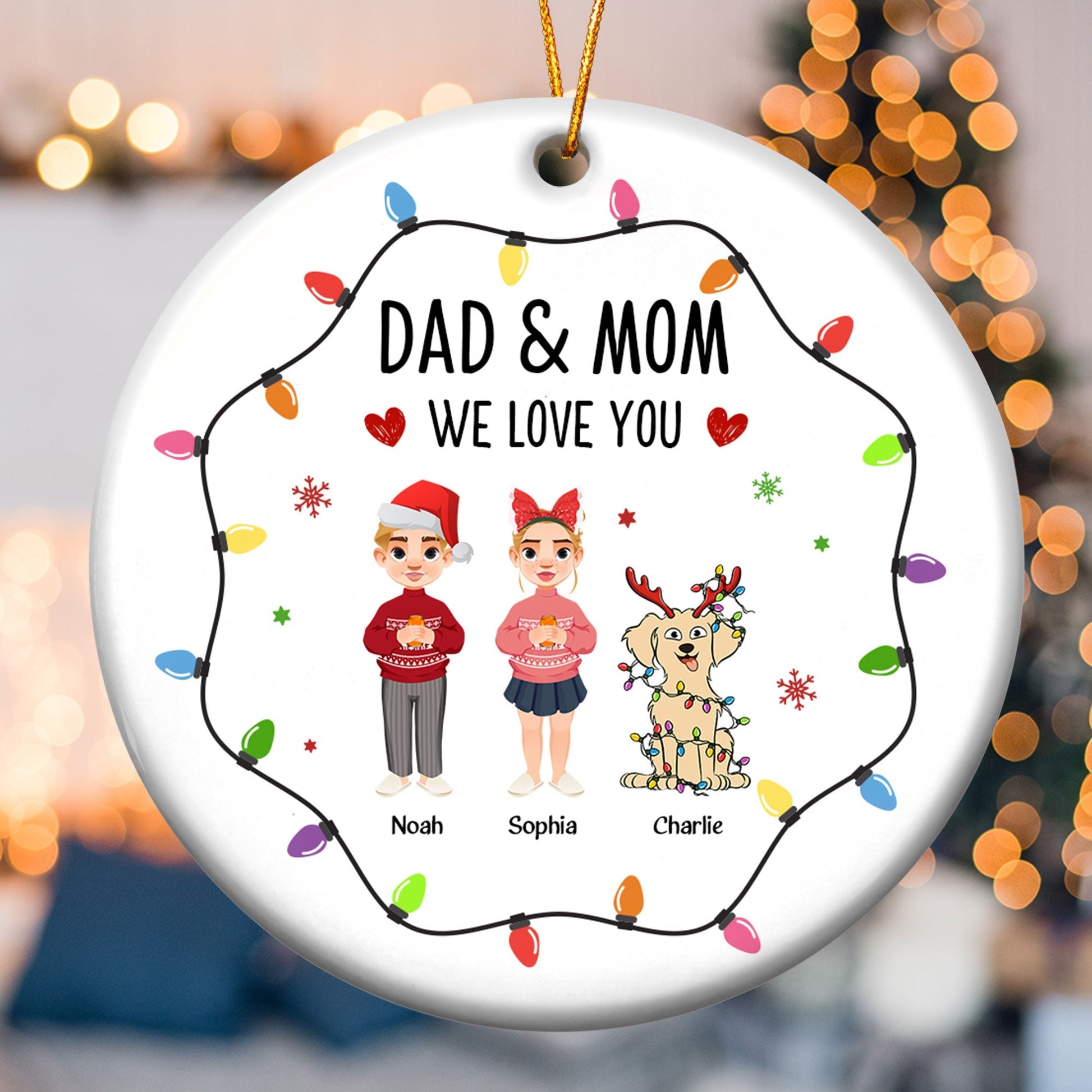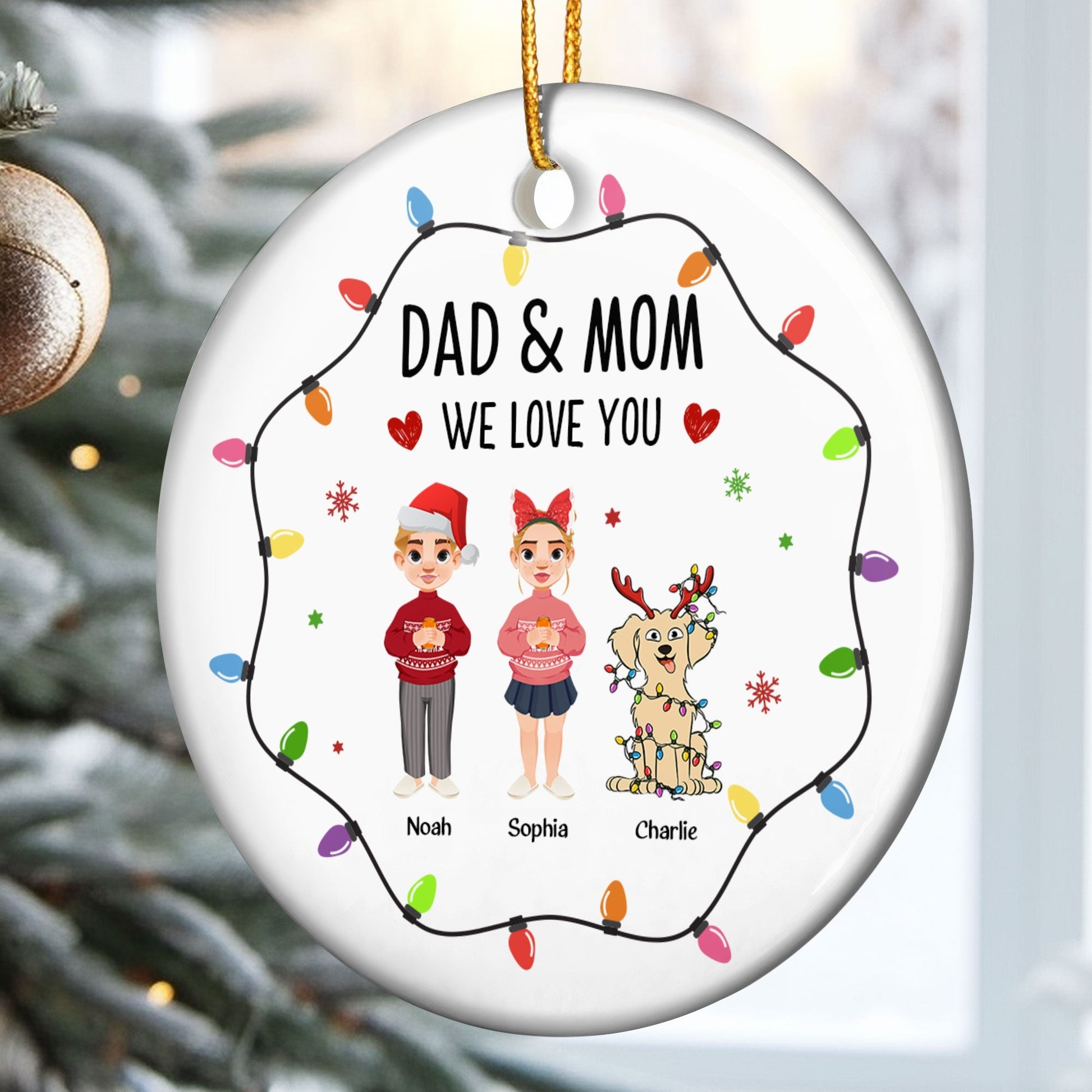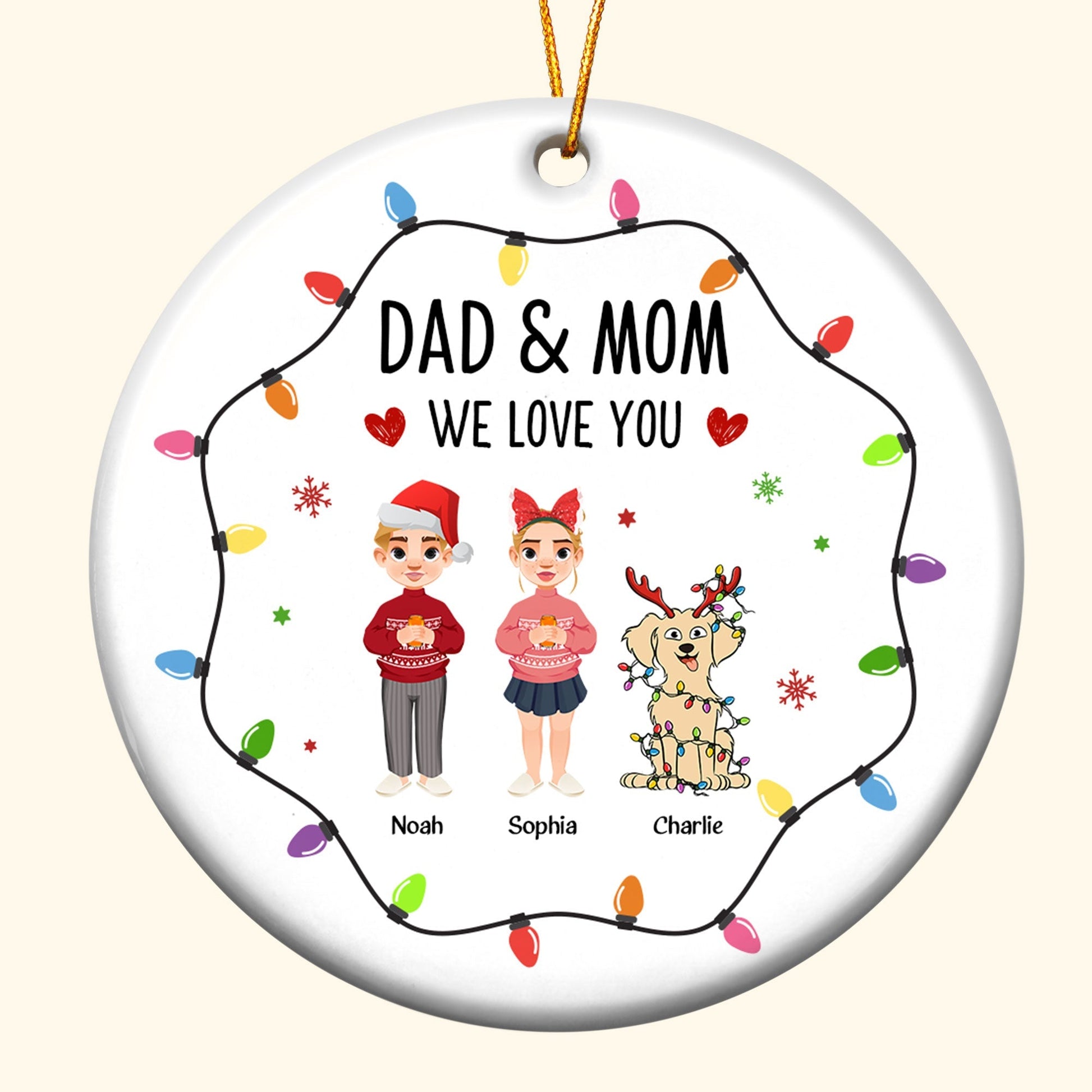 Introducing our heartwarming Personalized Ceramic Ornament, a perfect Christmas gift to express love and appreciation for dads, moms, and grandpas, auntie and family members. This ornament carries a special message: "We Love You," making it a thoughtful keepsake that will warm their hearts during the holiday season and beyond.