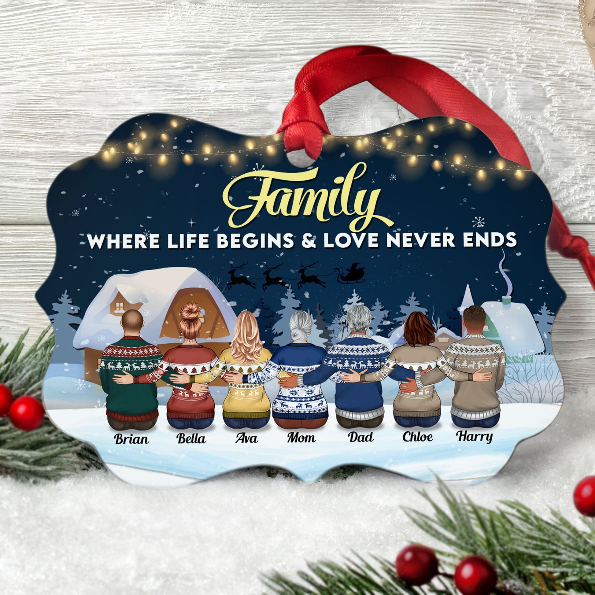 Where Life Begins And Love Never Ends - Personalized Aluminum Ornament - Christmas, Loving Gift For Family Members, Mom, Dad, Brothers, Sisters