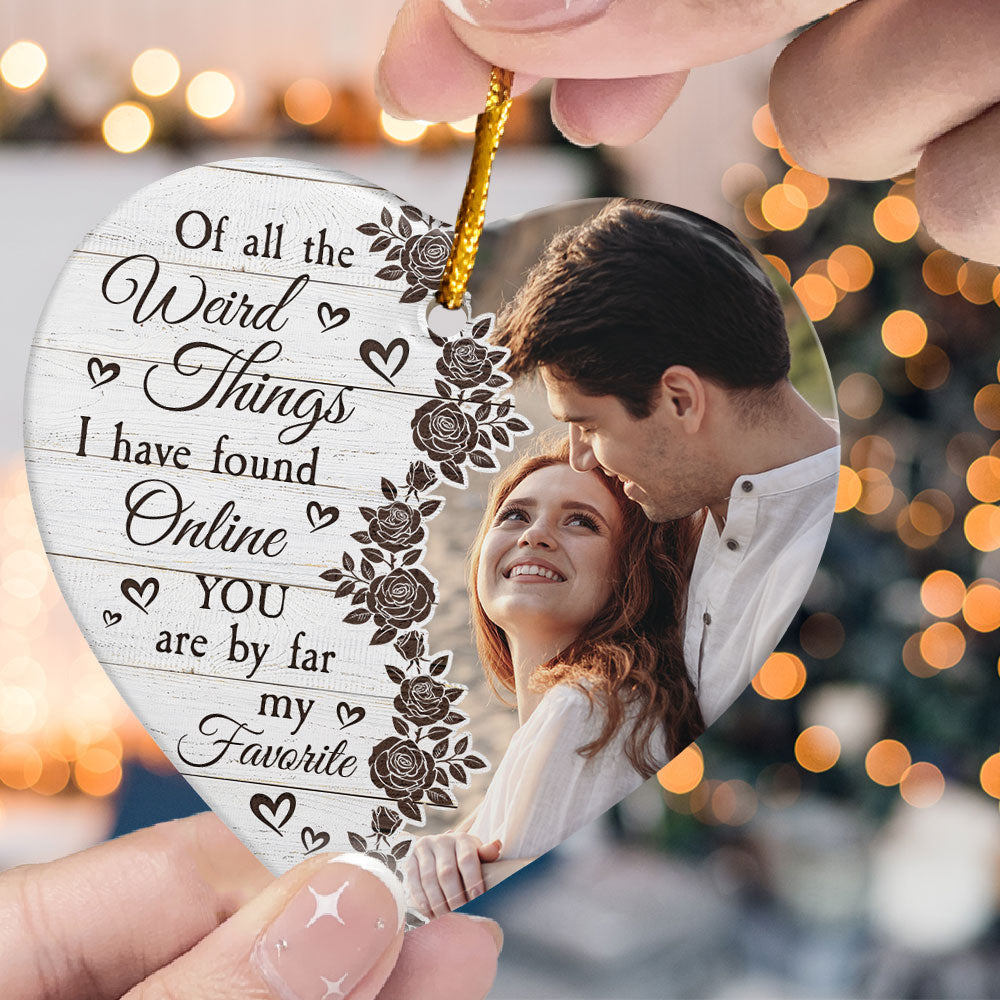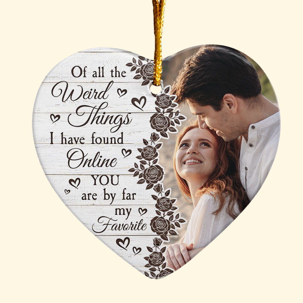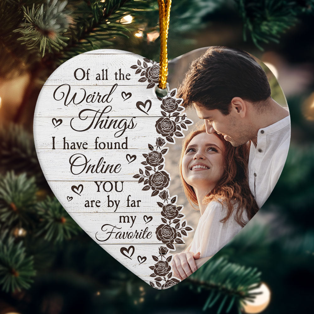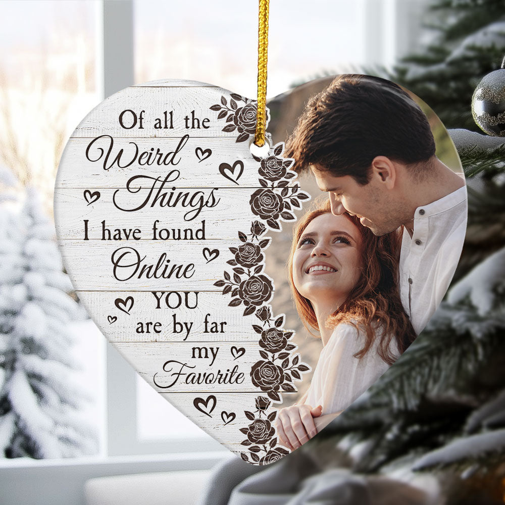 Celebrate your love with this Couples You Are My Favorite - Personalized Ceramic Photo Ornament. This 2023 Christmas couples ornament is a perfect Christmas gift ornament decoration for husband from wife, or for your boyfriend, or girlfriend. Commemorate your first Christmas as a couple or your anniversary Christmas together, to capture the joy of this special milestone. Add a personal touch with our ornament, which you customize to make it a truly unique and sentimental keepsake. Embrace the spirit of the season with our personalized options for couple's Christmas tree decorations ornament, spreading warmth and happiness throughout your home this Christmas. It's a heartfelt gift that symbolizes the love that has grown since the day you became a couple and a cherished reminder of your journey together. Perfect Christmas gift for couples, newlywed couples, husband, wife, boyfriend, girlfriend. Or an ideal present for son-in-law or daughter-in-law this Xmas.